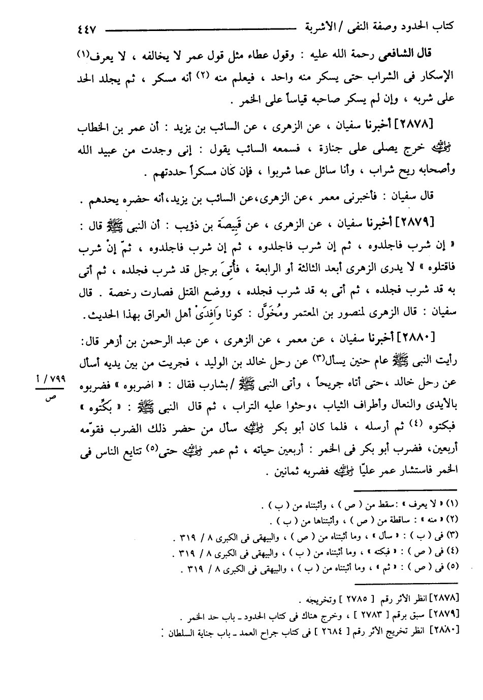 قَالَ الشَّافِعِيُّ : وَقَوْلُ عَطَاءٍ مِثْلُ قَوْلِ عُمَرَ لاَ يُخَالِفُهُ لاَ يُعْرَفُ الْإِسْكَارُ فِي الشَّرَابِ حَتَّى يَسْكَرَ مِنْهُ وَاحِدٌ فَيُعْلَمَ مِنْهُ أَنَّهُ مُسْكِرٌ ثُمَّ يُجْلَدُ الْحَدَّ عَلَى شُرْبِهِ وَإِنْ لَمْ يُسْكِرْ صَاحِبَهُ قِيَاسًا عَلَى الْخَمْرِ أَخْبَرَنَا سُفْيَانُ عَنْ الزُّهْرِيِّ عَنْ السَّائِبِ بْنِ يَزِيدَ أَنَّ عُمَرَ بْنَ الْخَطَّابِ رضي الله عنه خَرَجَ يُصَلِّي عَلَى جِنَازَةٍ فَسَمِعَهُ السَّائِبُ يَقُولُ إنِّي وَجَدْت مِنْ عُبَيْدِ اللَّهِ وَأَصْحَابِهِ رِيحَ شَرَابٍ وَأَنَا سَائِلٌ عَمَّا شَرِبُوا فَإِنْ كَانَ مُسْكِرًا حَدَدْتهمْ قَالَ سُفْيَانُ فَأَخْبَرَنِي مَعْمَرٍ عَنْ الزُّهْرِيِّ عَنْ السَّائِبِ بْنِ يَزِيدَ أَنَّهُ حَضَرَهُ يَحُدُّهُمْ , أَخْبَرَنَا سُفْيَانُ عَنْ الزُّهْرِيِّ عَنْ قَبِيصَةَ بْنِ ذُؤَيْبٍ أَنَّ النَّبِيَّ - صلى الله عليه وسلم - قَالَ : ? إنْ شَرِبَ فَاجْلِدُوهُ ثُمَّ إنْ شَرِبَ فَاجْلِدُوهُ ثُمَّ إنْ شَرِبَ فَاجْلِدُوهُ ثُمَّ إنْ شَرِبَ فَاقْتُلُوهُ ? لاَ يَدْرِي الزُّهْرِيُّ أَبْعَدَ الثَّالِثَةِ أَوْ الرَّابِعَةِ فَأُتِيَ بِرَجُلٍ قَدْ شَرِبَ فَجَلَدَهُ ثُمَّ أُتِيَ بِهِ قَدْ شَرِبَ فَجَلَدَهُ ثُمَّ أُتِيَ بِهِ قَدْ شَرِبَ فَجَلَدَهُ وَوَضَعَ الْقَتْلَ فَصَارَتْ رُخْصَةً قَالَ سُفْيَانُ قَالَ الزُّهْرِيُّ لِمَنْصُورِ بْنِ الْمُعْتَمِرِ وَمُخَوَّلٍ كُونَا وَافِدَيْ أَهْلِ الْعِرَاقِ بِهَذَا الْحَدِيثِ أَخْبَرَنَا سُفْيَانُ عَنْ مَعْمَرٍ عَنْ الزُّهْرِيِّ عَنْ عَبْدِ الرَّحْمَنِ بْنِ أَزْهَرَ قَالَ : ? رَأَيْت النَّبِيَّ - صلى الله عليه وسلم - عَام حُنَيْنٍ سَأَلَ عَنْ رَحْلِ خَالِدِ بْنِ الْوَلِيدِ فَجَرَيْت مِنْ بَيْنِ يَدَيْهِ أَسْأَلُ عَنْ رَحْلِ خَالِدٍ حَتَّى أَتَاهُ جَرِيحًا وَأُتِيَ النَّبِيَّ - صلى الله عليه وسلم - وَسَلَّمَ بِشَارِبٍ فَقَالَ اضْرِبُوهُ فَضَرَبُوهُ بِالْأَيْدِي وَالنِّعَالِ وَأَطْرَافِ الثِّيَابِ وَحَثَوْا عَلَيْهِ التُّرَابَ ثُمَّ قَالَ النَّبِيُّ - صلى الله عليه وسلم - بَكِّتُوهُ فَبَكَّتُوهُ ثُمَّ أَرْسَلَهُ ? فَلَمَّا كَانَ أَبُو بَكْرٍ رضي الله تعالى عنه سَأَلَ مَنْ حَضَرَ ذَلِكَ الضَّرْبَ فَقَوَّمَهُ أَرْبَعِينَ فَضَرَبَ أَبُو بَكْرٍ فِي الْخَمْرِ أَرْبَعِينَ حَيَاتَهُ ثُمَّ عُمَرُ رضي الله تعالى عنه حَتَّى تَتَابَعَ النَّاسُ فِي الْخَمْرِ فَاسْتَشَارَ عُمَرُ عَلِيًّا رضي الله تعالى عنه فَضَرَبَهُ ثَمَانِينَ .@