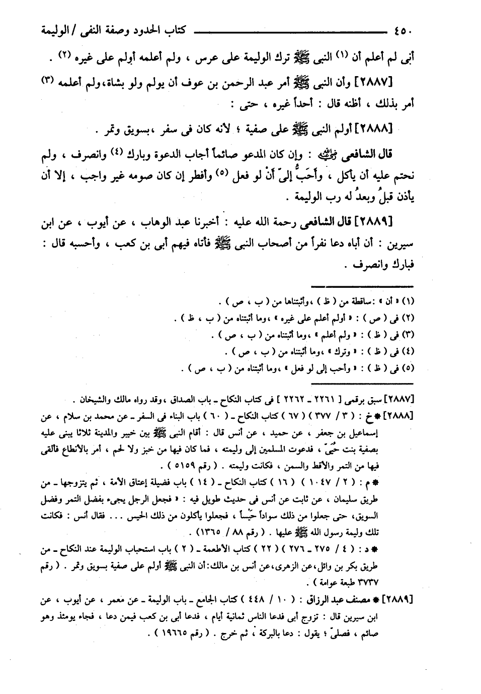 أَنِّي لَمْ أَعْلَمْ أَنَّ النَّبِيَّ - صلى الله عليه وسلم - تَرَكَ الْوَلِيمَةَ عَلَى عُرْسٍ وَلَمْ أَعْلَمْهُ أَوْلَمَ عَلَى غَيْرِهِ . وَأَنَّ : ? النَّبِيَّ - صلى الله عليه وسلم - أَمَرَ عَبْدِ الرَّحْمَنِ بْنِ عَوْفٍ أَنْ يُولِمَ وَلَوْ بِشَاةٍ ? وَلَمْ أَعْلَمْهُ أَمَرَ بِذَلِكَ أَظُنُّهُ قَالَ أَحَدًا غَيْرَهُ حَتَّى : ? أَوْلَمَ النَّبِيُّ - صلى الله عليه وسلم - عَلَى صَفِيَّةَ لِأَنَّهُ كَانَ فِي سَفَرٍ بِسَوِيقِ وَتَمْرٍ ? .