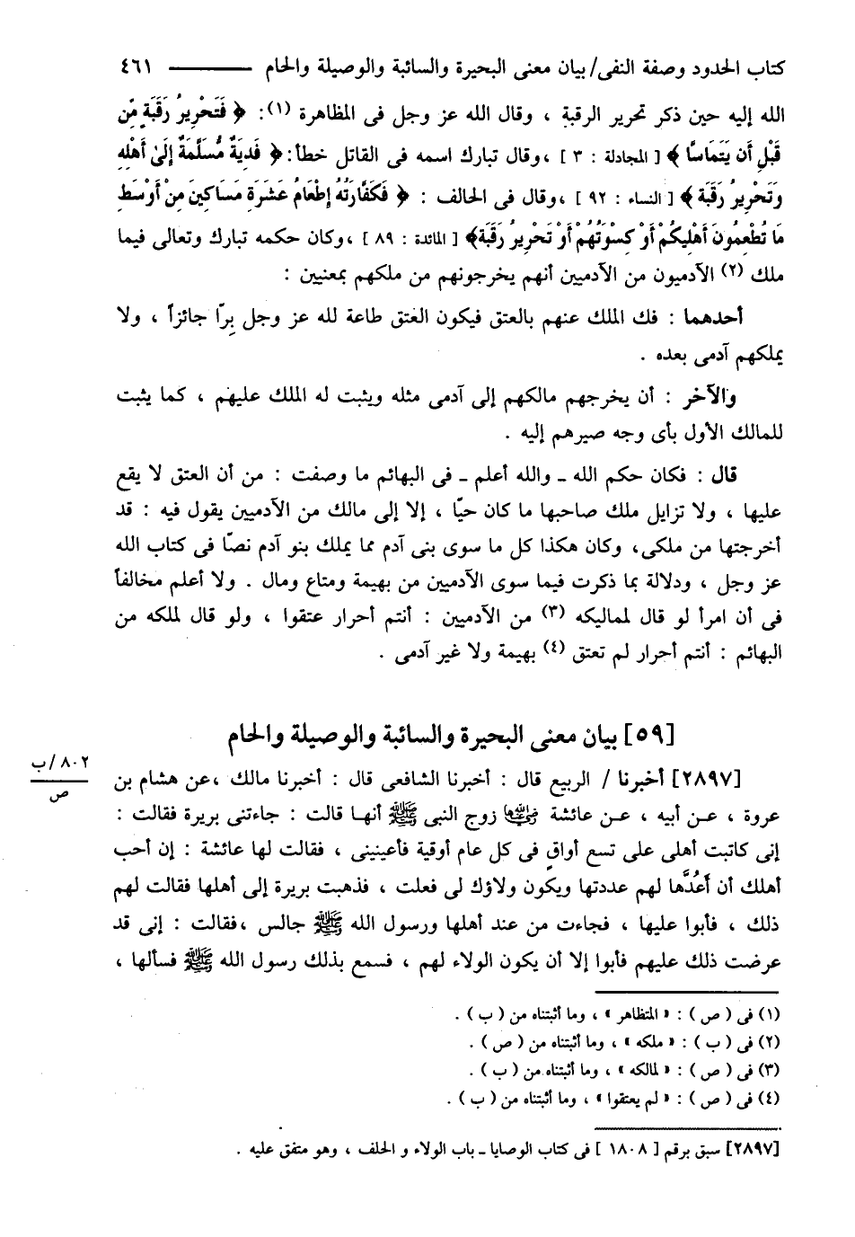 بَيَانُ مَعْنَى الْبَحِيرَةِ السَّائِبَةِ الْوَصِيلَةِ وَالْحَامِ أَخْبَرَنَا الرَّبِيعُ قَالَ أَخْبَرَنَا الشَّافِعِيُّ قَالَ أَخْبَرَنَا مَالِكٌ عَنْ هِشَامِ بْنِ عُرْوَةَ عَنْ أَبِيهِ: ? عَنْ عَائِشَةَ رضي الله تعالى عنها زَوْجِ النَّبِيّ - صلى الله عليه وسلم - أَنَّهَا قَالَتْ جَاءَتْنِي بَرِيرَةُ فَقَالَتْ: إنِّي كَاتَبْت أَهْلِي عَلَى تِسْعِ أَوَاقٍ فِي كُلِّ عَامٍ أُوقِيَّةٌ فَأَعِينِينِي فَقَالَتْ لَهَا عَائِشَةُ: إنْ أَحَبَّ أَهْلُك أَنْ أَعُدَّهَا لَهُمْ عَدَدْتهَا وَيَكُونُ وَلاَؤُك لِي فَعَلَتْ فَذَهَبَتْ بَرِيرَةُ إلَى أَهْلِهَا فَقَالَتْ لَهُمْ ذَلِكَ فَأَبَوْا عَلَيْهَا فَجَاءَتْ مِنْ عِنْدِ أَهْلِهَا وَرَسُولُ اللَّهِ - صلى الله عليه وسلم - جَالِسٌ فَقَالَ إنِّي قَدْ عَرَضْت ذَلِكَ عَلَيْهِمْ فَأَبَوْا إلَّا أَنْ يَكُونَ الْوَلاَءُ لَهُمْ فَسَمِعَ بِذَلِكَ رَسُولُ اللَّهِ - صلى الله عليه وسلم - فَسَأَلَهَا؟ @
