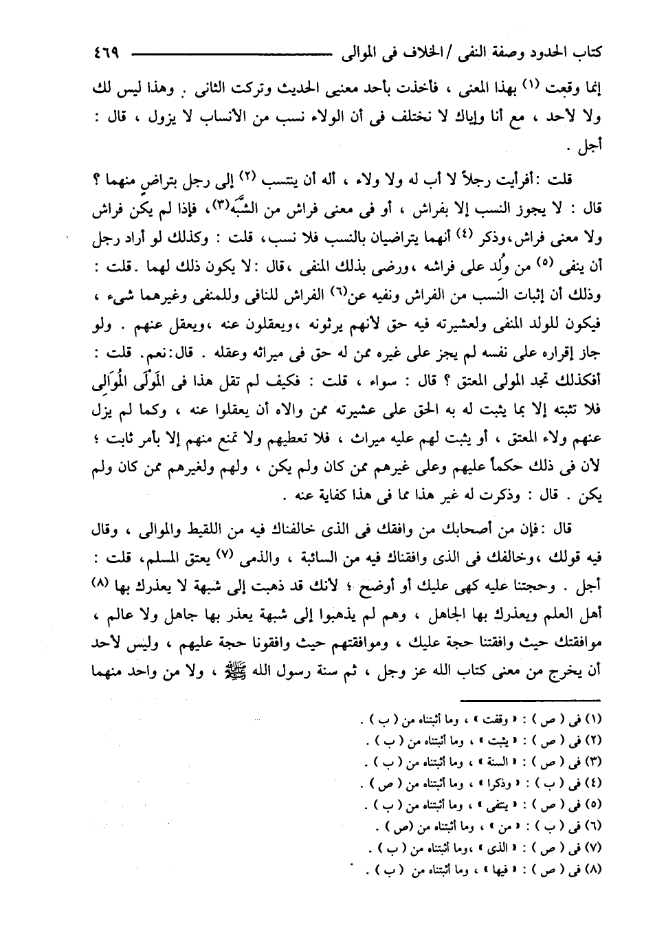 إنَّمَا وَقَعْت بِهَذَا الْمَعْنَى فَأَخَذْت بِأَحَدِ مَعْنَيَيْ الْحَدِيثِ وَتَرَكْت الثَّانِي. وَهَذَا لَيْسَ لَك وَلاَ لِأَحَدٍ مَعَ إنَّا وَإِيَّاكَ لاَ نَخْتَلِفُ فِي أَنَّ الْوَلاَءَ نَسَبٌ مِنْ الْأَنْسَابِ لاَ يَزُولُ قَالَ: أَجَلْ قُلْت أَفَرَأَيْت رَجُلاً لاَ أَبَ لَهُ وَلاَ وَلاَءَ أَلَهُ أَنْ يَنْتَسِبَ إلَى رَجُلٍ بِتَرَاضٍ مِنْهُمَا قَالَ لاَ يَجُوزُ النَّسَبُ إلَّا بِفِرَاشٍ أَوْ فِي مَعْنَى فِرَاشٍ مِنْ الشَّبَهِ فَإِذَا لَمْ يَكُنْ فِرَاشٌ وَلاَ مَعْنَى فِرَاشٍ وَذُكِرَا أَنَّهُمَا يَتَرَاضَيَانِ قُلْت وَذَلِكَ أَنَّ إثْبَاتَ النَّسَبِ مِنْ الْفِرَاشِ وَنَفْيَهُ مِنْ الْفِرَاشِ لِلنَّافِي وَلِلْمَنْفِيِّ وَغَيْرِهِمَا سِيَّانِ فَيَكُونُ لِلْوَلَدِ الْمَنْفِيِّ وَلِعَشِيرَتِهِ فِيهِ حَقٌّ لِأَنَّهُمْ يَرِثُونَهُ وَيَعْقِلُونَ عَنْهُ وَيَعْقِلُ عَنْهُمْ وَلَوْ جَازَ إقْرَارُهُ عَلَى نَفْسِهِ لَمْ يَجُزْ عَلَى غَيْرِهِ مِمَّنْ لَهُ حَقٌّ فِي مِيرَاثِهِ وَعَقْلِهِ. قَالَ: نَعَمْ قُلْت أَفَكَذَلِكَ تَجِدُ الْمَوْلَى الْمُعْتِقُ؟ قَالَ سَوَاءٌ قُلْت فَكَيْفَ لَمْ تَقُلْ هَذَا فِي الْمَوْلَى الْمُوَالِي فَلاَ تُثْبِتُهُ إلَّا بِمَا يَثْبُتُ لَهُ بِهِ الْحَقُّ عَشِيرَتُهُ مِمَّنْ وَالاَهُ أَنْ يَعْقِلُوا عَنْهُ وَكَمَا لَمْ يَزُلْ عَنْهُمْ وَلاَءُ الْمُعْتَقِ أَوْ يَثْبُتُ لَهُمْ عَلَيْهِ مِيرَاثٌ فَلاَ تُعْطِيهِمْ وَلاَ تَمْنَعُ مِنْهُمْ إلَّا بِأَمْرٍ ثَابِتٍ لِأَنَّ فِي ذَلِكَ حُكْمًا عَلَيْهِمْ وَعَلَى غَيْرِهِمْ مِمَّنْ كَانَ وَلَمْ يَكُنْ وَلَهُمْ وَلِغَيْرِهِمْ مِمَّنْ كَانَ وَلَمْ يَكُنْ. قَالَ وَذَكَرْت لَهُ غَيْرَ هَذَا مِمَّا فِي هَذَا كِفَايَةٌ عَنْهُ قَالَ فَإِنَّ مِنْ أَصْحَابِك مَنْ وَافَقَك فِي الَّذِي خَالَفْنَاك فِيهِ مِنْ اللَّقِيطِ وَالْمَوَالِي وَقَالَ فِيهِ قَوْلُك وَخَالَفَك فِي الَّذِي وَافَقْنَاك فِيهِ مِنْ السَّائِبَةِ وَالذِّمِّيِّ يُعْتِقُ الْمُسْلِمَ قُلْت أَجَلْ وَحُجَّتُنَا عَلَيْهِ كَهِيَ عَلَيْك أَوْ أَوْضَحُ لِأَنَّك قَدْ ذَهَبْت إلَى شُبْهَةٍ لاَ يَعْذُرُك بِهَا أَهْلُ الْعِلْمِ وَيَعْذُرُك بِهَا الْجَاهِلُ وَهُمْ لَمْ يَذْهَبُوا إلَى شُبْهَةٍ يَعْذُرُ بِهَا جَاهِلٌ وَلاَ عَالِمٌ وَمُوَافَقَتُك حَيْثُ وَافَقْتنَا حُجَّةٌ عَلَيْك وَمُوَافَقَتُهُمْ حَيْثُ وَافَقُونَا حُجَّةٌ عَلَيْهِمْ وَلَيْسَ لِأَحَدٍ أَنْ يَخْرُجَ مِنْ مَعْنَى كِتَابِ اللَّهِ عَزَّ وَجَلَّ ثُمَّ سُنَّةِ رَسُولِ اللَّهِ - صلى الله عليه وسلم - وَلاَ مِنْ وَاحِدٍ مِنْهُمَا@