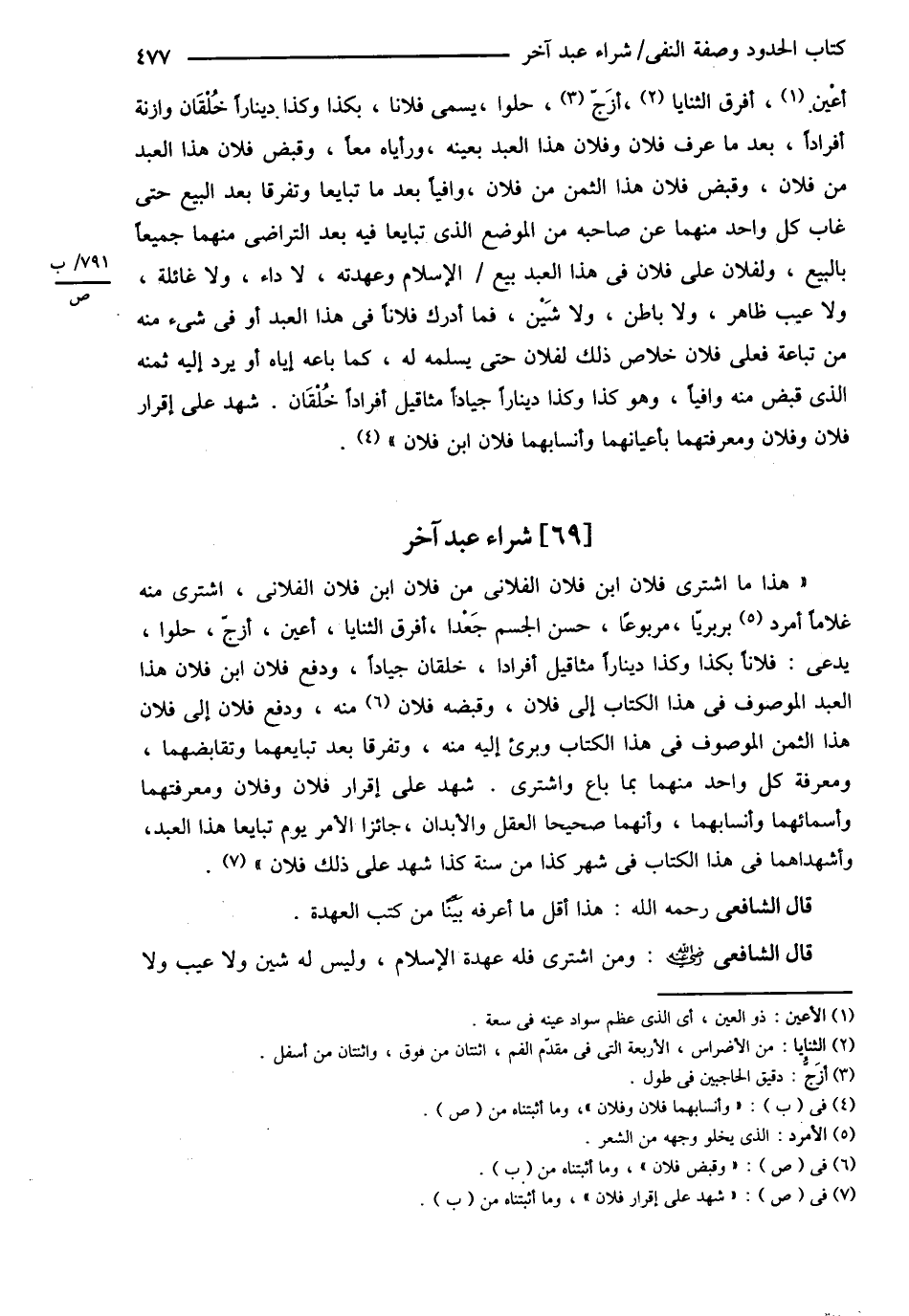 أَعَيْنَ أَفْرَقَ الثَّنَايَا أَزَجَّ حُلْوًا يُسَمَّى فُلاَنًا بِكَذَا وَكَذَا دِينَارًا خَلْقَانَ وَازِنَةً أَفْرَادًا بَعْدَمَا عَرَفَ فُلاَنٌ وَفُلاَنٌ هَذَا الْعَبْدَ بِعَيْنِهِ وَرَأَيَاهُ مَعًا وَقَبَضَ فُلاَنٌ هَذَا الْعَبْدَ مِنْ فُلاَنٍ وَقَبَضَ فُلاَنٌ هَذَا الثَّمَنَ مِنْ فُلاَنٍ وَافَيَا بَعْدَمَا تَبَايَعَا وَتَفَرَّقَا بَعْدَ الْبَيْعِ حَتَّى غَابَ كُلُّ وَاحِدٍ مِنْهُمَا عَنْ صَاحِبِهِ مِنْ الْمَوْضِعِ الَّذِي تَبَايَعَا فِيهِ بَعْدَ التَّرَاضِي مِنْهُمَا جَمِيعًا بِالْبَيْعِ وَلِفُلاَنٍ عَلَى فُلاَنٍ فِي هَذَا الْعَبْدِ بَيْعُ الْإِسْلاَمِ وَعُهْدَتِهِ لاَ دَاءٌ وَلاَ غَائِلَةٌ وَلاَ عَيْبٌ ظَاهِرٌ وَلاَ بَاطِنٌ وَلاَ شَيْنٌ فَمَا أَدْرَكَ فُلاَنًا فِي هَذَا الْعَبْدِ أَوْ فِي شَيْءٍ مِنْهُ مِنْ تَبَاعَةٍ فَعَلَى فُلاَنٍ خَلاَصُ ذَلِكَ لِفُلاَنٍ حَتَّى يُسَلِّمَهُ لَهُ كَمَا بَاعَهُ إيَّاهُ أَوْ يَرُدَّ إلَيْهِ ثَمَنَهُ الَّذِي قَبَضَ مِنْهُ وَافِيًا وَهُوَ كَذَا وَكَذَا دِينَارًا جِيَادًا مَثَاقِيلَ أَفْرَادًا خَلْقَانِ. شَهِدَ عَلَى إقْرَارِ فُلاَنٍ وَفُلاَنٍ , وَمَعْرِفَتِهِمَا بِأَعْيَانِهِمَا وَأَنْسَابِهِمَا فُلاَنٌ وَفُلاَنٌ.