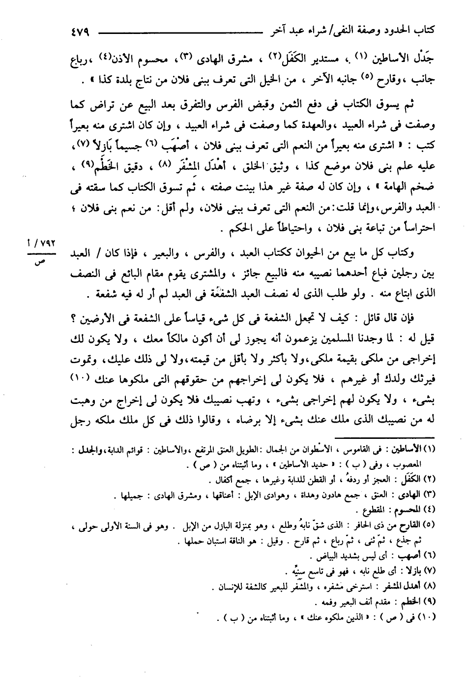 حَدِيدَ الْأَسَاطِينِ مُسْتَدِيرَ الْكِفْلِ مُشْرِقَ الْهَادِي مَحْسُومَ الْأُذُنِ رُبَاعَ جَانِبٍ وَقَارِحَ جَانِبِهِ الْآخَرِ مِنْ الْخَيْلِ الَّتِي تُعْرَفُ بِبَنِي فُلاَنٍ مِنْ نِتَاجِ بَلْدَةِ كَذَا " ثُمَّ يَسُوقُ الْكِتَابَ فِي دَفْعِ الثَّمَنِ وَقَبْضِ الْفَرَسِ وَالتَّفَرُّقِ بَعْدَ الْبَيْعِ عَنْ تَرَاضٍ كَمَا وَصَفْت فِي شِرَاءِ الْعَبِيدِ وَالْعُهْدَةُ كَمَا وَصَفْت فِي شِرَاءِ الْعَبِيدِ وَإِنْ كَانَ اشْتَرَى مِنْهُ بَعِيرًا كَتَبَ " اشْتَرَى مِنْهُ بَعِيرًا مِنْ النَّعَمِ الَّتِي تُعْرَفُ بِبَنِي فُلاَنٍ أَصْهَبَ جَسِيمًا بَازِلاً عَلَيْهِ عَلَمُ بَنِي فُلاَنٍ مَوْضِعَ كَذَا وَثِيقَ الْخَلْقِ أَهْدَلَ الْمِشْفَرِ دَقِيقَ الْخَطْمِ ضَخْمَ الْهَامَةِ. " وَإِنْ كَانَ لَهُ صِفَةٌ غَيْرُ هَذَا بُيِّنَتْ صِفَتُهُ ثُمَّ تَسُوقُ الْكِتَابَ كَمَا سُقْته فِي الْعَبْدِ وَالْفَرَسِ وَإِنَّمَا قُلْت مِنْ النَّعَمِ الَّتِي تُعْرَفُ بِبَنِي فُلاَنٍ وَلَمْ أَقُلْ مِنْ نَعَمِ بَنِي فُلاَنٍ احْتِرَاسًا مِنْ تَبَاعَةِ بَنِي فُلاَنٍ وَاحْتِيَاطًا عَلَى الْحَاكِمِ وَكِتَابُ كُلِّ مَا بِيعَ مِنْ الْحَيَوَانِ كَكِتَابِ الْعَبْدِ وَالْفَرَسِ وَالْبَعِيرِ فَإِذَا كَانَ الْعَبْدُ بَيْنَ رَجُلَيْنِ فَبَاعَ أَحَدُهُمَا نَصِيبَهُ مِنْهُ فَالْبَيْعُ جَائِزٌ وَالْمُشْتَرِي يَقُومُ مَقَامَ الْبَائِعِ فِي النِّصْفِ الَّذِي ابْتَاعَ مِنْهُ وَلَوْ طَلَبَ الَّذِي لَهُ نِصْفُ الْعَبْدِ الشُّفْعَةَ فِي الْعَبْدِ لَمْ أَرَ لَهُ فِيهِ شُفْعَةً فَإِنْ قَالَ قَائِلٌ كَيْفَ لاَ تَجْعَلُ الشُّفْعَةَ فِي كُلِّ شَيْءٍ قِيَاسًا عَلَى الشُّفْعَةِ فِي الْأَرَضِينَ قِيلَ لَهُ لَمَّا وَجَدْنَا الْمُسْلِمِينَ يَزْعُمُونَ أَنَّهُ يَجُوزُ لِي أَنْ أَكُونَ مَالِكًا مَعَك وَلاَ يَكُونُ لَك إخْرَاجِي مِنْ مِلْكِي بِقِيمَةِ مِلْكِي وَلاَ بِأَكْثَرَ وَلاَ بِأَقَلَّ مِنْ قِيمَتِهِ وَلاَ لِي ذَلِكَ عَلَيْك وَتَمُوتُ فَيَرِثُك وَلَدُك أَوْ غَيْرُهُمْ فَلاَ يَكُونُ لِي إخْرَاجُهُمْ مِنْ حُقُوقِهِمْ الَّتِي مَلَكُوهَا عَنْك بِشَيْءٍ وَلاَ يَكُونُ لَهُمْ إخْرَاجِي بِشَيْءٍ وَتَهَبُ نَصِيبَك فَلاَ يَكُونُ إلَى إخْرَاجِ مَنْ وَهَبْت لَهُ مِنْ نَصِيبِك الَّذِي مُلِكَ عَنْك بِشَيْءٍ إلَّا بِرِضَاهُ وَقَالُوا ذَلِكَ فِي كُلِّ مِلْكٍ مَلَكَهُ رَجُلٌ @