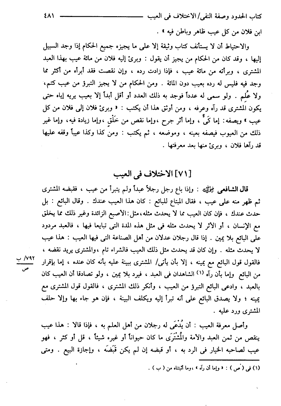 ابْنُ فُلاَنٍ مِنْ كُلِّ عَيْبٍ ظَاهِرٍ وَبَاطِنٍ فِيهِ وَالِاحْتِيَاطُ أَنْ لاَ يَسْتَأْنِفَ كِتَابَ وَثِيقَةٍ إلَّا عَلَى مَا يُجِيزُهُ جَمِيعُ الْحُكَّامِ إذَا وَجَدَ السَّبِيلَ إلَيْهَا وَقَدْ كَانَ مِنْ الْحُكَّامِ مِنْ يُجِيزُ أَنْ يَقُولَ وَبَرِئَ إلَيْهِ فُلاَنٌ مِنْ مِائَةِ عَيْبٍ بِهَذَا الْعَبْدِ الْمُشْتَرَى وَبَرَّأْته مِنْ مِائَةِ عَيْبٍ فَإِنْ زَادَتْ رَدَّهُ وَإِنْ نَقَصَتْ فَقَدْ أَبْرَأَهُ مِنْ أَكْثَرَ مِمَّا وُجِدَ فِيهِ فَلَيْسَ لَهُ رَدُّهُ بِعَيْبٍ دُونَ الْمِائَةِ . وَمِنْ الْحُكَّامِ مَنْ لاَ يُجِيزُ التَّبَرُّؤَ مِنْ عَيْبٍ كُتِمَ وَلاَ عُلِمَ وَلَوْ سَمَّى لَهُ عَدَدًا فَوَجَدَ بِهِ ذَلِكَ الْعَدَدَ أَوْ أَقَلَّ أَبَدًا إلَّا بِعَيْبٍ يُرِيهِ إيَّاهُ حَتَّى يَكُونَ الْمُشْتَرِي قَدْ رَآهُ وَعَرَفَهُ وَمَنْ أَوْثَقَ هَذَا أَنْ يَكْتُبَ وَبَرِئَ فُلاَنٌ إلَى فُلاَنٍ مِنْ كُلِّ عَيْبٍ وَيَصِفُهُ إمَّا كَيٌّ وَإِمَّا أَثَرُ جُرْحٍ وَإِمَّا نَقْصٌ مِنْ خَلْقٍ وَإِمَّا زِيَادَةٌ فِيهِ وَإِمَّا غَيْرُ ذَلِكَ مِنْ الْعُيُوبِ فَيَصِفُهُ بِعَيْنِهِ وَمَوْضِعِهِ ثُمَّ يَكْتُبُ وَمِنْ كَذَا وَكَذَا عَيْبًا وَقَفَهُ عَلَيْهَا قَدْ رَآهَا فُلاَنٌ وَبَرَّأَهُ مِنْهَا بَعْدَ مَعْرِفَتِهَا .