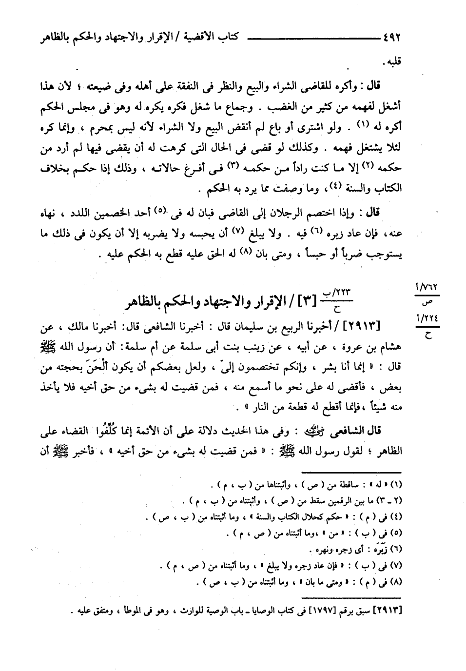 قَالَ الشَّافِعِيُّ : رحمه الله تعالى : وَفِي هَذَا الْحَدِيثِ دَلاَلَةٌ عَلَى أَنَّ الْأَئِمَّةَ إنَّمَا كُلِّفُوا الْقَضَاءَ عَلَى الظَّاهِرِ لِقَوْلِ رَسُولِ اللَّهِ - صلى الله عليه وسلم - فَمَنْ قَضَيْت لَهُ بِشَيْءٍ مِنْ حَقِّ أَخِيهِ فَأَخْبَرَ - صلى الله عليه وسلم - أَنْ@