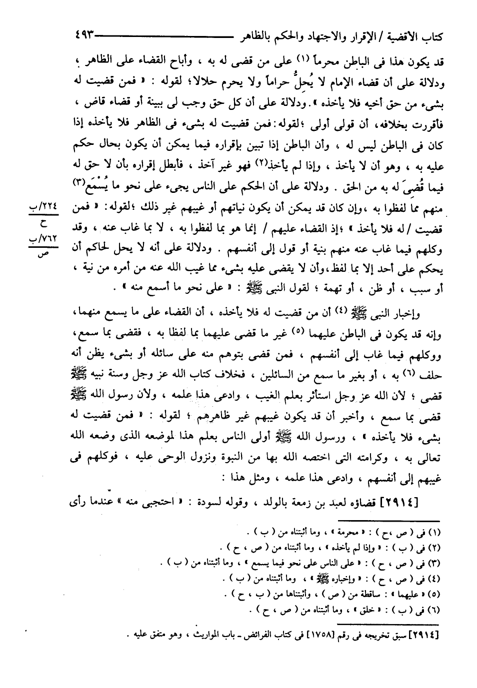قَدْ يَكُونُ هَذَا فِي الْبَاطِنِ مُحَرَّمًا عَلَى مَنْ قُضِيَ لَهُ بِهِ وَأَبَاحَ الْقَضَاءَ عَلَى الظَّاهِرِ وَدَلاَلَةٌ عَلَى أَنَّ قَضَاءَ الْإِمَامِ لاَ يُحِلُّ حَرَامًا وَلاَ يُحَرِّمُ حَلاَلاً لِقَوْلِهِ: ? فَمَنْ قَضَيْت لَهُ بِشَيْءٍ مِنْ حَقِّ أَخِيهِ فَلاَ يَأْخُذْهُ ? وَدَلاَلَةٌ عَلَى أَنَّ كُلَّ حَقٍّ وَجَبَ لِي بِبَيِّنَةٍ أَوْ قَضَاءِ قَاضٍ فَأَقْرَرْت بِخِلاَفِهِ أَنَّ قَوْلِي أَوْلَى لِقَوْلِهِ فَمَنْ قَضَيْت لَهُ بِشَيْءٍ فِي الظَّاهِرِ فَلاَ يَأْخُذْهُ إذَا كَانَ فِي الْبَاطِنِ لَيْسَ لَهُ وَأَنَّ الْبَاطِنَ إذَا تَبَيَّنَ بِإِقْرَارِهِ فِيمَا يُمْكِنُ أَنْ يَكُونَ بِحَالٍ حُكِمَ عَلَيْهِ بِهِ وَهُوَ أَنْ لاَ يَأْخُذَ وَإِذَا لَمْ يَأْخُذْهُ فَهُوَ غَيْرُ آخِذٍ فَأَبْطَلَ إقْرَارَهُ بِأَنْ لاَ حَقَّ لَهُ فِيمَا قَضَى لَهُ بِهِ مِنْ الْحَقِّ وَدَلاَلَةٌ عَلَى أَنَّ الْحُكْمَ عَلَى النَّاسِ يَجِيءُ عَلَى نَحْوِ مَا يَسْمَعُ مِنْهُمْ مِمَّا لَفَظُوا بِهِ وَإِنْ كَانَ قَدْ يُمْكِنُ أَنْ يَكُونَ نِيَّاتُهُمْ أَوْ غَيْبُهُمْ غَيْرَ ذَلِكَ لِقَوْلِهِ " فَمَنْ قَضَيْت لَهُ فَلاَ يَأْخُذْ " إذْ الْقَضَاءُ عَلَيْهِمْ إنَّمَا هُوَ بِمَا لَفَظُوا بِهِ لاَ بِمَا غَابَ عَنْهُ. وَقَدْ وَكَّلَهُمْ فِيمَا غَابَ عَنْهُ مِنْهُمْ بِنِيَّةٍ أَوْ قَوْلٍ إلَى أَنْفُسِهِمْ وَدَلاَلَةٌ عَلَى أَنَّهُ لاَ يَحِلُّ لِحَاكِمٍ أَنْ يَحْكُمَ عَلَى أَحَدٍ إلَّا بِمَا لَفَظَ وَأَنْ لاَ يَقْضِيَ عَلَيْهِ بِشَيْءٍ مِمَّا غَيَّبَ اللَّهُ تَعَالَى عَنْهُ مِنْ أَمْرِهِ مِنْ نِيَّةٍ أَوْ سَبَبٍ أَوْ ظَنٍّ أَوْ تُهْمَةٍ لِقَوْلِ النَّبِيِّ - صلى الله عليه وسلم - " عَلَى نَحْوِ مَا أَسْمَعُ مِنْهُ " وَإِخْبَارُ النَّبِيِّ - صلى الله عليه وسلم - أَنَّ مَنْ قَضَيْت لَهُ فَلاَ يَأْخُذْهُ أَنَّ الْقَضَاءَ عَلَى مَا يَسْمَعُ مِنْهُمَا وَإِنَّهُ قَدْ يَكُونُ فِي الْبَاطِنِ عَلَيْهِمَا غَيْرَ مَا قَضَى عَلَيْهِمَا بِمَا لَفَظَا بِهِ قَضَى بِمَا سَمِعَ وَوَكَّلَهُمْ فِيمَا غَابَ إلَى أَنْفُسِهِمْ فَمَنْ قَضَى بِتَوَهُّمٍ مِنْهُ عَلَى سَائِلِهِ أَوْ بِشَيْءٍ يَظُنُّ أَنَّهُ خَلْقٌ بِهِ أَوْ بِغَيْرِ مَا سَمِعَ مِنْ السَّائِلِينَ فَخِلاَفُ كِتَابِ اللَّهِ عَزَّ وَجَلَّ وَسُنَّةِ نَبِيِّهِ - صلى الله عليه وسلم - قَضَى لِأَنَّ اللَّهَ عَزَّ وَجَلَّ اسْتَأْثَرَ بِعِلْمِ الْغَيْبِ وَادَّعَى هَذَا عِلْمَهُ وَلِأَنَّ رَسُولَ اللَّهِ - صلى الله عليه وسلم - قَضَى بِمَا سَمِعَ وَأَخْبَرَ أَنْ قَدْ يَكُونُ غَيْبُهُمْ غَيْرَ ظَاهِرِهِمْ لِقَوْلِهِ: ? فَمَنْ قَضَيْت لَهُ بِشَيْءٍ فَلاَ يَأْخُذْهُ ? وَرَسُولُ اللَّهِ - صلى الله عليه وسلم - أَوْلَى النَّاسِ بِعِلْمِ هَذَا لِمَوْضِعِهِ الَّذِي وَضَعَهُ اللَّهُ تَعَالَى بِهِ وَكَرَامَتِهِ الَّتِي اخْتَصَّهُ اللَّهُ تَعَالَى بِهَا مِنْ النُّبُوَّةِ وَنُزُولِ الْوَحْيِ عَلَيْهِ فَوَكَّلَهُمْ فِي غَيْبِهِمْ إلَى أَنْفُسِهِمْ وَادَّعَى هَذَا عِلْمَهُ وَمِثْلُ هَذَا قَضَاؤُهُ لِعَبْدِ بْنِ زَمْعَةَ بِالْوَلَدِ وَقَوْلِهِ لِسَوْدَةِ: ? احْتَجِبِي مِنْهُ ? عِنْدَمَا رَأَى@