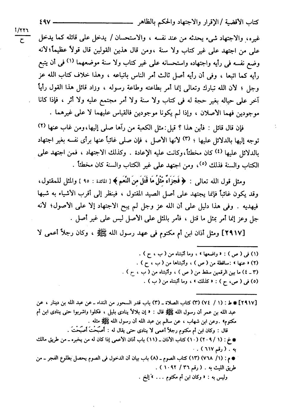 غَيْرَهُ وَالِاجْتِهَادُ شَيْءٌ يُحْدِثُهُ مِنْ عِنْدِ نَفْسِهِ وَالِاسْتِحْسَانُ يَدْخُلُ عَلَى قَائِلِهِ كَمَا يَدْخُلُ عَلَى مَنْ اجْتَهَدَ عَلَى غَيْرِ كِتَابٍ وَلاَ سُنَّةٍ وَمَنْ قَالَ هَذَيْنِ الْقَوْلَيْنِ قَالَ قَوْلاً عَظِيمًا لِأَنَّهُ وَضَعَ نَفْسَهُ فِي رَأْيِهِ وَاجْتِهَادِهِ وَاسْتِحْسَانِهِ عَلَى غَيْرِ كِتَابٍ وَلاَ سُنَّةٍ مَوْضِعَهُمَا فِي أَنْ يَتَّبِعَ رَأْيَهُ كَمَا اتَّبَعَا. وَفِي أَنَّ رَأْيَهُ أَصْلٌ ثَالِثٌ أُمِرَ النَّاسُ بِاتِّبَاعِهِ وَهَذَا خِلاَفُ كِتَابِ اللَّهِ عَزَّ وَجَلَّ لِأَنَّ اللَّهَ تَبَارَكَ وَتَعَالَى إنَّمَا أَمَرَ بِطَاعَتِهِ وَطَاعَةِ رَسُولِهِ وَزَادَ قَائِلُ هَذَا الْقَوْلِ رَأْيًا آخَرَ عَلَى حِيَالِهِ بِغَيْرِ حُجَّةٍ لَهُ فِي كِتَابٍ وَلاَ سُنَّةٍ وَلاَ أَمْرٍ مُجْتَمَعٍ عَلَيْهِ وَلاَ أَثَرٍ فَإِذَا كَانَا مَوْجُودَيْنِ فَهُمَا الْأَصْلاَنِ وَإِذَا لَمْ يَكُونَا مَوْجُودَيْنِ فَالْقِيَاسُ عَلَيْهِمَا لاَ عَلَى غَيْرِهِمَا. فَإِنْ قَالَ قَائِلٌ: فَأَيْنَ هَذَا قِيلَ مِثْلُ الْكَعْبَةِ مَنْ رَآهَا صَلَّى إلَيْهَا وَمَنْ غَابَ عَنْهَا تَوَجَّهَ إلَيْهَا بِالدَّلاَئِلِ عَلَيْهَا لِأَنَّهَا الْأَصْلُ فَإِنْ صَلَّى غَائِبًا عَنْهَا بِرَأْيِ نَفْسِهِ بِغَيْرِ اجْتِهَادٍ بِالدَّلاَئِلِ عَلَيْهَا كَانَ مُخْطِئًا وَكَانَتْ عَلَيْهِ الْإِعَادَةُ , وَكَذَلِكَ الِاجْتِهَادُ فَمَنْ اجْتَهَدَ عَلَى الْكِتَابِ وَالسُّنَّةِ فَذَلِكَ. وَمَنْ اجْتَهَدَ عَلَى غَيْرِ الْكِتَابِ وَالسُّنَّةِ كَانَ مُخْطِئًا. وَمِثْلُ قَوْلِ اللَّهِ تَعَالَى: ? فَجَزَاءٌ مِثْلُ مَا قَتَلَ مِنْ النَّعَمِ ? وَالْمِثْلُ لِلْمَقْتُولِ وَقَدْ يَكُونُ غَائِبًا فَإِنَّمَا يَجْتَهِدُ عَلَى أَصْلِ الصَّيْدِ الْمَقْتُولِ فَيَنْظُرُ إلَى أَقْرَبِ الْأَشْيَاءِ بِهِ شَبَهًا فَيُهْدِيه. وَفِي هَذَا دَلِيلٌ عَلَى أَنَّ اللَّهَ عَزَّ وَجَلَّ لَمْ يُبِحْ الِاجْتِهَادَ إلَّا عَلَى الْأُصُولِ لِأَنَّهُ عَزَّ وَجَلَّ إنَّمَا أَمَرَ بِمِثْلِ مَا قَتَلَ فَأَمَرَ بِالْمِثْلِ عَلَى الْأَصْلِ لَيْسَ عَلَى غَيْرِ أَصْلٍ. وَمِثْلُ أَذَانِ ابْنِ أُمِّ مَكْتُومٍ فِي عَهْدِ رَسُولِ اللَّهِ - صلى الله عليه وسلم - وَكَانَ رَجُلاً أَعْمَى لاَ@