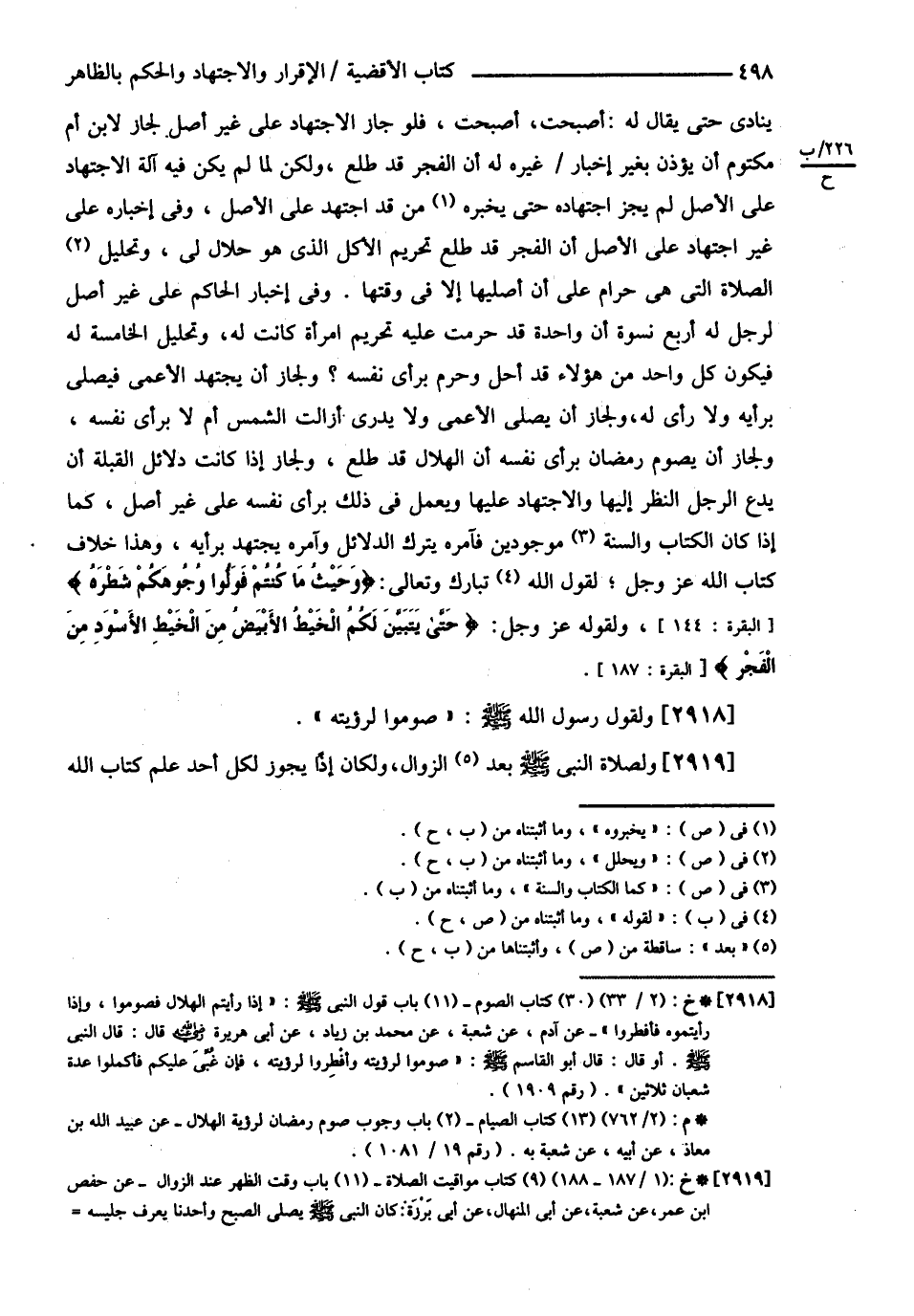 يُنَادِي حَتَّى يُقَالَ لَهُ أَصْبَحْت أَصْبَحْت فَلَوْ جَازَ الِاجْتِهَادُ عَلَى غَيْرِ أَصْلٍ لَجَازَ لِابْنِ أُمِّ مَكْتُومٍ أَنْ يُؤَذِّنَ بِغَيْرِ إخْبَارِ غَيْرِهِ لَهُ أَنَّ الْفَجْرَ قَدْ طَلَعَ. وَلَكِنْ لَمَّا لَمْ يَكُنْ فِيهِ آلَةُ الِاجْتِهَادِ عَلَى الْأَصْلِ لَمْ يَجُزْ اجْتِهَادُهُ حَتَّى يُخْبِرَهُ مَنْ قَدْ اجْتَهَدَ عَلَى الْأَصْلِ وَفِي إخْبَارِهِ عَلَى غَيْرِ اجْتِهَادٍ عَلَى الْأَصْلِ أَنَّ الْفَجْرَ قَدْ طَلَعَ تَحْرِيمُ الْأَكْلِ الَّذِي هُوَ حَلاَلٌ لِي وَتَحْلِيلُ الصَّلاَةِ الَّتِي هِيَ حَرَامٌ عَلَيَّ أَنْ أُصَلِّيَهَا إلَّا فِي وَقْتِهَا وَفِي إخْبَارِ الْحَاكِمِ عَلَى غَيْرِ أَصْلٍ لِرَجُلٍ لَهُ أَرْبَعُ نِسْوَةٍ أَنَّ وَاحِدَةً قَدْ حُرِّمَتْ عَلَيْهِ تَحْرِيمَ امْرَأَةٍ كَانَتْ لَهُ وَتَحْلِيلَ الْخَامِسَةِ لَهُ فَيَكُونُ كُلُّ وَاحِدٍ مِنْ هَؤُلاَءِ وَقَدْ أَحَلَّ وَحَرَّمَ بِرَأْيِ نَفْسِهِ وَلَجَازَ أَنْ يَجْتَهِدَ الْأَعْمَى فَيُصَلِّيَ بِرَأْيِهِ وَلاَ رَأْيَ لَهُ وَلَجَازَ أَنْ يُصَلِّيَ الْأَعْمَى وَلاَ يَدْرِي قَدْ أَحَلَّ وَحَرَّمَ بِرَأْيِ نَفْسِهِ وَلَجَازَ أَنْ يَجْتَهِدَ الْأَعْمَى فَيُصَلِّيَ بِرَأْيِهِ وَلاَ رَأْيَ لَهُ وَلَجَازَ أَنْ يُصَلِّيَ الْأَعْمَى وَلاَ يَدْرِي أَزَالَتْ الشَّمْسُ أَمْ لاَ؟ بِرَأْيِ نَفْسِهِ وَلَجَازَ أَنْ يَصُومَ رَمَضَانَ بِرَأْيِ نَفْسِهِ أَنَّ الْهِلاَلَ قَدْ طَلَعَ وَلَجَازَ إذَا كَانَتْ دَلاَئِلُ الْقِبْلَةِ أَنْ يَدَعَ الرَّجُلُ النَّظَرَ إلَيْهَا وَالِاجْتِهَادَ عَلَيْهَا وَيَعْمَلَ فِي ذَلِكَ بِرَأْيِ نَفْسِهِ عَلَى غَيْرِ أَصْلٍ كَمَا إذَا كَانَ الْكِتَابُ وَالسُّنَّةُ مَوْجُودَيْنِ فَآمُرُهُ يَتْرُكُ الدَّلاَئِلَ وَآمُرُهُ يَجْتَهِدُ بِرَأْيِهِ وَهَذَا خِلاَفُ كِتَابِ اللَّهِ عَزَّ وَجَلَّ لِقَوْلِهِ تَبَارَكَ وَتَعَالَى: ? وَحَيْثُمَا كُنْتُمْ فَوَلُّوا وُجُوهَكُمْ شَطْرَهُ ? وَلِقَوْلِهِ عَزَّ وَجَلَّ:: ? حَتَّى يَتَبَيَّنَ لَكُمْ الْخَيْطُ الْأَبْيَضُ مِنْ الْخَيْطِ الْأَسْوَدِ مِنْ الْفَجْرِ ? وَلِقَوْلِ رَسُولِ اللَّهِ - صلى الله عليه وسلم -: ? صُومُوا لِرُؤْيَتِهِ ? وَلِصَلاَةِ النَّبِيِّ - صلى الله عليه وسلم - بَعْدَ الزَّوَالِ وَلَكَانَ إذًا يَجُوزُ لِكُلِّ أَحَدٍ عَلِمَ كِتَابَ اللَّهِ@