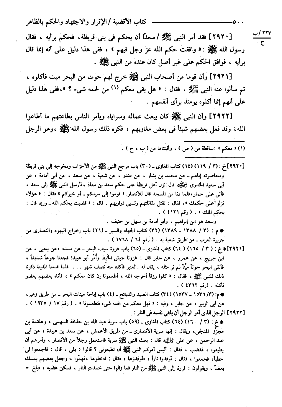 فَقَدْ : ? أَمَرَ النَّبِيُّ - صلى الله عليه وسلم - سَعْدًا أَنْ يَحْكُمَ فِي بَنِي قُرَيْظَةَ فَحَكَمَ بِرَأْيِهِ فَقَالَ رَسُولُ اللَّهِ - صلى الله عليه وسلم - وَافَقْت حُكْمَ اللَّهِ عَزَّ وَجَلَّ فِيهِمْ ? فَفِي هَذَا دَلِيلٌ عَلَى أَنَّهُ إنَّمَا قَالَ بِرَأْيِهِ فَوَافَقَ الْحُكْمَ عَلَى غَيْرِ أَصْلٍ كَانَ عِنْدَهُ مِنْ النَّبِيِّ - صلى الله عليه وسلم - : ? وَأَنَّ قَوْمًا مِنْ أَصْحَابِ النَّبِيِّ - صلى الله عليه وسلم - خَرَجَ لَهُمْ حُوتٌ مِنْ الْبَحْرِ مَيِّتٌ فَأَكَلُوهُ ثُمَّ سَأَلُوا عَنْهُ النَّبِيَّ - صلى الله عليه وسلم - فَقَالَ هَلْ بَقِيَ مَعَكُمْ مِنْ لَحْمِهِ شَيْءٌ ؟ ? فَفِي هَذَا دَلِيلٌ عَلَى أَنَّهُمْ إنَّمَا أَكَلُوهُ يَوْمَئِذٍ بِرَأْيِ أَنْفُسِهِمْ وَأَنَّ النَّبِيَّ - صلى الله عليه وسلم - كَانَ يَبْعَثُ عُمَّالَهُ وَسَرَايَاهُ وَيَأْمُرُ النَّاسَ بِطَاعَتِهِمْ مَا أَطَاعُوا اللَّهَ وَقَدْ فَعَلَ بَعْضُهُمْ شَيْئًا فِي بَعْضِ مَغَازِيهِمْ فَكَرِهَ ذَلِكَ رَسُولُ اللَّهِ - صلى الله عليه وسلم - وَهُوَ الرَّجُلُ @