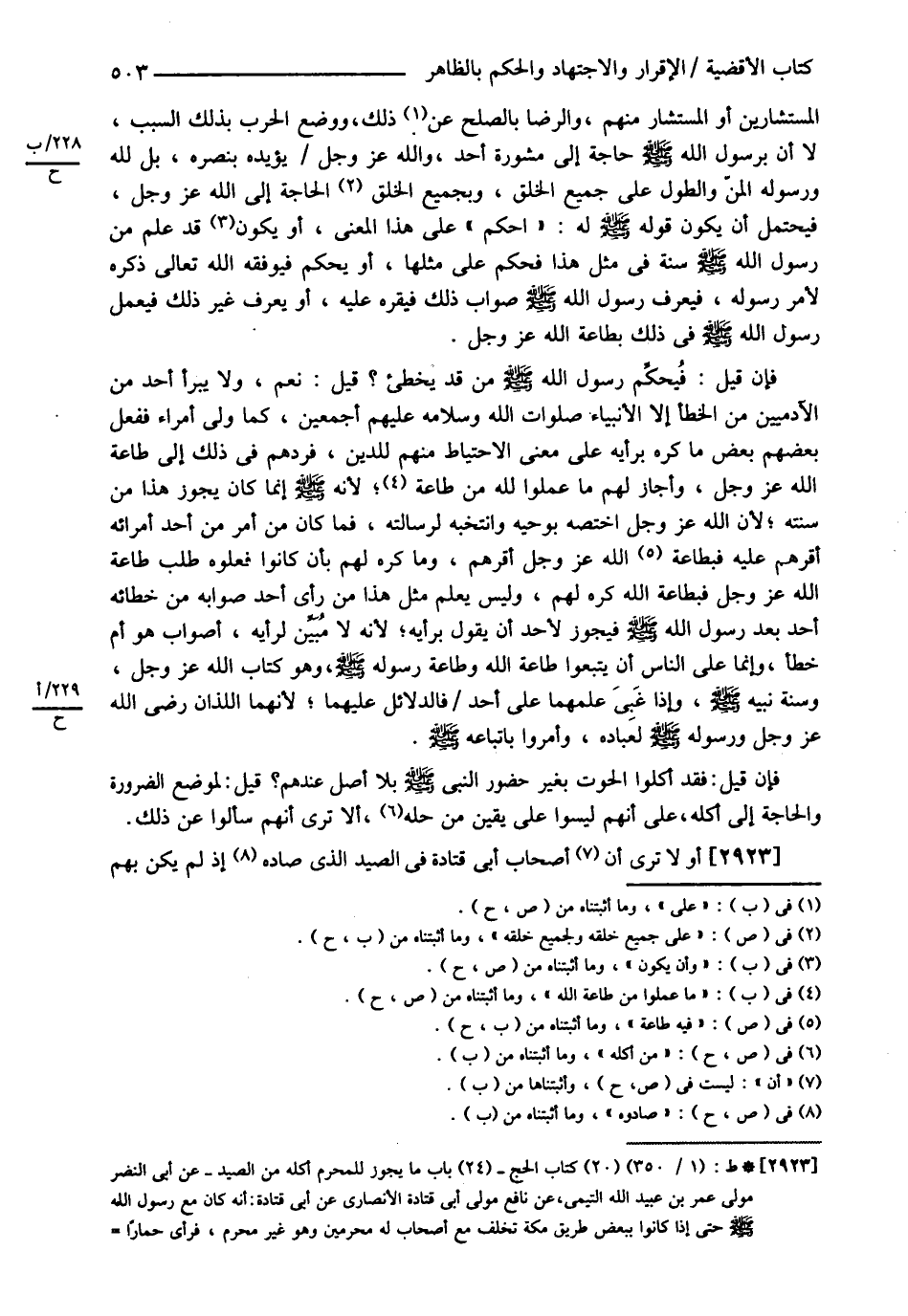 الْمُسْتَشَارِينَ أَوْ الْمُسْتَشَارِ مِنْهُمْ وَالرِّضَا بِالصُّلْحِ عَلَى ذَلِكَ وَوَضْعِ الْحَرْبِ بِذَلِكَ السَّبَبِ لاَ أَنَّ بِرَسُولِ اللَّهِ - صلى الله عليه وسلم - حَاجَةً إلَى مَشُورَةِ أَحَدٍ وَاَللَّهُ عَزَّ وَجَلَّ يُؤَيِّدُهُ بِنَصْرِهِ بَلْ لِلَّهِ وَرَسُولِهِ الْمَنُّ وَالطَّوْلُ عَلَى جَمِيعِ الْخَلْقِ وَبِجَمِيعِ الْخَلْقِ الْحَاجَةُ إلَى اللَّهِ عَزَّ وَجَلَّ فَيَحْتَمِلُ أَنْ يَكُونَ قَوْلُهُ - صلى الله عليه وسلم - لَهُ اُحْكُمْ عَلَى هَذَا الْمَعْنَى وَأَنْ يَكُونَ قَدْ عَلِمَ مِنْ رَسُولِ اللَّهِ - صلى الله عليه وسلم - سُنَّةً فِي مِثْلِ هَذَا فَحَكَمَ عَلَى مِثْلِهَا أَوْ يَحْكُمَ فَيُوَفِّقَهُ اللَّهُ تَعَالَى ذِكْرُهُ لِأَمْرِ رَسُولِهِ فَيَعْرِفَ رَسُولَ اللَّهِ - صلى الله عليه وسلم - صَوَابَ ذَلِكَ فَيُقِرَّهُ عَلَيْهِ أَوْ يَعْرِفَ غَيْرَ ذَلِكَ فَيَعْمَلَ رَسُولُ اللَّهِ - صلى الله عليه وسلم - فِي ذَلِكَ بِطَاعَةِ اللَّهِ عَزَّ وَجَلَّ فَإِنْ قِيلَ فَيَحْكُمُ رَسُولُ اللَّهِ - صلى الله عليه وسلم - مَنْ قَدْ يُخْطِئُ؟ قِيلَ نَعَمْ وَلاَ يَبْرَأُ أَحَدٌ مِنْ الْآدَمِيِّينَ مِنْ الْخَطَأِ إلَّا الْأَنْبِيَاءُ صَلَوَاتُ اللَّهِ تَعَالَى وَسَلاَمُهُ عَلَيْهِمْ أَجْمَعِينَ كَمَا وَلَّى أُمَرَاءَ فَفَعَلَ بَعْضُهُمْ بَعْضَ مَا كَرِهَ بِرَأْيِهِ عَلَى مَعْنَى الِاحْتِيَاطِ مِنْهُمْ لِلدِّينِ فَرَدَّهُمْ فِي ذَلِكَ إلَى طَاعَةِ اللَّهِ عَزَّ وَجَلَّ وَأَجَازَ لَهُمْ مَا عَمِلُوا مِنْ طَاعَةِ اللَّهِ لِأَنَّهُ - صلى الله عليه وسلم - إنَّمَا كَانَ يَجُوزُ هَذَا مِنْ سُنَّتِهِ لِأَنَّ اللَّهَ عَزَّ وَجَلَّ اخْتَصَّهُ بِوَحْيِهِ وَانْتَخَبَهُ لِرِسَالَتِهِ فَمَا كَانَ مِنْ أَمْرٍ مِنْ أَحَدِ أُمَرَائِهِ أَقَرَّهُمْ عَلَيْهِ فَبِطَاعَةِ اللَّهِ عَزَّ وَجَلَّ أَقَرَّهُمْ وَمَا كَرِهَ لَهُمْ بِأَنْ كَانُوا فَعَلُوهُ طَلَبَ طَاعَةِ اللَّهِ عَزَّ وَجَلَّ فَبِطَاعَةِ اللَّهِ كَرِهَ لَهُمْ وَلَيْسَ يَعْلَمُ مِثْلَ هَذَا مَنْ رَأَى أَحَدٌ صَوَابَهُ مِنْ خَطَئِهِ أَحَدٌ بَعْدَ رَسُولِ اللَّهِ - صلى الله عليه وسلم - فَيَجُوزُ لِأَحَدٍ أَنْ يَقُولَ بِرَأْيِهِ لِأَنَّهُ لاَ مُبَيِّنَ لِرَأْيِهِ أَصَوَابٌ هُوَ أَمْ خَطَأٌ وَإِنَّمَا عَلَى النَّاسِ أَنْ يَتَّبِعُوا طَاعَةَ اللَّهِ وَطَاعَةَ رَسُولِهِ - صلى الله عليه وسلم - وَهُوَ كِتَابُ اللَّهِ عَزَّ وَجَلَّ وَسُنَّةُ نَبِيِّهِ - صلى الله عليه وسلم - وَإِذَا غَبِيَ عِلْمُهُمَا عَلَى أَحَدٍ فَالدَّلاَئِلُ عَلَيْهِمَا لِأَنَّهُمَا اللَّذَانِ رَضِيَ اللَّهُ عَزَّ وَجَلَّ وَرَسُولُهُ - صلى الله عليه وسلم - لِعِبَادِهِ وَأَمَرُوا بِاتِّبَاعِهِ - صلى الله عليه وسلم - فَإِنْ قِيلَ فَقَدْ أَكَلُوا الْحُوتَ بِغَيْرِ حُضُورِ النَّبِيِّ - صلى الله عليه وسلم - بِلاَ أَصْلٍ عِنْدَهُمْ؟ قِيلَ لِمَوْضِعِ الضَّرُورَةِ وَالْحَاجَةِ إلَى أَكْلِهِ عَلَى أَنَّهُمْ لَيْسُوا عَلَى يَقِينٍ مِنْ حِلِّهِ. أَلاَ تَرَى أَنَّهُمْ سَأَلُوا عَنْ ذَلِكَ أَوْ لاَ تَرَى أَنَّ أَصْحَابَ أَبِي قَتَادَةَ فِي الصَّيْدِ الَّذِي صَادَهُ إذْ لَمْ يَكُنْ بِهِمْ@