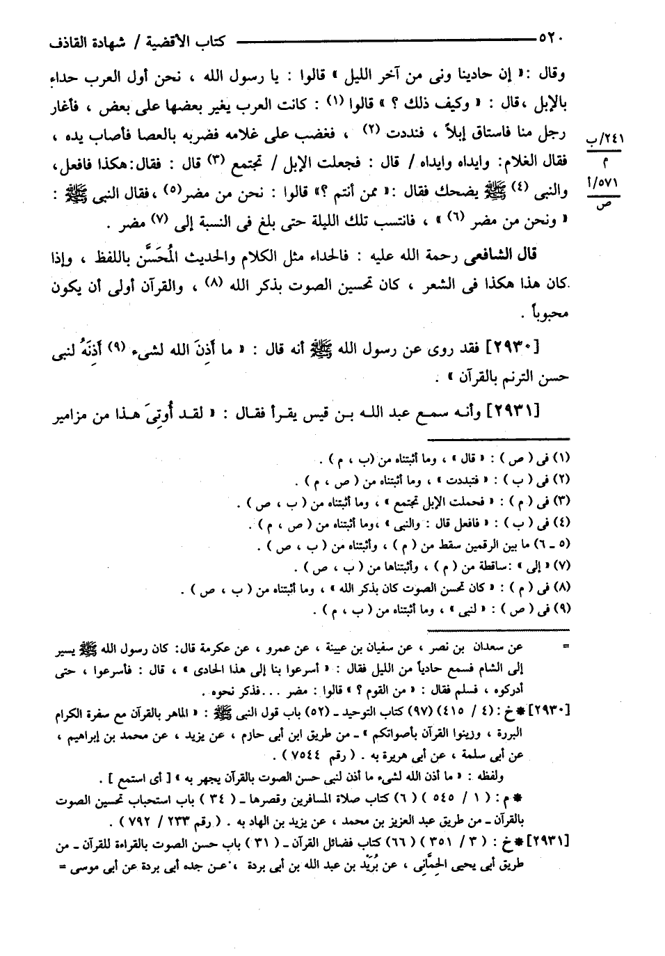 قَالَ الشَّافِعِيُّ : رحمه الله تعالى فَالْحِدَاءُ مِثْل الْكَلاَمُ , وَالْحَدِيثُ الْمُحَسَّنُ بِاللَّفْظِ , وَإِذَا كَانَ هَذَا هَكَذَا فِي الشِّعْرِ كَانَ تَحْسِينُ الصَّوْتِ بِذِكْرِ اللَّهِ وَالْقُرْآنِ أَوْلَى أَنْ يَكُون مَحْبُوبًا فَقَدْ رُوِيَ عَنْ رَسُولِ اللَّهِ - صلى الله عليه وسلم - أَنَّهُ قَالَ : : ? مَا أَذِنَ اللَّهُ لِشَيْءٍ أَذِنَهُ لِنَبِيٍّ حَسَنِ التَّرَنُّمِ بِالْقُرْآنِ ? وَأَنَّهُ : ? سَمِعَ عَبْدَ اللَّهِ بْنَ قَيْسٍ يَقْرَأُ فَقَالَ لَقَدْ أُوتِيَ هَذَا مِنْ مَزَامِيرِ@