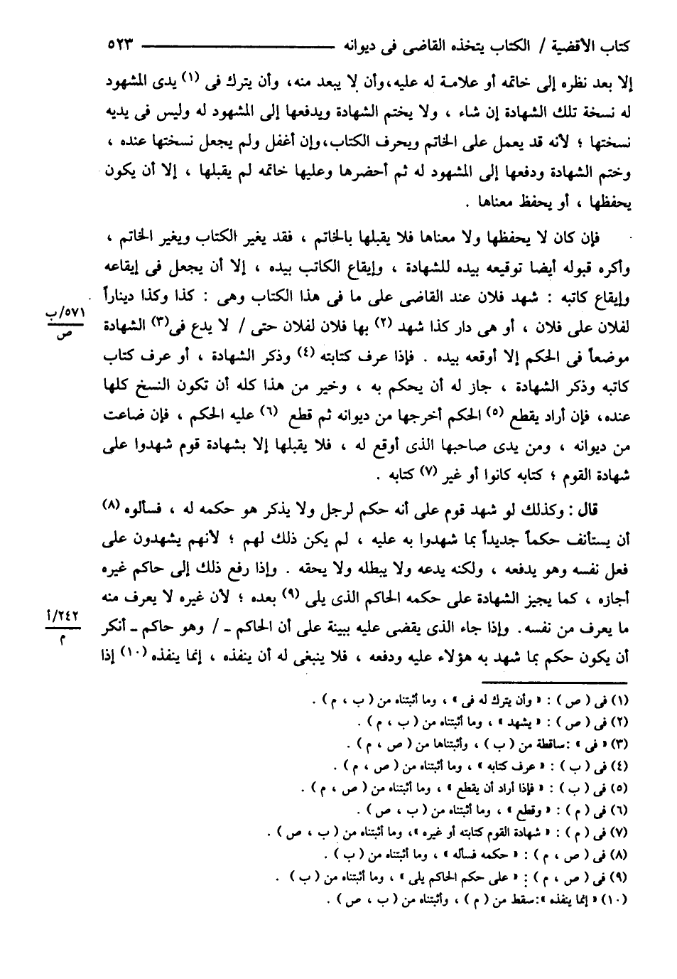 إلَّا بَعْدَ نَظَرِهِ إلَى خَاتَمِهِ أَوْ عَلاَمَةٍ لَهُ عَلَيْهِ , وَأَنْ لاَ يَبْعُدَ مِنْهُ , وَأَنْ يُتْرَكَ فِي يَدَيْ الْمَشْهُودِ لَهُ نُسْخَةُ تِلْكَ الشَّهَادَةِ إنْ شَاءَ , وَلاَ يَخْتِمُ الشَّهَادَةَ , وَيَدْفَعْهَا إلَى الْمَشْهُودِ لَهُ , وَلَيْسَ فِي يَدَيْهِ نُسْخَتُهَا لِأَنَّهُ قَدْ يَعْمَلُ عَلَى الْخَاتَمِ , وَيُحَرِّفُ الْكِتَابَ , وَإِنْ أَغْفَلَ , وَلَمْ يَجْعَلْ نُسْخَتَهَا عِنْدَهُ , وَخَتَمَ الشَّهَادَةَ , وَدَفَعَهَا إلَى الْمَشْهُودِ لَهُ ثُمَّ أَحْضَرَهَا , وَعَلَيْهَا خَاتَمُهُ لَمْ يَقْبَلْهَا إلَّا أَنْ يَكُونَ يَحْفَظُهَا أَوْ يَحْفَظُ مَعْنَاهَا فَإِنْ كَانَ لاَ يَحْفَظُهَا , وَلاَ مَعْنَاهَا فَلاَ يَقْبَلُهَا بِالْخَاتَمِ فَقَدْ يُغَيِّرُ الْكِتَابَ , وَيُغَيِّرُ الْخَاتَمَ , وَأَكْرَهُ قَبُولَهُ أَيْضًا تَوْقِيعَهُ بِيَدِهِ لِلشَّهَادَةِ , وَإِيقَاعَ الْكَاتِبِ بِيَدِهِ إلَّا أَنْ يُجْعَلَ فِي إيقَاعِهِ وَإِيقَاعِ كَاتِبِهِ شَهِدَ فُلاَنٌ عِنْدَ الْقَاضِي عَلَى مَا فِي هَذَا الْكِتَابِ , وَهِيَ كَذَا وَكَذَا دِينَارٌ لِفُلاَنٍ عَلَى فُلاَنٍ أَوْ هِيَ دَارُ كَذَا شَهِدَ بِهَا فُلاَنٌ لِفُلاَنٍ حَتَّى لاَ يَدَعَ فِي الشَّهَادَةِ مَوْضِعًا فِي الْحُكْمِ إلَّا أَوْقَعَهُ بِيَدِهِ فَإِذَا عَرَفَ كِتَابَهُ , وَذَكَرَ الشَّهَادَةَ أَوْ عَرَفَ كِتَابَ كَاتِبِهِ , وَذَكَرَ الشَّهَادَةَ جَازَ لَهُ أَنْ يَحْكُمَ بِهِ , وَخَيْرٌ مِنْ هَذَا كُلِّهِ أَنْ تَكُونَ النُّسَخُ كُلُّهَا عِنْدَهُ فَإِذَا أَرَادَ أَنْ يَقْطَعَ الْحُكْمَ أَخْرَجَهَا مِنْ دِيوَانِهِ ثُمَّ قَطَعَ عَلَيْهِ الْحُكْمَ فَإِنْ ضَاعَتْ مِنْ دِيوَانِهِ , وَمِنْ يَدَيْ صَاحِبِهَا الَّذِي أَوْقَعَ لَهُ فَلاَ يَقْبَلُهَا إلَّا بِشَهَادَةِ قَوْمٍ شَهِدُوا عَلَى شَهَادَةِ الْقَوْمِ كُتَّابَهُ كَانُوا أَوْ غَيْرَ كُتَّابِهِ