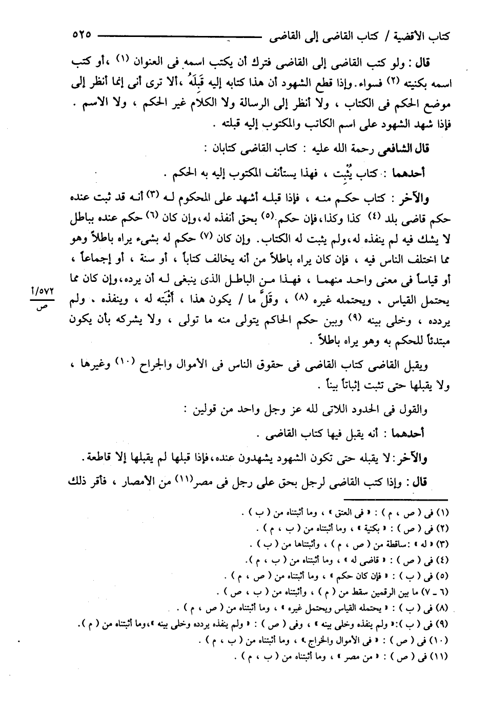 قَالَ الشَّافِعِيُّ : رحمه الله تعالى : كِتَابُ الْقَاضِي كِتَابَانِ أَحَدُهُمَا كِتَابُ يَثْبُتُ فَهَذَا يَسْتَأْنِفُ الْمَكْتُوبَ إلَيْهِ بِهِ الْحُكْمَ , وَالْآخَرُ كِتَابٌ حَكَمَ مِنْهُ فَإِذَا قَبِلَهُ أَشْهَدَ عَلَى الْمَحْكُومِ لَهُ أَنَّهُ قَدْ ثَبَتَ عِنْدَهُ حُكْمُ قَاضِي بَلَدِ كَذَا وَكَذَا فَإِنْ كَانَ حَكَمَ بِحَقٍّ أَنْفَذَهُ لَهُ , وَإِنْ كَانَ حَكَمَ عِنْدَهُ بِبَاطِلٍ لاَ يُشَكُّ فِيهِ لَمْ يُنْفِذْهُ لَهُ , وَلَمْ يَثْبُتْ لَهُ الْكِتَابُ , وَإِنْ كَانَ حَكَمَ لَهُ بِشَيْءٍ يَرَاهُ بَاطِلاً , وَهُوَ مِمَّا اخْتَلَفَ النَّاسُ فِيهِ , فَإِنْ كَانَ يَرَاهُ بَاطِلاً مِنْ أَنَّهُ يُخَالِفُ كِتَابًا أَوْ سُنَّةً أَوْ إجْمَاعًا أَوْ قِيَاسًا فِي مَعْنًى وَاحِدٍ مِنْهَا فَهَذَا مِنْ الْبَاطِلِ الَّذِي يَنْبَغِي لَهُ أَنْ يَرُدَّهُ , وَإِنْ كَانَ مِمَّا يَحْتَمِلُهُ الْقِيَاسُ , وَيَحْتَمِلُ غَيْرَهُ , وَقَلَّمَا يَكُونُ هَذَا أَثْبَتَهُ لَهُ , وَلَمْ يُنْفِذْهُ , وَخَلَّى بَيْنَهُ وَبَيْنَ حُكْمِ الْحَاكِمِ يَتَوَلَّى مِنْهُ مَا تَوَلَّى , وَلاَ يُشْرِكُهُ بِأَنْ يَكُونَ مُبْتَدِئًا لِلْحُكْمِ بِهِ , وَهُوَ يَرَاهُ بَاطِلاً , وَيَقْبَلُ الْقَاضِي كِتَابَ الْقَاضِي فِي حُقُوقِ النَّاسِ فِي الْأَمْوَالِ وَالْجِرَاحِ وَغَيْرِهَا , وَلاَ يَقْبَلُهَا حَتَّى تَثْبُتَ إثْبَاتًا بَيَّنَّا وَالْقَوْلُ فِي الْحُدُودِ اللَّاتِي لِلَّهِ عَزَّ وَجَلَّ وَاحِدٌ مِنْ قَوْلَيْنِ أَحَدُهُمَا أَنَّهُ يُقْبَلُ فِيهَا كِتَابَ الْقَاضِي , وَالْآخَرُ لاَ يَقْبَلُهُ حَتَّى تَكُونَ الشُّهُودُ يَشْهَدُونَ عِنْدَهُ فَإِذَا قَبِلَهَا لَمْ يَقْبَلْهَا إلَّا قَاطِعَةً