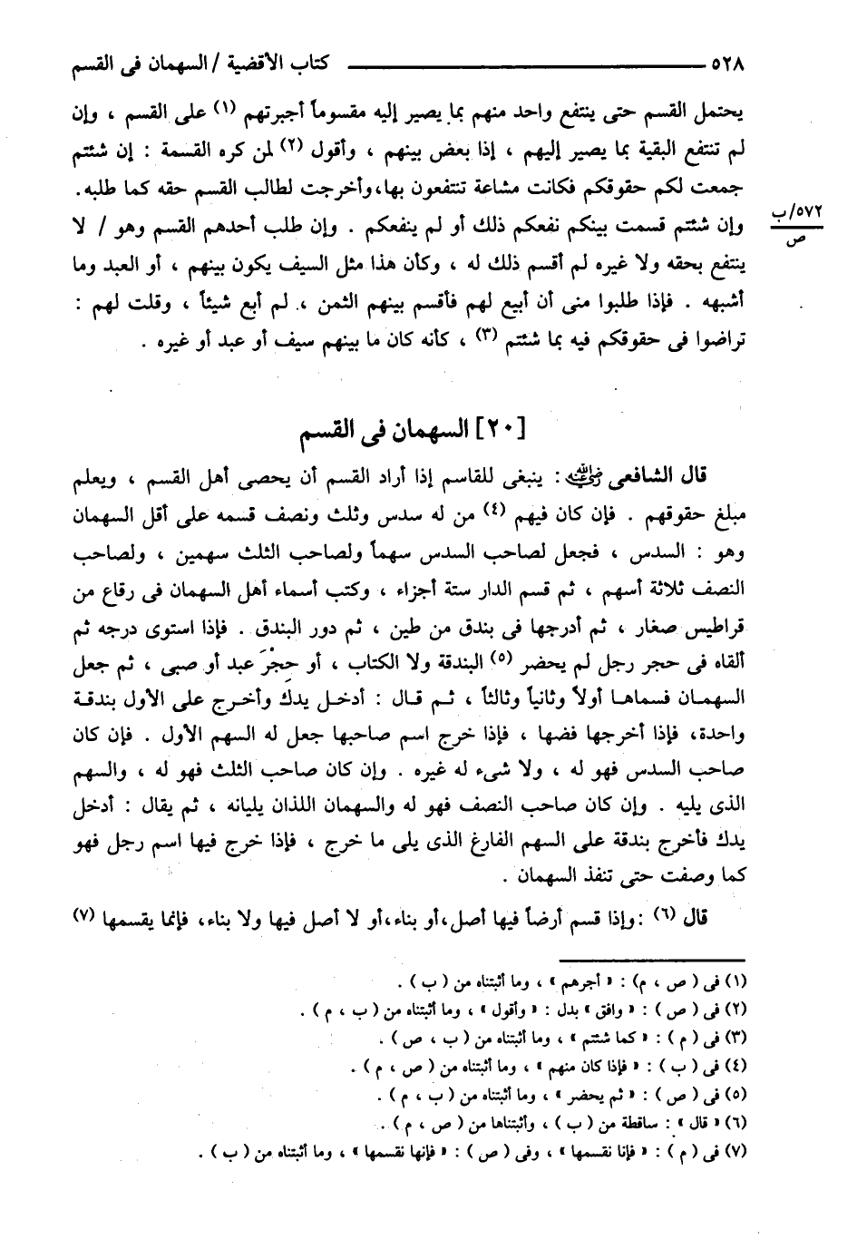 قَالَ الشَّافِعِيُّ : رحمه الله تعالى يَنْبَغِي لِلْقَاسِمِ إذَا أَرَادَ الْقَسْمَ أَنْ يُحْصِيَ أَهْلَ الْقَسْمِ , وَيَعْلَمَ مَبْلَغَ حُقُوقِهِمْ فَإِنْ كَانَ مِنْهُمْ مَنْ لَهُ سُدُسٌ وَثُلُثٌ وَنِصْفٌ قَسَمَهُ عَلَى أَقَلِّ السُّهْمَانِ , وَهُوَ السُّدُسُ فَجَعَلَ لِصَاحِبِ السُّدُسِ سَهْمًا , وَلِصَاحِبِ الثُّلُثِ سَهْمَيْنِ , وَلِصَاحِبِ النِّصْفِ ثَلاَثَةَ أَسْهُمٍ ثُمَّ قَسَمَ الدَّارَ سِتَّةَ أَجْزَاءٍ , وَكَتَبَ أَسْمَاءَ أَهْلِ السُّهْمَانِ فِي رِقَاعٍ مِنْ قَرَاطِيسَ صِغَارٍ ثُمَّ أَدْرَجَهَا فِي بُنْدُقٍ مِنْ طِينٍ ثُمَّ دَوَّرَ الْبُنْدُقَ فَإِذَا اسْتَوَى دَرَجَهُ ثُمَّ أَلْقَاهُ فِي حِجْرِ رَجُلٍ لَمْ يَحْضُرْ الْبُنْدُقَةَ وَلاَ الْكِتَابَ أَوْ حِجْرِ عَبْدٍ أَوْ صَبِيٍّ ثُمَّ جَعَلَ السُّهْمَانَ فَسَمَّاهَا أَوَّلاً وَثَانِيًا وَثَالِثًا ثُمَّ قَالَ أَدْخِلْ يَدَك وَأَخْرِجْ عَلَى الْأَوَّلِ بُنْدُقَةً وَاحِدَةً , فَإِذَا أَخْرَجَهَا فَضَّهَا فَإِذَا خَرَجَ اسْمُ صَاحِبِهَا جُعِلَ لَهُ السَّهْمُ الْأَوَّلُ , فَإِنْ كَانَ صَاحِبُ السُّدُسِ فَهُوَ لَهُ , وَلاَ شَيْءَ لَهُ غَيْرُهُ , وَإِنْ كَانَ صَاحِبُ الثُّلُثِ فَهُوَ لَهُ , وَالسَّهْمُ الَّذِي يَلِيهِ , وَإِنْ كَانَ صَاحِبَ النِّصْفِ فَهُوَ لَهُ , وَالسَّهْمَانِ اللَّذَانِ يَلِيَانِهِ , ثُمَّ يُقَالُ أَدْخِلْ يَدَك فَأَخْرِجْ بُنْدُقَةً عَلَى السَّهْمِ الْفَارِغِ الَّذِي يَلِي مَا خَرَجَ , فَإِذَا خَرَجَ فِيهَا اسْمُ رَجُلٍ فَهُوَ كَمَا وَصَفْت حَتَّى تَنْفُذَ السُّهْمَانُ , وَإِذَا قَسَمَ أَرْضًا فِيهَا أَصْلٌ أَوْ بِنَاءٌ أَوْ لاَ أَصْلَ فِيهَا وَلاَ بِنَاءَ فَإِنَّمَا يَقْسِمُهَا@