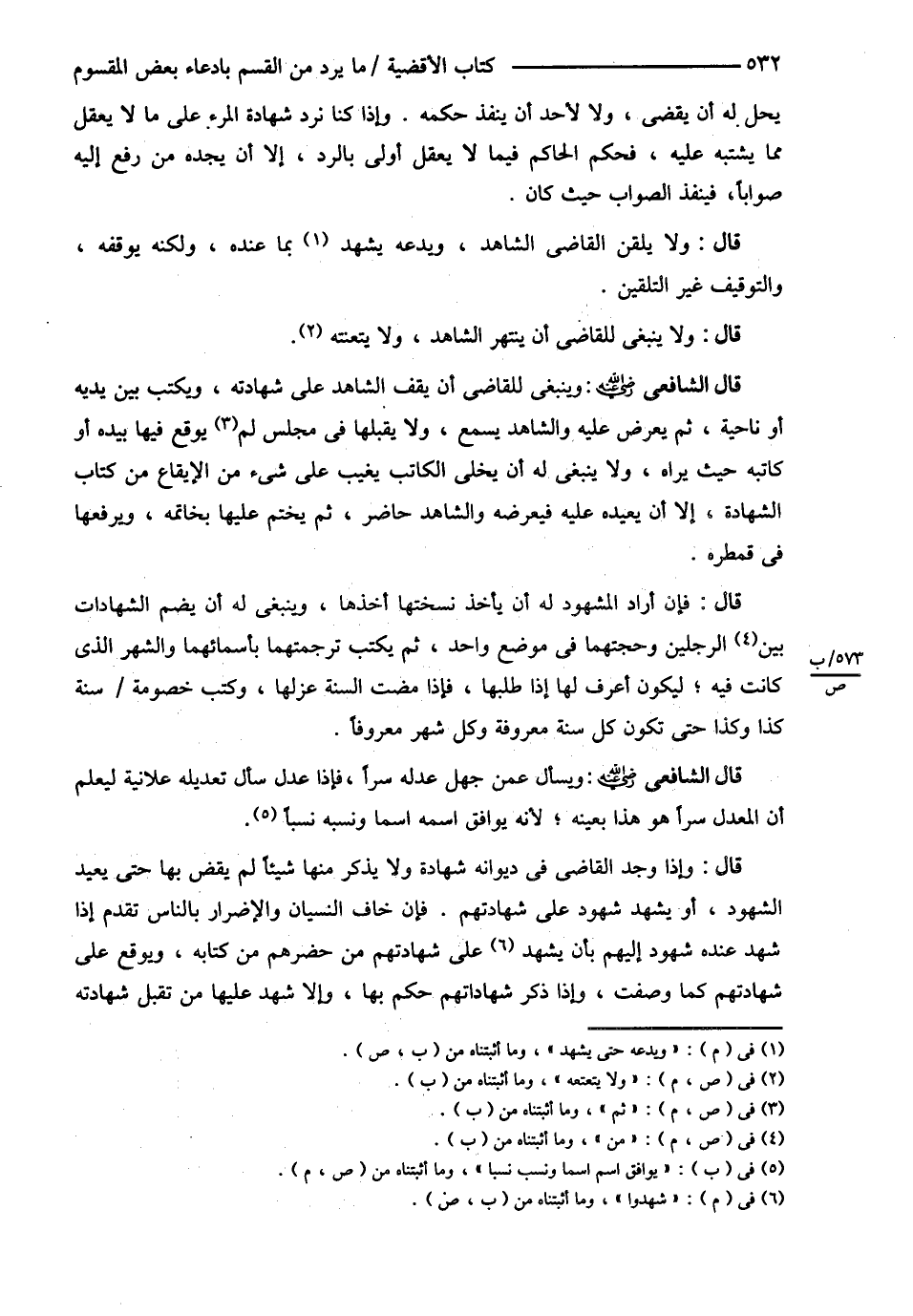 قَالَ الشَّافِعِيُّ : رحمه الله تعالى : وَيَنْبَغِي لِلْقَاضِي أَنْ يَقِفَ الشَّاهِدُ عَلَى شَهَادَتِهِ , وَيَكْتُبَ بَيْنَ يَدَيْهِ أَوْ نَاحِيَةً ثُمَّ يَعْرِضُ عَلَيْهِ , وَالشَّاهِدُ يَسْمَعُ , وَلاَ يَقْبَلُهَا فِي مَجْلِسٍ لَمْ يُوَقِّعْ فِيهَا بِيَدِهِ أَوْ كَاتِبُهُ حَيْثُ يَرَاهُ , وَلاَ يَنْبَغِي لَهُ أَنْ يُخَلِّيَ الْكَاتِبَ يَغِيبُ عَلَى شَيْءٍ مِنْ الْإِيقَاعِ مِنْ كِتَابِ الشَّهَادَةِ إلَّا أَنْ يُعِيدَهُ عَلَيْهِ فَيَعْرِضَهُ , وَالشَّاهِدُ حَاضِرٌ ثُمَّ يَخْتِمُ عَلَيْهَا بِخَاتَمِهِ , وَيَرْفَعُهَا فِي قِمَطْرِهِ ( قَالَ ) فَإِنْ أَرَادَ الْمَشْهُودُ لَهُ أَنْ يَأْخُذَ نُسْخَتَهَا أَخَذَهَا , وَيَنْبَغِي لَهُ أَنْ يَضُمَّ الشَّهَادَاتِ بَيْنَ الرَّجُلَيْنِ , وَحُجَّتَهُمَا فِي مَوْضِعٍ وَاحِدٍ ثُمَّ يَكْتُبَ تَرْجَمَتَهُمَا بِأَسْمَائِهِمَا , وَالشَّهْرَ الَّذِي كَانَتْ فِيهِ لِيَكُونَ أَعْرَفَ لَهَا إذَا طَلَبَهَا فَإِذَا مَضَتْ السَّنَةُ عَزَلَهَا , وَكَتَبَ خُصُومَةُ سَنَةِ كَذَا , وَكَذَا حَتَّى تَكُونَ كُلُّ سَنَةٍ مَعْرُوفَةً وَكُلُّ شَهْرٍ مَعْرُوفًا .