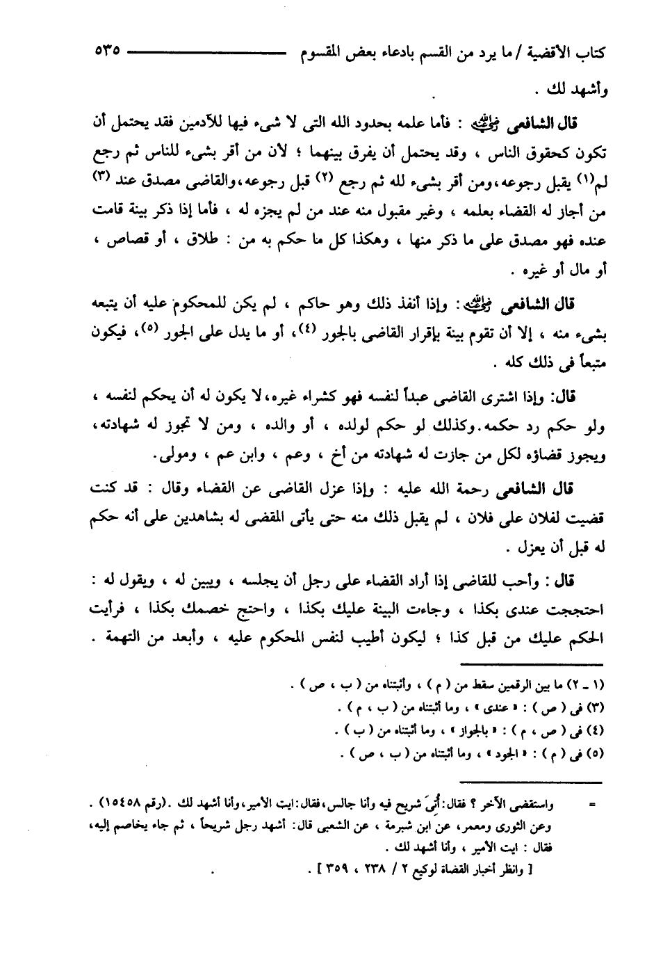 قَالَ الشَّافِعِيُّ : رحمه الله تعالى فَأَمَّا عِلْمُهُ بِحُدُودِ اللَّهِ الَّتِي لاَ شَيْءَ فِيهَا لِلْآدَمِيِّينَ فَقَدْ يَحْتَمِلُ أَنْ تَكُونَ كَحُقُوقِ النَّاسِ , وَقَدْ يَحْتَمِلُ أَنْ يُفَرِّقَ بَيْنَهُمَا لِأَنَّ مَنْ أَقَرَّ بِشَيْءٍ لِلنَّاسِ ثُمَّ رَجَعَ لَمْ يُقْبَلْ رُجُوعُهُ , وَمَنْ أَقَرَّ بِشَيْءٍ لِلَّهِ ثُمَّ رَجَعَ قَبْلَ رُجُوعِهِ , وَالْقَاضِي مُصَدَّقٌ عِنْدَ مَنْ أَجَازَ لَهُ الْقَضَاءَ بِعِلْمِهِ , وَغَيْرُ مَقْبُولٍ مِنْهُ عِنْدَ مَنْ لَمْ يُجِزْهُ لَهُ فَأَمَّا إذَا ذَكَرَ بَيِّنَةً قَامَتْ عِنْدَهُ فَهُوَ مُصَدَّقٌ عَلَى مَا ذَكَرَ مِنْهَا , وَهَكَذَا كُلُّ مَا حَكَمَ بِهِ مِنْ طَلاَقٍ أَوْ قِصَاصٍ أَوْ مَالٍ أَوْ غَيْرِهِ