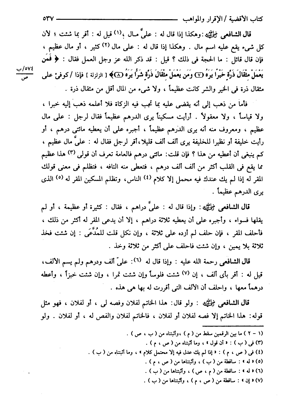 قَالَ الشَّافِعِيُّ : رحمه الله تعالى , وَهَكَذَا إذَا قَالَ لَهُ عَلَى مَالٍ قِيلَ لَهُ أَقِرَّ بِمَا شِئْت لِأَنَّ كُلَّ شَيْءٍ يَقَعُ عَلَيْهِ اسْمُ مَالٍ , وَهَكَذَا إذَا قَالَ لَهُ عَلَيَّ مَالٍ كَثِيرٍ أَوْ مَالٍ عَظِيمٍ فَإِنْ قَالَ قَائِلٌ مَا الْحُجَّةُ فِي ذَلِكَ ؟ قِيلَ قَدْ ذَكَرَ اللَّهُ عَزَّ وَجَلَّ الْعَمَلَ فَقَالَ : ? فَمَنْ يَعْمَلْ مِثْقَالَ ذَرَّةٍ خَيْرًا يَرَهُ وَمَنْ يَعْمَلْ مِثْقَالَ ذَرَّةٍ شَرًّا يَرَهُ ? فَإِذَا كُوفِئَ عَلَى مِثْقَالِ ذَرَّةٍ فِي الْخَيْرِ وَالشَّرِّ كَانَتْ عَظِيمًا , وَلاَ شَيْءَ مِنْ الْمَالِ أَقَلُّ مِنْ مِثْقَالِ ذَرَّةٍ فَأَمَّا مَنْ ذَهَبَ إلَى أَنَّهُ يَقْضِي عَلَيْهِ بِمَا تَجِبُ فِيهِ الزَّكَاةُ فَلاَ أَعْلَمُهُ ذَهَبَ إلَيْهِ خَبَرًا , وَلاَ قِيَاسًا وَلاَ مَعْقُولاً أَرَأَيْت مِسْكَيْنَا يَرَى الدِّرْهَمَ عَظِيمًا فَقَالَ لِرَجُلٍ عَلَيَّ مَالٌ عَظِيمٌ وَمَعْرُوفٌ مِنْهُ أَنَّهُ يَرَى الدِّرْهَمَ ؟ عَظِيمًا أُجْبِرُهُ عَلَى أَنْ يُعْطِيَهُ مِائَتَيْ دِرْهَمٍ , وَرَأَيْت خَلِيفَةً أَوْ نَظِيرًا لِلْخَلِيفَةِ يَرَى أَلْفَ أَلْفٍ قَلِيلاً أَقَرَّ لِرَجُلِ فَقَالَ لَهُ عَلَيَّ مَالٌ عَظِيمٌ كَمْ يَنْبَغِي أَنْ أُعْطِيَهُ مِنْ هَذَا ؟ فَإِنْ قُلْت مِائَتَيْ دِرْهَمٍ فَالْعَامَّةُ تَعْرِفُ أَنَّ قَوْلَ هَذَا عَظِيمٌ مِمَّا يَقَعُ فِي الْقَلْبِ أَكْثَرُ مِنْ أَلْفِ أَلْفِ دِرْهَمٍ فَتُعْطَى مِنْهُ التَّافِهَ فَتَظْلِمُ فِي مَعْنَى قَوْلِك الْمُقَرَّ لَهُ إذَا لَمْ يَكُ عِنْدَك فِيهِ مَحْمَلٌ إلَّا كَلاَمُ النَّاسِ , وَتَظْلِمُ الْمِسْكِينَ الْمُقِرَّ الَّذِي يَرَى الدِّرْهَمَ عَظِيمًا .