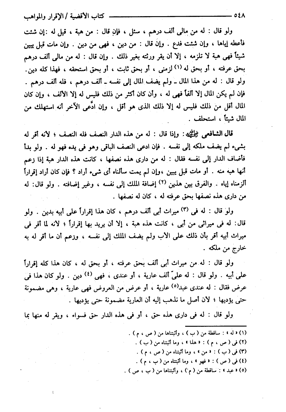 قَالَ الشَّافِعِيُّ : رحمه الله تعالى : وَإِذَا قَالَ لَهُ مِنْ هَذِهِ الدَّارِ النِّصْفُ فَلَهُ النِّصْفُ لِأَنَّهُ أَقَرَّ لَهُ بِشَيْءٍ لَمْ يُضِفْ مِلْكَهُ إلَى نَفْسِهِ فَإِنْ ادَّعَى النِّصْفَ الْبَاقِيَ , وَهُوَ فِي يَدِهِ فَهُوَ لَهُ , وَلَوْ بَدَأَ فَأَضَافَ الدَّارَ إلَى نَفْسِهِ فَقَالَ لَهُ مِنْ دَارِي هَذِهِ نِصْفُهَا كَانَتْ هَذِهِ الدَّارُ هِبَةً إذَا زَعَمَ أَنَّهَا هِبَةٌ مِنْهُ أَوْ مَاتَ قَبْلَ أَنْ يُبَيِّنَ , وَإِنْ لَمْ يَمُتْ سَأَلْنَاهُ أَيَّ شَيْءٍ أَرَادَ ؟ فَإِنْ كَانَ أَرَادَ إقْرَارًا أَلْزَمْنَاهُ إيَّاهُ , وَالْفَرْقُ بَيْنَ هَذَيْنِ إضَافَةُ الْمِلْكِ إلَى نَفْسِهِ وَغَيْرُ إضَافَتِهِ , وَلَوْ قَالَ لَهُ مِنْ دَارِي هَذِهِ نِصْفُهَا بِحَقٍّ عَرَفْته لَهُ كَانَ لَهُ نِصْفُهَا , وَلَوْ قَالَ لَهُ مِنْ مِيرَاثِ أَبِي أَلْفُ دِرْهَمٍ كَانَ هَذَا إقْرَارًا عَلَى أَبِيهِ بِدَيْنٍ , وَلَوْ قَالَ لَهُ فِي مِيرَاثِي مِنْ أَبِي كَانَتْ هَذِهِ هِبَةً إلَّا أَنْ يُرِيدَ بِهَا إقْرَارًا لِأَنَّهُ لَمَّا أَقَرَّ فِي مِيرَاثِ أَبِيهِ أَقَرَّ بِأَنَّ ذَلِكَ عَلَى الْأَبِ , وَلَمْ يُضِفْ الْمِلْكَ إلَى نَفْسِهِ , وَزَعَمَ أَنَّ مَا أَقَرَّ لَهُ بِهِ خَارِجٌ مِنْ مِلْكِهِ , وَلَوْ قَالَ لَهُ مِنْ مِيرَاثِ أَبِي أَلْفٌ بِحَقٍّ عَرَفْته أَوْ بِحَقٍّ لَهُ كَانَ هَذَا كُلُّهُ إقْرَارًا عَلَى أَبِيهِ , وَلَوْ قَالَ لَهُ عَلَيَّ أَلْفٌ عَارِيَّةً أَوْ عِنْدِي فَهِيَ دَيْنٌ , وَلَوْ كَانَ هَذَا فِي عَرْضٍ فَقَالَ لَهُ عِنْدِي عَبْدٌ عَارِيَّةً أَوْ عَرْضٌ مِنْ الْعُرُوضِ فَهِيَ عَارِيَّةٌ , وَهِيَ مَضْمُونَةٌ حَتَّى يُؤَدِّيَهَا لِأَنَّ أَصْلَ مَا نَذْهَبُ إلَيْهِ أَنَّ الْعَارِيَّةَ مَضْمُونَةٌ حَتَّى يُؤَدِّيَهَا , وَلَوْ قَالَ لَهُ فِي دَارِي هَذِهِ حَقٌّ أَوْ فِي هَذِهِ الدَّارِ حَقٌّ فَسَوَاءٌ , وَيُقِرُّ لَهُ مِنْهَا بِمَا @