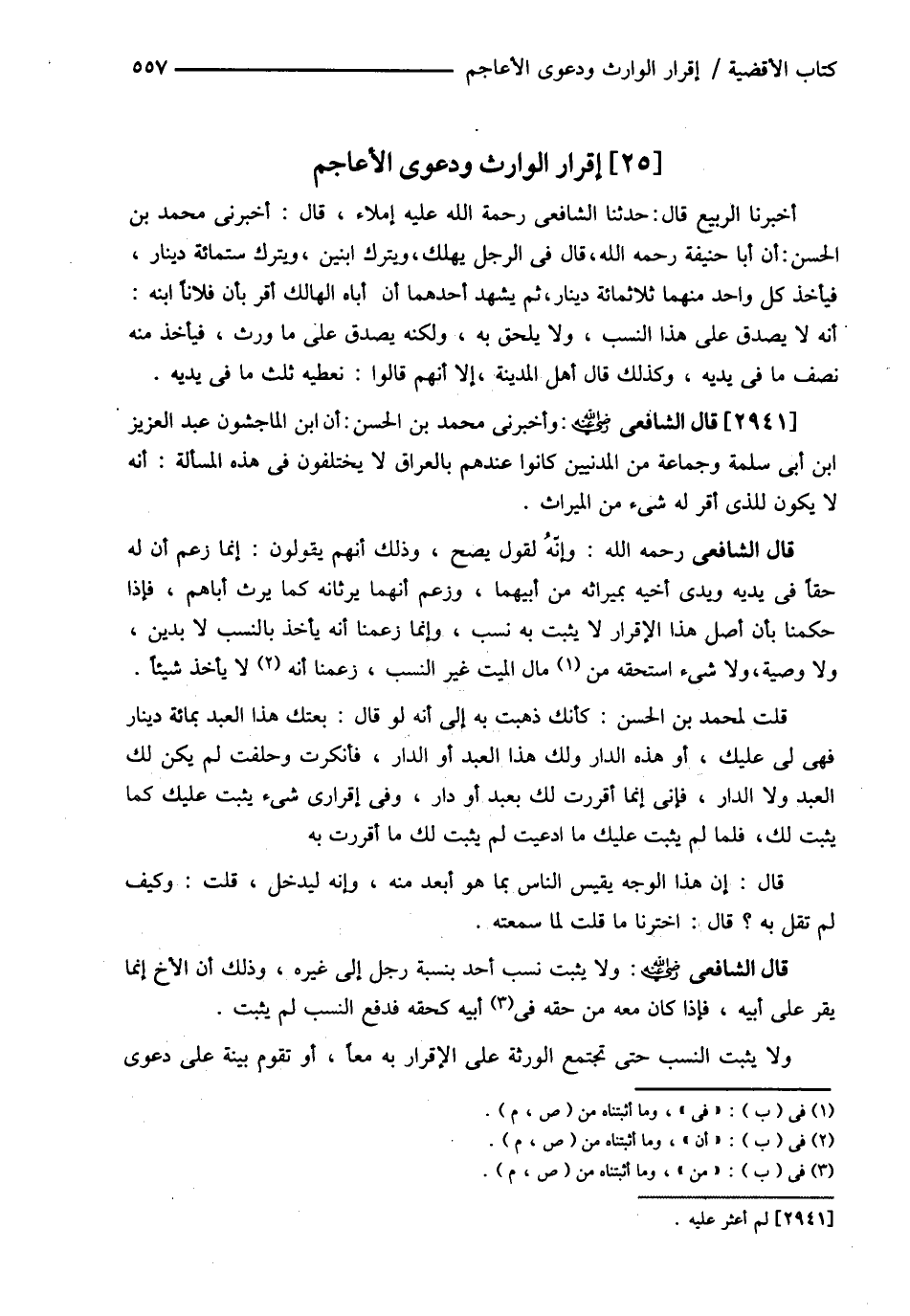 إقْرَارُ الْوَارِثِ وَدَعْوَى الْأَعَاجِمِ أَخْبَرَنَا الرَّبِيعُ قَالَ حَدَّثَنَا الشَّافِعِيُّ إمْلاَءً , قَالَ أَخْبَرَنِي مُحَمَّدُ بْنُ الْحَسَنِ أَنَّ أَبَا حَنِيفَةَ رضي الله تعالى عنه , قَالَ فِي الرَّجُلِ يَهْلَكُ , وَيَتْرُكُ ابْنَيْنِ , وَيَتْرُكُ سِتَّمِائَةِ دِينَارٍ فَيَأْخُذُ كُلُّ وَاحِدٍ مِنْهُمَا ثَلَثَمِائَةِ دِينَارٍ ثُمَّ يَشْهَدُ أَحَدُهُمَا أَنَّ أَبَاهُ الْهَالِكَ أَقَرَّ بِأَنَّ فُلاَنًا ابْنُهُ أَنَّهُ لاَ يُصَدَّقُ عَلَى هَذَا النَّسَبِ , وَلاَ يَلْحَقُ بِهِ , وَلَكِنَّهُ يُصَدَّقُ عَلَى مَا وَرِثَ فَيَأْخُذُ مِنْهُ نِصْفَ مَا فِي يَدَيْهِ , وَكَذَلِكَ قَالَ أَهْل الْمَدِينَةِ إلَّا أَنَّهُمْ قَالُوا نُعْطِيهِ ثُلُثَ مَا فِي يَدَيْهِ قَالَ الشَّافِعِيُّ ) رحمه الله تعالى وَأَخْبَرَنِي مُحَمَّدُ بْنُ الْحَسَنِ أَنَّ ابْنَ الْمَاجِشُونِ عَبْدَ الْعَزِيزِ بْنَ أَبِي سَلَمَةَ , وَجَمَاعَةً مِنْ الْمَدَنِيِّينَ كَانُوا عِنْدَهُمْ بِالْعِرَاقِ لاَ يَخْتَلِفُونَ فِي هَذِهِ الْمَسْأَلَةِ أَنَّهُ لاَ يَكُونُ لِلَّذِي أَقَرَّ لَهُ شَيْءٌ مِنْ الْمِيرَاثِ .