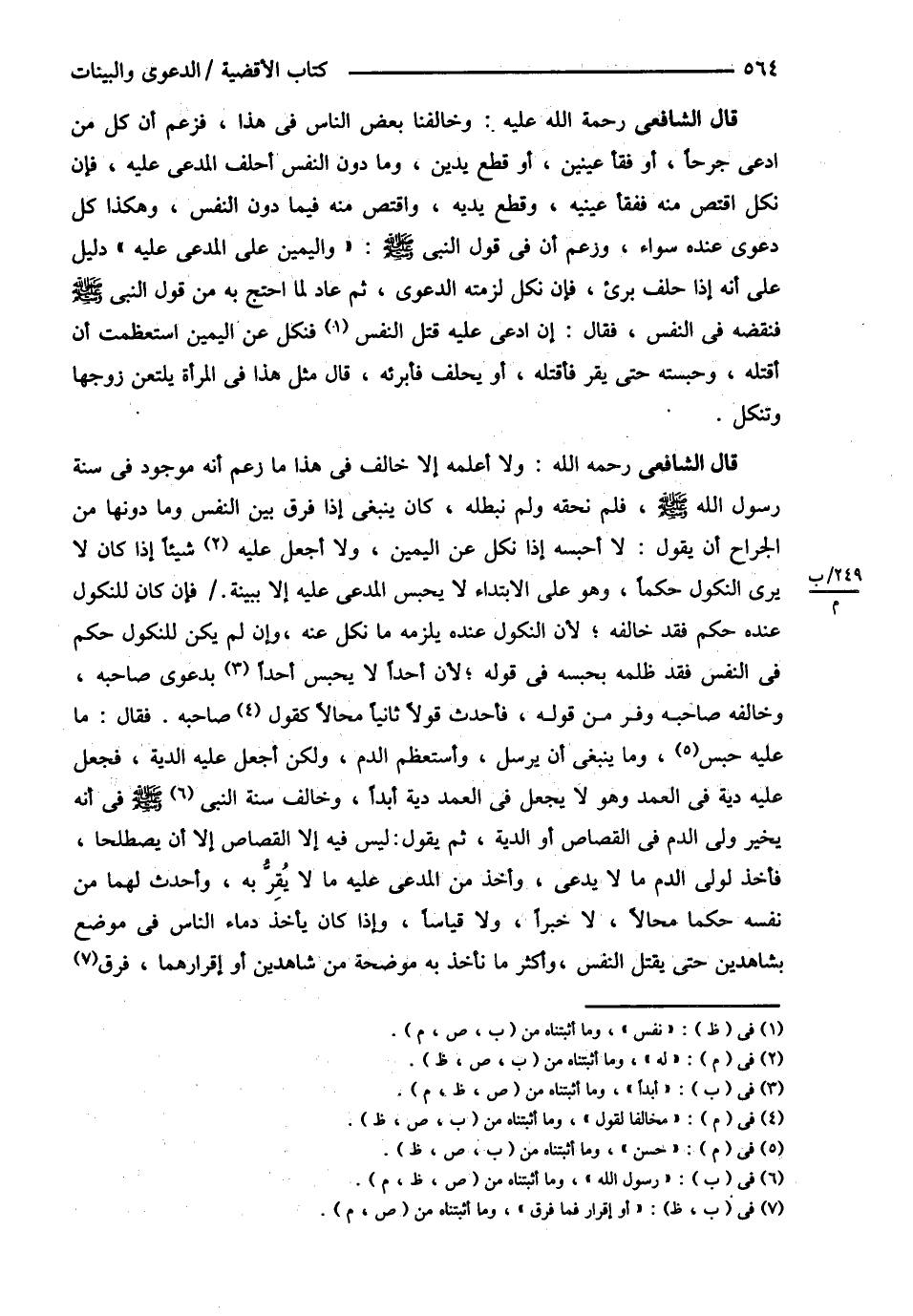 قَالَ الشَّافِعِيُّ : رحمه الله تعالى وَلاَ أَعْلَمُهُ إلَّا خَالَفَ فِي هَذَا مَا زَعَمَ أَنَّهُ مَوْجُودٌ فِي سُنَّةِ رَسُولِ اللَّهِ - صلى الله عليه وسلم - فَلَمْ نُحِقَّهُ , وَلَمْ نُبْطِلْهُ كَانَ يَنْبَغِي إذَا فَرَّقَ بَيْنَ النَّفْسِ , وَمَا دُونَهَا مِنْ الْجِرَاحِ أَنْ يَقُولَ لاَ أَحْبِسُهُ إذَا نَكَلَ عَنْ الْيَمِينِ , وَلاَ أَجْعَلُ عَلَيْهِ شَيْئًا إذَا كَانَ لاَ يَرَى النُّكُولَ حُكْمًا , وَهُوَ عَلَى الِابْتِدَاءِ لاَ يَحْبِسُ الْمُدَّعَى عَلَيْهِ إلَّا بِبَيِّنَةٍ فَإِنْ كَانَ لِلنُّكُولِ عِنْدَهُ حُكْمٌ فَقَدْ خَالَفَهُ لِأَنَّ النُّكُولَ عِنْدَهُ يَلْزَمُهُ مَا نَكَلَ عَنْهُ , وَإِنْ لَمْ يَكُنْ لِلنُّكُولِ حُكْمٌ فِي النَّفْسِ فَقَدْ ظَلَمَهُ بِحَبْسِهِ فِي قَوْلِهِ لِأَنَّ أَحَدًا لاَ يُحْبَسُ أَبَدًا بِدَعْوَى صَاحِبِهِ , وَخَالَفَهُ صَاحِبُهُ , وَفَرَّ مِنْ قَوْلِهِ فَأَحْدَثَ قَوْلاً ثَانِيًا مُحَالاً كَقَوْلِ صَاحِبِهِ فَقَالَ مَا عَلَيْهِ حَبْسٌ , وَمَا يَنْبَغِي أَنْ يُرْسِلَ , وَاسْتَعْظَمَ الدَّمَ , وَلَكِنْ أَجْعَلُ عَلَيْهِ الدِّيَةَ فَجَعَلَ عَلَيْهِ دِيَةً فِي الْعَمْدِ , وَهُوَ لاَ يَجْعَلُ فِي الْعَمْدِ دِيَةً أَبَدًا , وَخَالَفَ سُنَّةَ رَسُولِ اللَّهِ - صلى الله عليه وسلم - فِي أَنَّهُ يُخَيِّرُ وَلِيَّ الدَّمِ فِي الْقِصَاصِ أَوْ الدِّيَةِ ثُمَّ يَقُولُ لَيْسَ فِيهِ إلَّا الْقِصَاصُ إلَّا أَنْ يَصْطَلِحَا فَأَخَذَ لِوَلِيِّ الدَّمِ مَا لاَ يَدَّعِي , وَأَخَذَ مِنْ الْمُدَّعَى عَلَيْهِ مَا لاَ يُقِرُّ بِهِ , وَأَحْدَثَ لَهُمَا مِنْ نَفْسِهِ حُكْمًا مُحَالاً لاَ خَبَرًا , وَلاَ قِيَاسًا , وَإِذَا كَانَ يَأْخُذُ دِمَاءَ النَّاسِ فِي مَوْضِعٍ بِشَاهِدَيْنِ حَتَّى يَقْتُلَ النَّفْسَ , وَأَكْثَرُ مَا نَأْخُذُ بِهِ مُوضِحَةٌ مِنْ شَاهِدَيْنِ أَوْ إقْرَارٍ فَمَا فَرَّقَ@