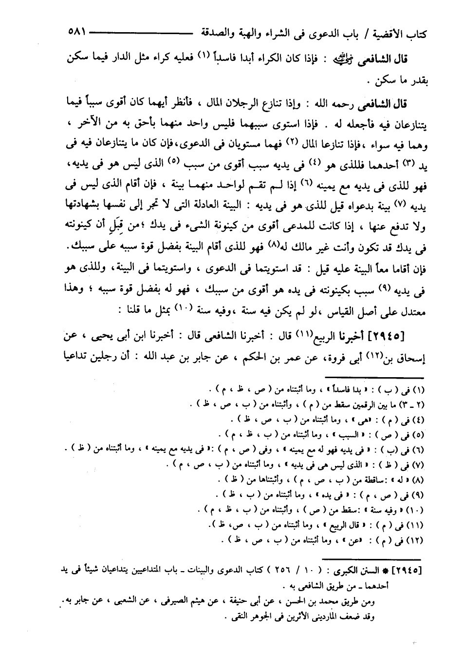قَالَ الشَّافِعِيُّ : رحمه الله تعالى وَإِذَا تَنَازَعَ الرَّجُلاَنِ الْمَالَ فَأَنْظُرُ أَيُّهُمَا كَانَ أَقْوَى سَبَبًا فِيمَا يَتَنَازَعَانِ فِيهِ فَأَجْعَلُهُ لَهُ فَإِذَا اسْتَوَى سَبَبُهُمَا فَلَيْسَ وَاحِدٌ مِنْهُمَا بِأَحَقَّ بِهِ مِنْ الْآخَرِ , وَهُمَا فِيهِ سَوَاءٌ فَإِذَا تَنَازَعَا الْمَالَ فَهُمَا مُسْتَوِيَانِ فِي الدَّعْوَى فَإِنْ كَانَ مَا يَتَنَازَعَانِ فِيهِ فِي يَدِ أَحَدِهِمَا فَلِلَّذِي هُوَ فِي يَدَيْهِ سَبَبٌ أَقْوَى مِنْ سَبَبِ الَّذِي لَيْسَ هُوَ فِي يَدَيْهِ فَهُوَ لَهُ مَعَ يَمِينِهِ إذَا لَمْ تَقُمْ لِوَاحِدٍ مِنْهُمَا بَيِّنَةٌ فَإِنْ أَقَامَ الَّذِي لَيْسَ فِي يَدَيْهِ بَيِّنَةٌ بِدَعْوَاهُ قِيلَ لِلَّذِي هُوَ فِي يَدَيْهِ الْبَيِّنَةُ الْعَادِلَةُ الَّتِي لاَ تَجْرِ إلَى نَفْسِهَا بِشَهَادَتِهَا , وَلاَ تُدْفَعُ عَنْهَا إذَا كَانَتْ لِلْمُدَّعِي أَقْوَى مِنْ كَيْنُونَةِ الشَّيْءِ فِي يَدِك مِنْ قِبَلِ أَنَّ كَيْنُونَتَهُ فِي يَدِك قَدْ تَكُونُ , وَأَنْتَ غَيْرُ مَالِكٍ فَهُوَ لِلَّذِي أَقَامَ الْبَيِّنَةَ بِفَضْلِ قُوَّةِ سَبَبِهِ عَلَى سَبَبِك فَإِنْ أَقَامَا مَعًا الْبَيِّنَةَ عَلَيْهِ قِيلَ قَدْ اسْتَوَيْتُمَا فِي الدَّعْوَى , وَاسْتَوَيْتُمَا فِي الْبَيِّنَةِ , وَلِلَّذِي هُوَ فِي يَدَيْهِ سَبَبٌ بِكَيْنُونَتِهِ فِي يَدِهِ هُوَ أَقْوَى مِنْ سَبَبِك فَهُوَ لَهُ بِفَضْلِ قُوَّةِ سَبَبِهِ , وَهَذَا مُعْتَدِلٌ عَلَى أَصْلِ الْقِيَاسِ لَوْ لَمْ يَكُنْ فِيهِ سُنَّةٌ , وَفِيهِ سُنَّةٌ بِمِثْلِ مَا قُلْنَا ( أَخْبَرَنَا الرَّبِيعُ ) قَالَ أَخْبَرَنَا الشَّافِعِيُّ قَالَ أَخْبَرَنَا ابْنُ أَبِي يَحْيَى عَنْ إِسْحَاقَ بْنِ أَبِي فَرْوَةَ عَنْ عُمَرَ بْنِ الْحَكَمِ عَنْ جَابِرِ بْنِ عَبْدِ اللَّهِ : ? أَنَّ رَجُلَيْنِ تَدَاعَيَا@