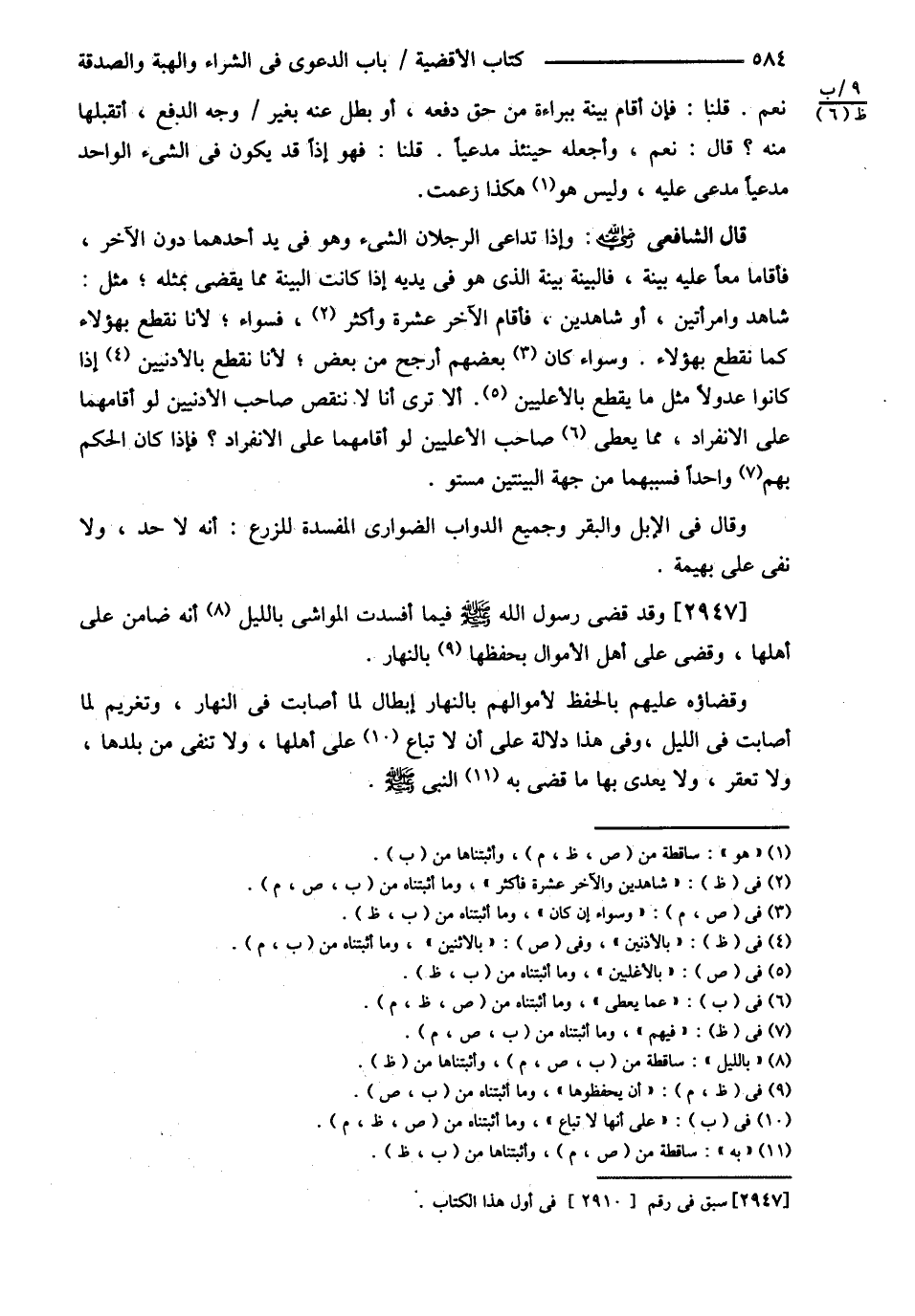 قَالَ الشَّافِعِيُّ : رحمه الله تعالى : وَإِذَا تَدَاعَى الرَّجُلاَنِ الشَّيْءَ , وَهُوَ فِي يَدِ أَحَدِهِمَا دُونَ الْآخَرِ فَأَقَامَا مَعًا عَلَيْهِ بَيِّنَةً فَالْبَيِّنَةُ بَيِّنَةُ الَّذِي هُوَ فِي يَدَيْهِ إذَا كَانَتْ الْبَيِّنَةُ مِمَّا يُقْضَى بِمِثْلِهِ مِثْلَ شَاهِدٍ وَامْرَأَتَيْنِ أَوْ شَاهِدَيْنِ فَأَقَامَ الْآخَرُ عَشَرَةً وَأَكْثَرَ فَسَوَاءٌ لِأَنَّا نَقْطَعُ بِهَؤُلاَءِ كَمَا نَقْطَعُ بِهَؤُلاَءِ , وَسَوَاءٌ كَانَ بَعْضُهُمْ أَرْجَحَ مِنْ بَعْضٍ لِأَنَّا نَقْطَعُ بِالْأَدْنَيَيْنِ إذَا كَانُوا عُدُولاً مِثْلَ مَا يُقْطَعُ بِالْأَعْلَيَيْنِ أَلاَ تَرَى أَنَّا لاَ نُنْقِصُ صَاحِبَ الْأَدْنَيَيْنِ لَوْ أَقَامَهُمَا عَلَى الِانْفِرَادِ عَمَّا يُعْطَى صَاحِبُ الْأَعْلَيَيْنِ لَوْ أَقَامَهُمَا عَلَى الِانْفِرَادِ ؟ فَإِذَا كَانَ الْحُكْمُ بِهِمْ وَاحِدًا فَسَبَبُهُمَا مِنْ جِهَةِ الْبَيِّنَتَيْنِ مُسْتَوٍ , وَقَالَ فِي الْإِبِلِ , وَالْبَقَرِ , وَجَمِيعِ الدَّوَابِّ الضَّوَارِي الْمُفْسِدَةِ لِلزَّرْعِ أَنَّهُ لاَ حَدَّ , وَلاَ نَفْيَ عَلَى بَهِيمَةٍ , وَقَدْ قَضَى رَسُولُ اللَّهِ - صلى الله عليه وسلم - فِيمَا أَفْسَدَتْ الْمَوَاشِي أَنَّهُ ضَامِنٌ عَلَى أَهْلِهَا , وَقَضَى عَلَى أَهْلِ الْأَمْوَالِ بِحِفْظِهَا بِالنَّهَارِ , وَقَضَاؤُهُ عَلَيْهِمْ بِالْحِفْظِ لِأَمْوَالِهِمْ بِالنَّهَارِ إبْطَالٌ لِمَا أَصَابَتْ فِي النَّهَارِ , وَتَغْرِيمٌ لِمَا أَصَابَتْ فِي اللَّيْلِ , وَفِي هَذَا دَلاَلَةٌ عَلَى أَنَّهَا لاَ تُبَاعُ عَلَى أَهْلِهَا , وَلاَ تُنْفَى مِنْ بَلَدِهَا , وَلاَ تُعْقَرُ , وَلاَ يُعْدَى بِهَا مَا قَضَى بِهِ النَّبِيُّ - صلى الله عليه وسلم -@