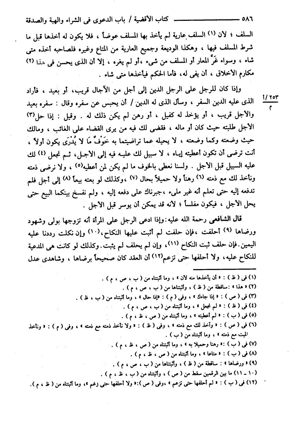 السَّلَفَ لِأَنَّ السَّلَفَ عَارِيَّةٌ لَمْ يَأْخُذْ بِهَا الْمُسَلِّفُ عِوَضًا فَلاَ يَكُونُ لَهُ أَخْذُهَا قَبْلَ مَا شَرَطَ الْمُسَلِّفُ فِيهَا , وَهَكَذَا الْوَدِيعَةُ , وَجَمِيعُ الْعَارِيَّةِ مِنْ الْمَتَاعِ , وَغَيْرِهِ فَلِصَاحِبِهِ أَخْذُهُ مَتَى شَاءَ , وَسَوَاءٌ غَرَّ الْمُعَارَ أَوْ الْمُسَلِّفَ مِنْ شَيْءٍ أَوْ لَمْ يَغُرَّهُ إلَّا أَنَّ الَّذِي يُحْسِنُ فِي هَذَا مَكَارِمَ الْأَخْلاَقِ , وَأَنْ يَفِيَ لَهُ فَأَمَّا الْحُكْمُ فَيَأْخُذُهَا مَتَى شَاءَ , وَإِذَا كَانَ لِلرَّجُلِ عَلَى الرَّجُلِ الدَّيْنُ إلَى أَجَلٍ مِنْ الْآجَالِ قَرِيبٍ أَوْ بَعِيدٍ فَأَرَادَ الَّذِي عَلَيْهِ الدَّيْنُ السَّفَرَ , وَسَأَلَ الَّذِي لَهُ الدَّيْنُ أَنْ يُحْبَسَ عَنْ سَفَرِهِ , وَقَالَ سَفَرُهُ بَعِيدٌ , وَالْأَجَلُ قَرِيبٌ أَوْ يُؤْخَذَ لَهُ كَفِيلٌ أَوْ رَهْنٌ لَمْ يَكُنْ ذَلِكَ لَهُ , وَقِيلَ إذَا حَلَّ الْأَجَلُ طَلَبْته حَيْثُ كَانَ أَوْ مَالَهُ فَقَضَى لَك فِيهِ مَنْ يَرَى الْقَضَاءَ عَلَى الْغَائِبِ , وَمَالُك حَيْثُ وَضَعْته , وَكَمَا وَضَعْته لاَ يُحِيلُهُ عَمَّا تَرَاضَيْتُمَا بِهِ خَوْفُ مَا لاَ يَدْرِي يَكُونُ أَوْ لاَ أَنْتَ تَرْضَى أَنْ تَكُونَ أَعْطَيْته إيَّاهُ لاَ سَبِيلَ لَك عَلَيْهِ فِيهِ إلَى الْأَجَلِ ثُمَّ نَجْعَلُ لَك عَلَيْهِ السَّبِيلَ قَبْلَ الْأَجَلِ , وَلَسْنَا نُعْطِي بِالْخَوْفِ مَا لَمْ يَكُنْ لِمَا أَعْطَيْته , وَلاَ تَرْضَى ذِمَّتَهُ , وَنَأْخُذُ لَك مَعَ ذِمَّتِهِ رَهْنًا , وَجَمِيلاً بِهِ , وَكَذَلِكَ لَوْ بِعْته مَتَاعًا إلَى أَجَلٍ فَلَمْ تَدْفَعْهُ إلَيْهِ حَتَّى تَعْلَمَ أَنَّهُ غَيْرُ مَلِيءٍ جَبَرْنَاك عَلَى دَفْعِهِ إلَيْهِ , وَلَمْ نَفْسَخْ بَيْنَكُمَا الْبَيْعَ حَتَّى يَحِلَّ الْأَجَلُ فَيَكُونُ مُفْلِسًا لِأَنَّهُ قَدْ يُمْكِنُ أَنْ يُوسِرَ قَبْلَ الْأَجَلِ