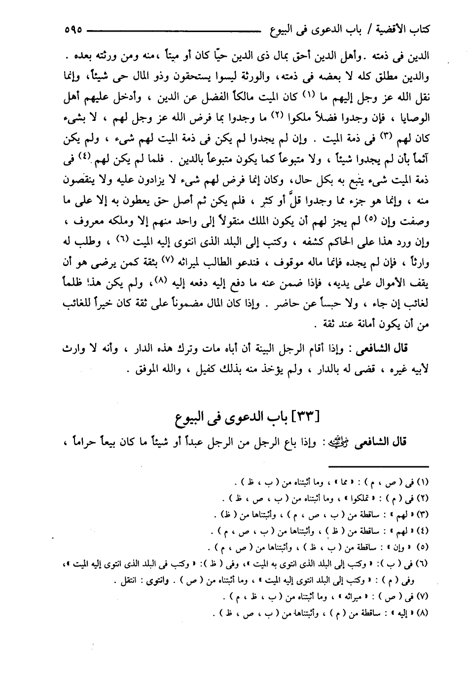 الدَّيْنِ فِي ذِمَّتِهِ , وَأَهْلُ الدَّيْنِ أَحَقُّ بِمَالِ ذِي الدَّيْنِ حَيًّا كَانَ أَوْ مَيِّتًا مِنْهُ وَمِنْ وَرَثَتِهِ بَعْدَهُ , وَالدَّيْنُ مُطْلَقٌ كُلُّهُ لاَ بَعْضُهُ فِي ذِمَّتِهِ , وَالْوَرَثَةُ لَيْسُوا يَسْتَحِقُّونَ , وَذُو الْمَالِ عَلَى شَيْءٍ , وَإِنَّمَا نَقَلَ اللَّهُ عَزَّ وَجَلَّ إلَيْهِمْ مَا كَانَ الْمَيِّتُ مَالِكًا الْفَضْلَ عَنْ الدَّيْنِ , وَأُدْخِلَ عَلَيْهِمْ أَهْلُ الْوَصَايَا فَإِنْ وَجَدُوا فَضْلاً مَلَكُوا مَا وَجَدُوا بِمَا فَرَضَ اللَّهُ عَزَّ وَجَلَّ لَهُمْ لاَ بِشَيْءٍ كَانَ فِي ذِمَّةِ الْمَيِّتِ , وَإِنْ لَمْ يَجِدُوا لَمْ يَكُنْ فِي ذِمَّةِ الْمَيِّتِ لَهُمْ شَيْءٌ , وَلَمْ يَكُنْ آثِمًا بِأَنْ لَمْ يَجِدُوا شَيْئًا , وَلاَ مَتْبُوعًا كَمَا يَكُونُ مَتْبُوعًا بِالدَّيْنِ فَلَمَّا لَمْ يَكُنْ لَهُمْ فِي ذِمَّةِ الْمَيِّتِ شَيْءٌ يُتْبَعُ بِهِ بِكُلِّ حَالٍ , وَكَانَ إنَّمَا فُرِضَ لَهُمْ شَيْءٌ لاَ يُزَادُونَ عَلَيْهِ , وَلاَ يَنْقُصُونَ مِنْهُ , إنَّمَا هُوَ جُزْءٌ مِمَّا وَجَدُوا قَلَّ أَوْ كَثُرَ فَلَمْ يَكُنْ ثَمَّ أَصْلُ حَقٍّ يُعْطُونَ بِهِ إلَّا عَلَى مَا وَصَفْت لَمْ يَجُزْ لَهُمْ أَنْ يَكُونَ الْمِلْكُ مَنْقُولاً إلَى وَاحِدٍ مِنْهُمْ إلَّا وَمِلْكُهُ مَعْرُوفٌ , وَإِنْ وَرَدَ هَذَا عَلَى الْحَاكِمِ كَشَفَهُ , وَكَتَبَ إلَى الْبَلَدِ الَّذِي انْتَوَى بِهِ الْمَيِّتُ , وَطَلَبَ لَهُ وَارِثًا , فَإِنْ لَمْ يَجِدْهُ فَإِنَّمَا مَالُهُ مَوْقُوفٌ فندعوا الطَّالِبَ لِمِيرَاثِهِ بِثِقَةٍ كَمَنْ يَرْضَى هُوَ أَنْ يَقِفَ الْأَمْوَالَ عَلَى يَدَيْهِ فَإِذَا ضَمِنَ عَنْهُ مَا دُفِعَ إلَيْهِ دَفَعَهُ إلَيْهِ , وَلَمْ يَكُنْ هَذَا ظُلْمًا لِغَائِبٍ إنْ جَاءَ , وَلاَ حَبْسًا عَنْ حَاضِرٍ , وَإِذَا كَانَ الْمَالُ مَضْمُونًا عَلَى ثِقَةٍ كَانَ خَيْرًا لِلْغَائِبِ مِنْ أَنْ يَكُونَ أَمَانَةً عِنْدَ ثِقَةٍ