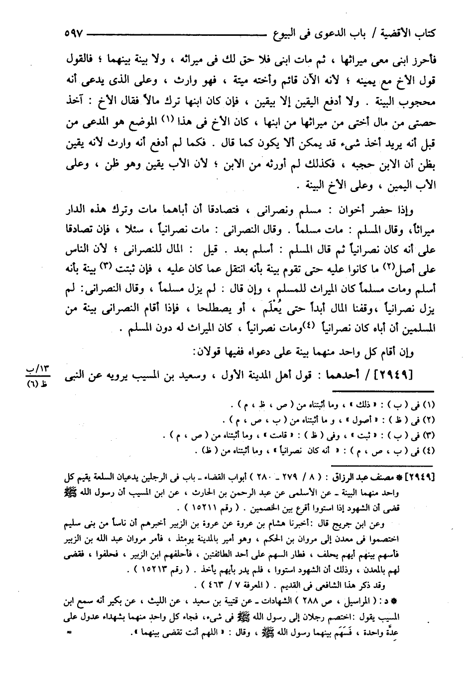 فَأَحْرَزَ ابْنِي مَعِي مِيرَاثَهَا ثُمَّ مَاتَ ابْنِي فَلاَ حَقَّ لَك فِي مِيرَاثِهِ , وَلاَ بَيِّنَةَ بَيْنَهُمَا فَالْقَوْلُ قَوْلُ الْأَخِ مَعَ يَمِينِهِ لِأَنَّهُ الْآنَ قَائِمٌ , وَأُخْتُهُ مَيِّتَةٌ فَهُوَ وَارِثٌ , وَعَلَى الَّذِي يَدَّعِي أَنَّهُ مَحْجُوبُ الْبَيِّنَةِ , وَلاَ أَدْفَعُ الْيَقِينَ إلَّا بِيَقِينٍ فَإِنْ كَانَ ابْنُهَا تَرَكَ مَالاً فَقَالَ الْأَخُ آخُذُ حِصَّتِي مِنْ مَالِ أُخْتِي مِنْ مِيرَاثِهَا مِنْ ابْنِهَا كَانَ الْأَخُ فِي ذَلِكَ الْمَوْضِعِ هُوَ الْمُدَّعِي مِنْ قِبَلِ أَنَّهُ يُرِيدُ أَخْذَ شَيْءٍ قَدْ يُمْكِنُ أَنْ لاَ يَكُونَ كَمَا قَالَ فَكَمَا لَمْ أَدْفَعْ أَنَّهُ وَارِثٌ لِأَنَّهُ يَقِينٌ بِظَنٍّ أَنَّ الِابْنَ حَجَبَهُ فَكَذَلِكَ لَمْ أُوَرِّثُهُ مِنْ الِابْنِ لِأَنَّ الْأَبَ يَقِينٌ , وَهُوَ ظَنٌّ , وَعَلَى الْأَبِ الْيَمِينُ , وَعَلَى الْأَخِ الْبَيِّنَةُ إذَا حَضَرَ أَخَوَانِ مُسْلِمٌ وَنَصْرَانِيٌّ فَتَصَادَقَا أَنَّ أَبَاهُمَا مَاتَ , وَتَرَكَ هَذِهِ الدَّارَ مِيرَاثًا , وَقَالَ الْمُسْلِمُ مَاتَ مُسْلِمًا , وَقَالَ النَّصْرَانِيُّ مَاتَ نَصْرَانِيًّا سُئِلاَ فَإِنْ تَصَادَقَا عَلَى أَنَّهُ كَانَ نَصْرَانِيًّا ثُمَّ قَالَ الْمُسْلِمُ أَسْلَمَ بَعْدُ . قِيلَ الْمَالُ لِلنَّصْرَانِيِّ لِأَنَّ النَّاسَ عَلَى أَصْلِ مَا كَانُوا عَلَيْهِ حَتَّى تَقُومَ بَيِّنَةٌ بِأَنَّهُ انْتَقَلَ عَمَّا كَانَ عَلَيْهِ فَإِنْ ثَبَتَ بَيِّنَةٌ بِأَنَّهُ أَسْلَمَ , وَمَاتَ مُسْلِمًا كَانَ الْمِيرَاثُ لِلْمُسْلِمِ , وَإِنْ قَالَ لَمْ يَزَلْ مُسْلِمًا , وَقَالَ النَّصْرَانِيُّ لَمْ يَزَلْ نَصْرَانِيًّا وَقَفْنَا الْمَالَ أَبَدًا حَتَّى يُعْلَمَ أَوْ يَصْطَلِحَا فَإِذَا أَقَامَ النَّصْرَانِيُّ بَيِّنَةً مِنْ الْمُسْلِمِينَ أَنَّهُ كَانَ نَصْرَانِيًّا , وَمَاتَ نَصْرَانِيًّا كَانَ الْمِيرَاثُ لَهُ دُونَ الْمُسْلِمِ . وَإِنْ أَقَامَ كُلُّ وَاحِدٍ مِنْهُمَا بَيِّنَةً عَلَى دَعْوَاهُ فَفِيهَا قَوْلاَنِ أَحَدُهُمَا قَوْلُ أَهْلِ الْمَدِينَةِ الْأَوَّلُ وَسَعِيدُ بْنُ الْمُسَيِّبِ يَرْوِيهِ عَنْ النَّبِيِّ@
