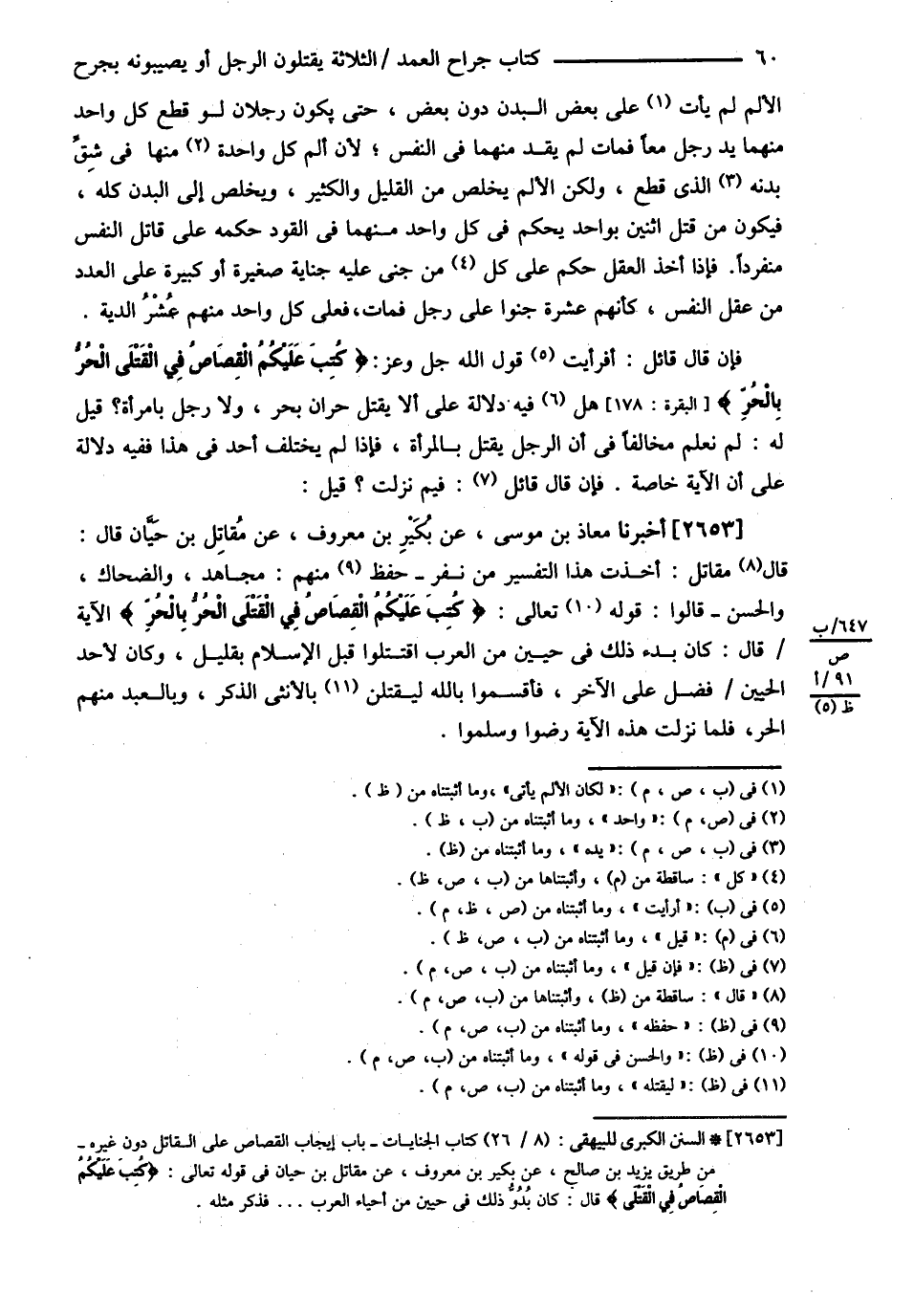 الْأَلَمُ يَأْتِي عَلَى بَعْضِ الْبَدَنِ دُونَ بَعْضٍ حَتَّى يَكُونَ رَجُلاَنِ لَوْ قَطَعَ كُلُّ وَاحِدٍ مِنْهُمَا يَدَ رَجُلٍ مَعًا فَمَاتَ لَمْ يُقَدْ مِنْهُمَا فِي النَّفْسِ ; لِأَنَّ أَلَمَ كُلِّ وَاحِدَةٍ مِنْهَا فِي شَقِّ يَدِهِ الَّذِي قَطَعَ وَلَكِنَّ الْأَلَمَ يَخْلُصُ مِنْ الْقَلِيلِ وَالْكَثِيرِ وَيَخْلُصُ إلَى الْبَدَنِ كُلِّهِ فَيَكُونُ مَنْ قَتَلَ اثْنَيْنِ بِوَاحِدٍ يَحْكُمُ فِي كُلِّ وَاحِدٍ مِنْهُمَا فِي الْقَوَدِ حُكْمَهُ عَلَى قَاتِلِ النَّفْسِ مُنْفَرِدًا فَإِذَا أَخَذَ الْعَقْلَ حَكَمَ عَلَى كُلِّ مَنْ جَنَى عَلَيْهِ جِنَايَةً صَغِيرَةً أَوْ كَبِيرَةً عَلَى الْعَدَدِ مِنْ عَقْلِ النَّفْسِ كَأَنَّهُمْ عَشْرَةٌ جَنَوْا عَلَى رَجُلٍ فَمَاتَ فَعَلَى كُلِّ وَاحِدٍ مِنْهُمْ عُشْرُ الدِّيَةِ . فَإِنْ قَالَ قَائِلٌ : أَرَأَيْت قَوْلَ اللَّهِ عَزَّ وَجَلَّ : ? كُتِبَ عَلَيْكُمْ الْقِصَاصُ فِي الْقَتْلَى الْحُرُّ بِالْحُرِّ ? هَلْ فِيهِ دَلاَلَةٌ عَلَى أَنْ لاَ يُقْتَلَ حُرَّانِ بِحُرٍّ وَلاَ رَجُلٌ بِامْرَأَةٍ ؟ قِيلَ لَهُ : لَمْ نَعْلَمْ مُخَالِفًا فِي أَنَّ الرَّجُلَ يُقْتَلُ بِالْمَرْأَةِ فَإِذَا لَمْ يَخْتَلِفْ أَحَدٌ فِي هَذَا فَفِيهِ دَلاَلَةٌ عَلَى أَنَّ الْآيَةَ خَاصَّةٌ . فَإِنْ قَالَ قَائِلٌ : فِيمَ نَزَلَتْ ؟ قِيلَ : أَخْبَرَنَا مُعَاذُ بْنُ مُوسَى عَنْ بُكَيْرِ بْنِ مَعْرُوفٍ عَنْ مُقَاتِلِ بْنِ حَيَّانَ قَالَ : قَالَ مُقَاتِلٌ أَخَذْت هَذَا التَّفْسِيرَ مِنْ نَفَرٍ حَفِظَ مِنْهُمْ مُجَاهِدٌ وَالضَّحَّاكُ وَالْحَسَنُ قَالُوا قوله تعالى : ? كُتِبَ عَلَيْكُمْ الْقِصَاصُ فِي الْقَتْلَى ? الآيَةَ. , قَالَ : كَانَ بَدْءُ ذَلِكَ فِي حَيَّيْنِ مِنْ الْعَرَبِ اقْتَتَلُوا قَبْلَ الْإِسْلاَمِ بِقَلِيلٍ وَكَانَ لِأَحَدِ الْحَيَّيْنِ فَضْلٌ عَلَى الْآخَرِ فَأَقْسَمُوا بِاَللَّهِ لِيَقْتُلُنَّ بِالْأُنْثَى الذَّكَرَ وَبِالْعَبْدِ مِنْهُمْ الْحُرَّ فَلَمَّا نَزَلَتْ هَذِهِ الْآيَةَ رَضُوا وَسَلَّمُوا .@