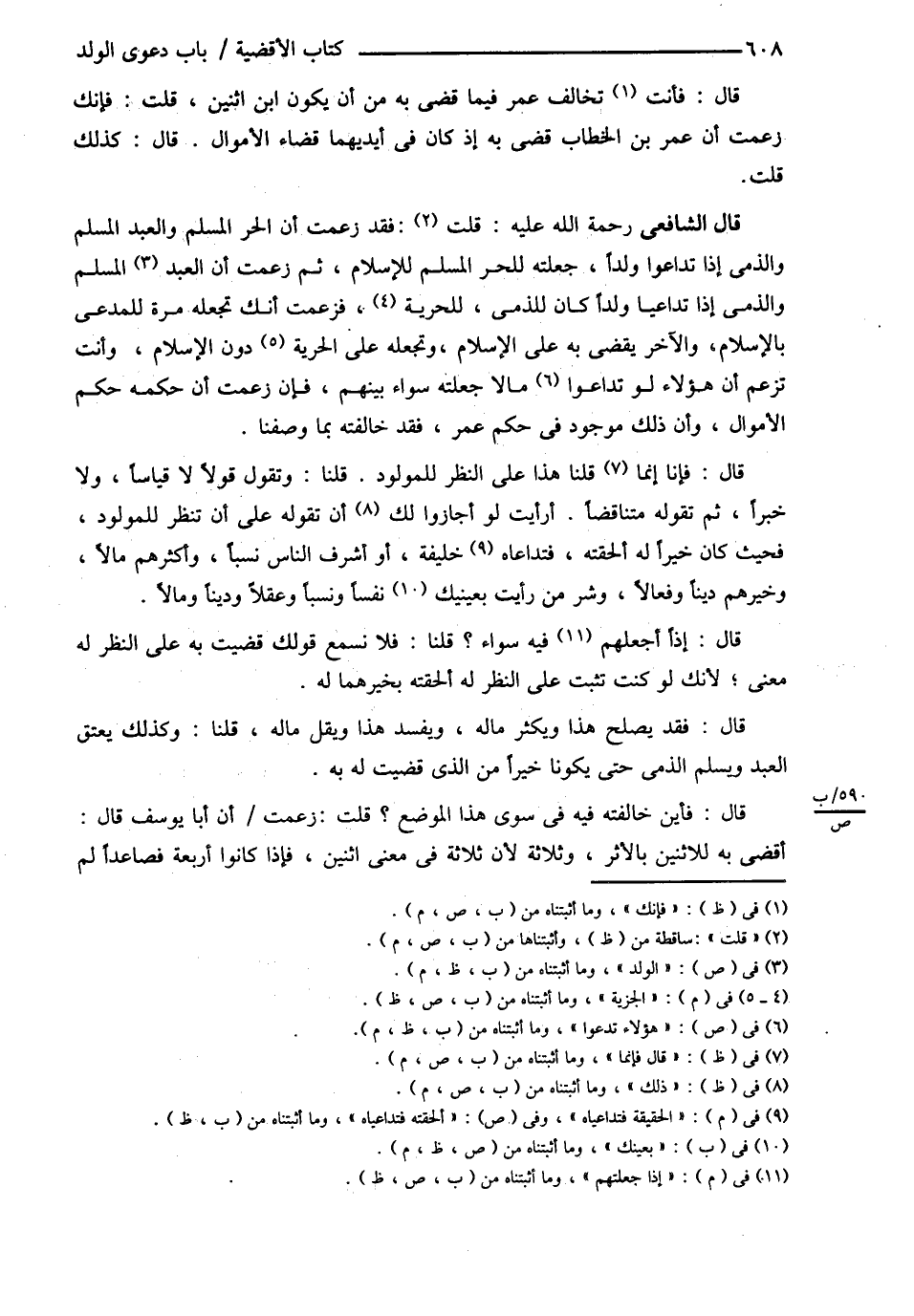 قَالَ الشَّافِعِيُّ : رحمه الله تعالى : قُلْت فَقَدْ زَعَمْت أَنَّ الْحُرَّ الْمُسْلِمَ , وَالْعَبْدَ الْمُسْلِمَ , وَالذِّمِّيَّ إذَا تَدَاعَوْا وَلَدًا جَعَلْته لِلْحُرِّ الْمُسْلِمِ لِلْإِسْلاَمِ ثُمَّ زَعَمْت أَنَّ الْعَبْدَ الْمُسْلِمَ وَالذِّمِّيَّ إذَا تَدَاعَيَا وَلَدًا كَانَ لِلذِّمِّيِّ لِلْحُرِّيَّةِ فَزَعَمْت أَنَّك تَجْعَلُهُ مَرَّةً لِلْمُدَّعِي بِالْإِسْلاَمِ , وَالْآخَرُ يَقْضِي بِهِ عَلَى الْإِسْلاَمِ , وَتَجْعَلُهُ عَلَى الْحُرِّيَّةِ دُونَ الْإِسْلاَمِ , وَأَنْتَ تَزْعُمُ أَنَّ هَؤُلاَءِ لَوْ تَدَاعَوْا مَالاً جَعَلْته سَوَاءً بَيْنَهُمْ فَإِنْ زَعَمْت أَنَّ حُكْمَهُ حُكْمُ الْأَمْوَالِ , وَأَنَّ ذَلِكَ مَوْجُودٌ فِي حُكْمِ عُمَرَ فَقَدْ خَالَفْته بِمَا وَصَفْنَا ( قَالَ ) فَإِنَّا إنَّمَا قُلْنَا هَذَا عَلَى النَّظَرِ لِلْمَوْلُودِ . قُلْنَا , وَتَقُولُ قَوْلاً لاَ قِيَاسًا , وَلاَ خَبَرًا ثُمَّ تَقُولُهُ مُتَنَاقِضًا أَرَأَيْت لَوْ أَجَازُوا لَك أَنْ تَقُولَهُ عَلَى أَنْ تَنْظُرَ لِلْمَوْلُودِ فَحَيْثُ كَانَ خَيْرًا لَهُ أَلْحَقْته فَتَدَاعَاهُ خَلِيفَةٌ أَوْ أَشْرَفُ النَّاسِ نَسَبًا , وَأَكْثَرُهُمْ مَالاً , وَخَيْرُهُمْ دِينًا وَفِعَالاً , وَشَرُّ مَنْ رَأَيْت بِعَيْنِك نَفْسًا , وَنَسَبًا , وَعَقْلاً , وَدِينًا , وَمَالاً ( قَالَ ) إذًا أَجْعَلُهُمْ فِيهِ سَوَاءً ؟ قُلْنَا فَلاَ نَسْمَعُ قَوْلَك قَضَيْت بِهِ عَلَى النَّظَرِ لَهُ مَعْنًى لِأَنَّك لَوْ كُنْت تُثْبِتُ عَلَى النَّظَرِ لَهُ أَلْحَقْته بِخَيْرِهِمَا لَهُ . ( قَالَ ) فَقَدْ يَصْلُحُ هَذَا , وَيَكْثُرُ مَالُهُ , وَيَفْسُدُ هَذَا , وَيَقِلُّ مَالُهُ قُلْنَا , وَكَذَلِكَ يَعْتِقُ الْعَبْدُ , وَيُسْلَمُ الذِّمِّيُّ حَتَّى يَكُونَا خَيْرًا مِنْ الَّذِي قَضَيْت لَهُ بِهِ ( قَالَ ) فَأَيْنَ خَالَفْته فِيهِ فِي سِوَى هَذَا الْمَوْضِعِ ؟ قُلْت زَعَمْت أَنَّ أَبَا يُوسُفَ رحمه الله تعالى قَالَ : أَقْضِي بِهِ لِلِاثْنَيْنِ بِالْأَثَرِ , وَثَلاَثَةٍ لِأَنَّ ثَلاَثَةً فِي مَعْنَى اثْنَيْنِ فَإِذَا كَانُوا أَرْبَعَةً فَصَاعِدًا لَمْ @