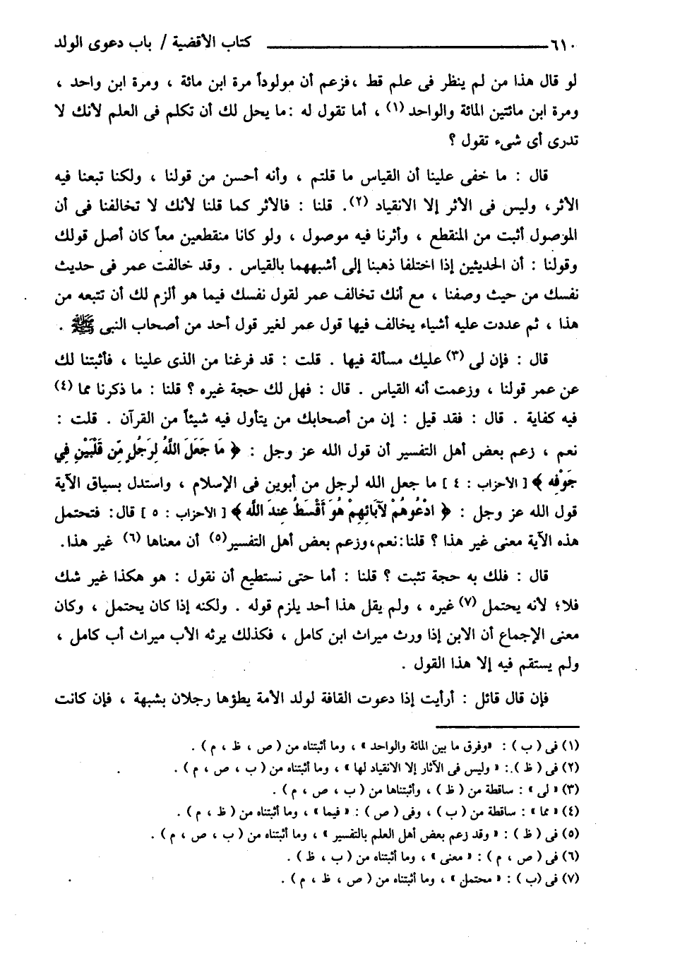 لَوْ قَالَ هَذَا مَنْ لَمْ يَنْظُرْ فِي عِلْمٍ قَطُّ فَزَعَمَ أَنَّ مَوْلُودًا مَرَّةً ابْنُ مِائَةٍ وَمَرَّةً ابْنُ وَاحِدٍ , وَفَرْقٌ مَا بَيْنَ الْمِائَةِ وَالْوَاحِدِ أَمَا تَقُولُ لَهُ مَا يَحِلُّ لَك أَنْ تَكَلَّمَ فِي الْعِلْمِ لِأَنَّك لاَ تَدْرِي أَيَّ شَيْءٍ تَقُولُ قَالَ مَا خَفِيَ عَلَيْنَا أَنَّ الْقِيَاسَ مَا قُلْتُمْ , وَأَنَّهُ أَحْسَنُ مِنْ قَوْلِنَا , وَلَكِنَّا تَبِعْنَا فِيهِ الْأَثَرَ , وَلَيْسَ فِي الْأَثَرِ إلَّا الِانْقِيَادُ . قُلْنَا فَالْأَثَرُ كَمَا قُلْنَا لِأَنَّك لاَ تُخَالِفُنَا فِي أَنَّ الْمَوْصُولَ أَثْبَتُ مِنْ الْمُنْقَطِعِ , وَأَثَرُنَا فِيهِ مَوْصُولٌ . وَلَوْ كَانَا مُنْقَطِعَيْنِ مَعًا كَانَ أَصْلُ قَوْلِك , وَقَوْلِنَا إنَّ الْحَدِيثَيْنِ إذَا اخْتَلَفَا ذَهَبْنَا إلَى أَشْبَهِهِمَا بِالْقِيَاسِ . وَقَدْ خَالَفْت عُمَرَ فِي حَدِيثِ نَفْسِك مِنْ حَيْثُ وَصَفْنَا مَعَ أَنَّك تُخَالِفُ عُمَرَ لِقَوْلِ نَفْسِك فِيمَا هُوَ أَلْزَمُ لَك أَنْ تَتَّبِعَهُ مِنْ هَذَا ثُمَّ عَدَدْت عَلَيْهِ أَشْيَاءَ يُخَالِفُ فِيهَا قَوْلَ عُمَرَ لِغَيْرِ قَوْلِ أَحَدٍ مِنْ أَصْحَابِ النَّبِيِّ - صلى الله عليه وسلم - قَالَ فَإِنَّ لِي عَلَيْك مَسْأَلَةً فِيهَا قُلْت قَدْ فَرَغْنَا مِنْ الَّذِي عَلَيْنَا فَأَثْبَتْنَا لَك عَنْ عُمَرَ قَوْلِنَا , وَزَعَمْت أَنَّهُ الْقِيَاسُ قَالَ فَهَلْ لَك حُجَّةٌ غَيْرُهُ ؟ قُلْنَا مَا ذَكَرْنَا فِيهِ كِفَايَةٌ . قَالَ فَقَدْ قِيلَ إنَّ مِنْ أَصْحَابِك مَنْ يَتَأَوَّلُ فِيهِ شَيْئًا مِنْ الْقُرْآنِ . قُلْت : نَعَمْ زَعَمَ بَعْضُ أَهْلِ التَّفْسِيرِ أَنَّ قَوْلَ اللَّهِ عَزَّ وَجَلَّ : ? مَا جَعَلَ اللَّهُ لِرَجُلٍ مِنْ قَلْبَيْنِ فِي جَوْفِهِ ? مَا جَعَلَ اللَّهُ لِرَجُلٍ مِنْ أَبَوَيْنِ فِي الْإِسْلاَمِ , وَاسْتَدَلَّ بِسِيَاقِ الآيَةِ قَوْلِ اللَّهِ عَزَّ وَجَلَّ : ? اُدْعُوهُمْ لِآبَائِهِمْ هُوَ أَقْسَطُ عِنْدَ اللَّهِ ? قَالَ فَتَحْتَمِلُ هَذِهِ الْآيَةُ مَعْنًى غَيْرَ هَذَا ؟ قُلْنَا نَعَمْ زَعَمَ بَعْضُ أَهْلِ التَّفْسِيرِ أَنَّ مَعْنَاهَا غَيْرُ هَذَا قَالَ فَلَكَ بِهِ حُجَّةٌ تَثْبُتُ قُلْنَا أَمَا حَتَّى نَسْتَطِيعَ أَنْ نَقُولَ هُوَ هَكَذَا غَيْرُ شَكٍّ فَلاَ لِأَنَّهُ مُحْتَمِلٌ غَيْرَهُ , وَلَمْ يَقُلْ هَذَا أَحَدٌ يَلْزَمُ قَوْلُهُ . وَلَكِنَّهُ إذَا كَانَ يَحْتَمِلُ , وَكَانَ مَعْنَى الْإِجْمَاعِ أَنَّ الِابْنَ إذَا وَرِثَ مِيرَاثَ ابْنٍ كَامِلٍ فَكَذَلِكَ يَرِثُهُ الْأَبُ مِيرَاثَ أَبٍ كَامِلٍ لَمْ يَسْتَقِمْ فِيهِ إلَّا هَذَا الْقَوْلُ فَإِنْ قَالَ قَائِلٌ أَرَأَيْت إذَا دَعَوْت الْقَافَةَ لِوَلَدِ الْأَمَةِ يَطَؤُهَا رَجُلاَنِ بِشُبْهَةٍ فَإِنْ كَانَتْ@