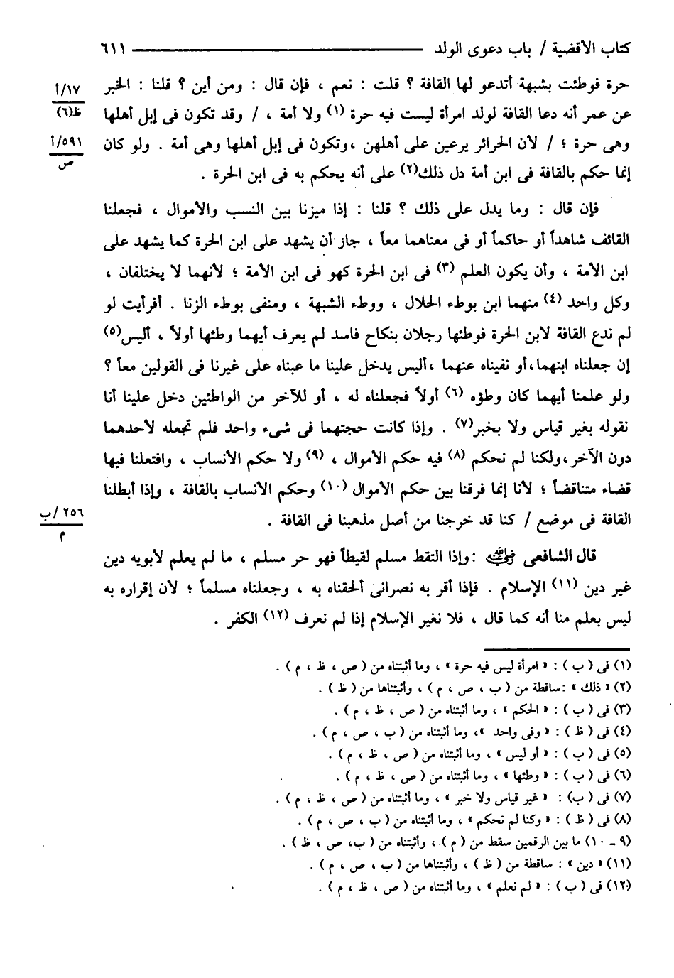 حُرَّةً فَوُطِئَتْ بِشُبْهَةٍ أَتَدْعُو لَهَا الْقَافَةَ ؟ قُلْت نَعَمْ فَإِنْ قَالَ , وَمِنْ أَيْنَ ؟ قُلْنَا الْخَبَرُ عَنْ عُمَرَ أَنَّهُ دَعَا الْقَافَةَ لِوَلَدِ امْرَأَةٍ لَيْسَ فِيهِ حُرَّةٍ , وَقَدْ تَكُونُ فِي إبِلِ أَهْلِهَا , وَهِيَ حُرَّةٌ لِأَنَّ الْحَرَائِرَ يَرْعَيْنَ عَلَى أَهْلِهِنَّ , وَتَكُونُ فِي إبِلِ أَهْلِهَا , وَهِيَ أَمَةٌ , وَلَوْ كَانَ إنَّمَا حَكَمَ بِالْقَافَةِ فِي ابْنِ أَمَةٍ دَلَّ عَلَى أَنَّهُ يُحْكَمُ بِهِ فِي ابْنِ الْحُرَّةِ فَإِنْ قَالَ , وَمَا يَدُلُّ عَلَى ذَلِكَ ؟ قُلْنَا إذَا مَيَّزْنَا بَيْنَ النَّسَبِ وَالْأَمْوَالِ فَجَعَلْنَا الْقَائِفَ شَاهِدًا أَوْ حَاكِمًا أَوْ فِي مَعْنَاهُمَا مَعًا جَازَ أَنْ يَشْهَدَ عَلَى ابْنِ الْحُرَّةِ كَمَا يَشْهَدُ عَلَى ابْنِ الْأَمَةِ , وَأَنْ يَكُونَ الْحُكْمُ فِي ابْنِ الْحُرَّةِ كَهُوَ فِي ابْنِ الْأَمَةِ لِأَنَّهُمَا لاَ يَخْتَلِفَانِ , وَكُلُّ وَاحِدٍ مِنْهُمَا ابْنٌ بِوَطْءِ الْحَلاَلِ , وَوَطْءِ الشُّبْهَةِ , وَمَنْفِيٌّ بِوَطْءِ الزِّنَا . أَفَرَأَيْت لَوْ لَمْ نَدْعُ الْقَافَةَ لِابْنِ الْحُرَّةِ فَوَطِئَهَا رَجُلاَنِ بِنِكَاحٍ فَاسِدٍ لَمْ يُعْرَفْ أَيُّهُمَا وَطِئَهَا أَوَّلاً أَوْ لَيْسَ إنْ جَعَلْنَاهُ ابْنَهُمَا أَوْ نَفَيْنَاهُ عَنْهُمَا أَلَيْسَ يَدْخُلُ عَلَيْنَا مَا عِبْنَاهُ عَلَى غَيْرِنَا فِي الْقَوْلَيْنِ مَعًا ؟ وَلَوْ عَلِمْنَا أَيُّهُمَا كَانَ , وَطِئَهَا أَوَّلاً فَجَعَلْنَاهُ لَهُ أَوْ لِلْآخَرِ مِنْ الْوَاطِئَيْنِ دَخَلَ عَلَيْنَا أَنَّا نَقُولُهُ غَيْرَ قِيَاسٍ , وَلاَ خَبَرٍ , وَإِذَا كَانَتْ حُجَّتُهُمَا فِي شَيْءٍ وَاحِدٍ فَلَمْ تَجْعَلْهُ لِأَحَدِهِمَا دُونَ الْآخَرِ , وَلَكِنَّا لَمْ نَحْكُمْ فِيهِ حُكْمَ الْأَمْوَالِ , وَلاَ حُكْمَ الْأَنْسَابِ , وَافْتَعَلْنَا فِيهَا قَضَاءً مُتَنَاقِضًا لِأَنَّا إنَّمَا فَرَّقْنَا بَيْنَ حُكْمِ الْأَمْوَالِ , وَحُكْمِ الْأَنْسَابِ بِالْقَافَةِ , وَإِذَا أَبْطَلْنَا الْقَافَةَ فِي مَوْضِعٍ كُنَّا قَدْ خَرَجْنَا مِنْ أَصْلِ مَذْهَبِنَا فِي الْقَافَةِ