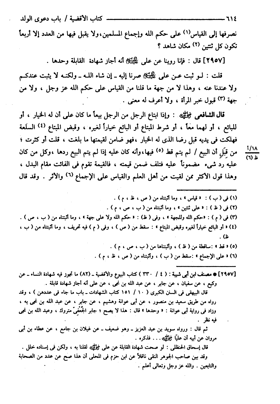 لَمْ نَصْرِفْهَا إلَى قِيَاسٍ عَلَى حُكْمِ اللَّهِ وَإِجْمَاعِ الْمُسْلِمِينَ , وَلاَ يُقْبَلُ فِيهَا مِنْ الْعَدَدِ إلَّا أَرْبَعًا تَكُونُ كُلُّ ثِنْتَيْنِ مَكَانَ شَاهِدٍ ؟ قَالَ فَإِنَّا رَوَيْنَا عَنْ عَلِيٍّ رضي الله تعالى عنه أَنَّهُ أَجَازَ شَهَادَةَ الْقَابِلَةِ , وَحْدَهَا قُلْت لَوْ ثَبَتَ عَنْ عَلِيٍّ رضي الله تعالى عنه صِرْنَا إلَيْهِ إنْ شَاءَ اللَّهُ تَعَالَى وَلَكِنَّهُ لاَ يَثْبُتُ عِنْدَكُمْ , وَلاَ عِنْدَنَا عَنْهُ , وَهَذَا لاَ مِنْ جِهَةِ مَا قُلْنَا مِنْ الْقِيَاسِ عَلَى حُكْمِ اللَّهِ , وَلاَ مِنْ جِهَةِ قَبُولِ خَبَرِ الْمَرْأَةِ , وَلاَ أَعْرِفُ لَهُ مَعْنًى