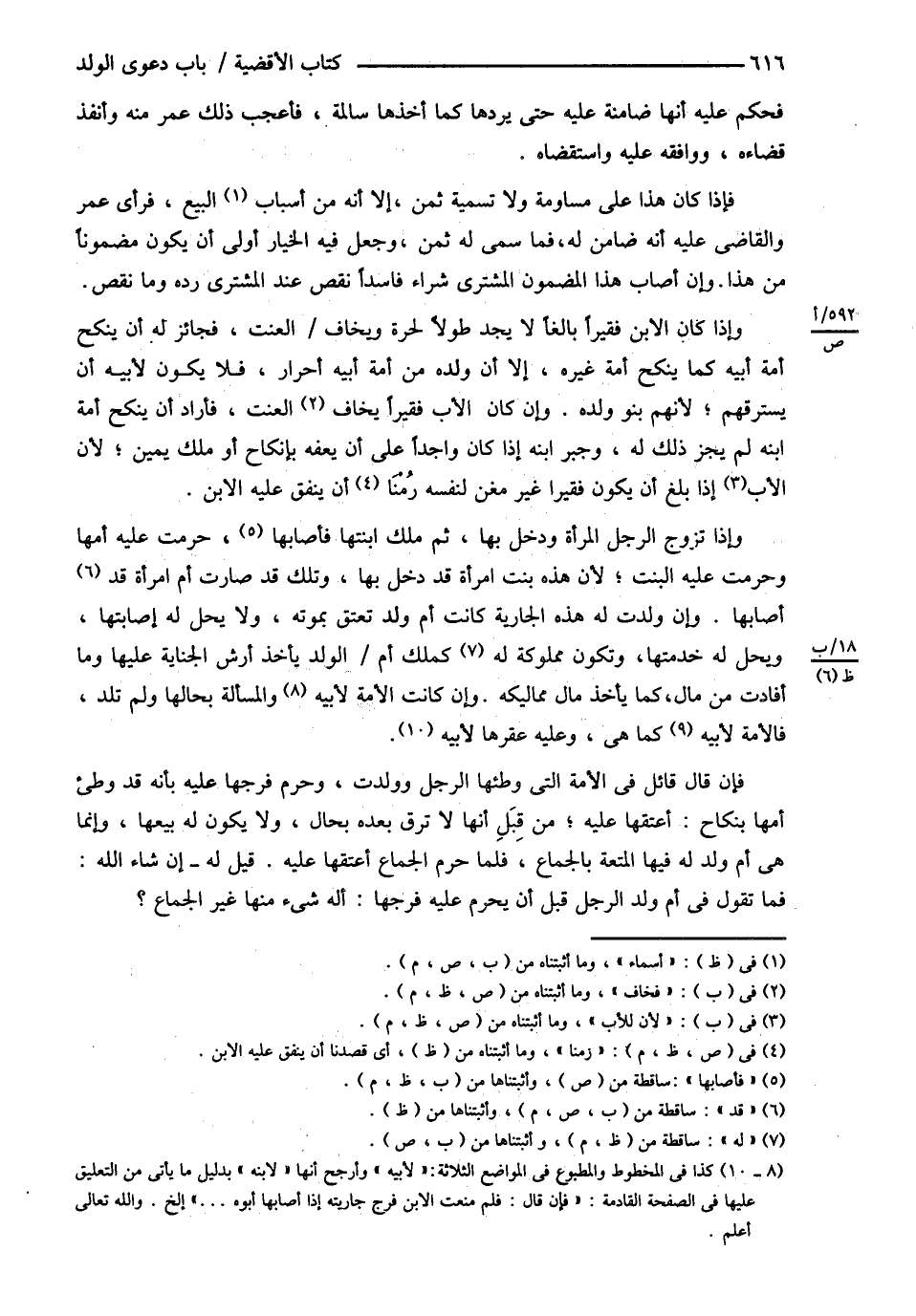 فَحَكَمَ عَلَيْهِ أَنَّهَا ضَامِنَةٌ عَلَيْهِ حَتَّى يَرُدَّهَا كَمَا أَخَذَهَا سَالِمَةً فَأَعْجَبَ ذَلِكَ عُمَرُ مِنْهُ , وَأَنْفَذَ قَضَاءَهُ , وَوَافَقَهُ عَلَيْهِ , وَاسْتَقْضَاهُ فَإِذَا كَانَ هَذَا عَلَى مُسَاوَمَةٍ , وَلاَ تَسْمِيَةِ ثَمَنٍ إلَّا أَنَّهُ مِنْ أَسْبَابِ الْبَيْعِ فَرَأَى عُمَرُ , وَالْقَاضِي عَلَيْهِ أَنَّهُ ضَامِنٌ لَهُ , فَمَا سُمِّيَ لَهُ ثَمَنٌ , وَجُعِلَ فِيهِ الْخِيَارُ أَوْلَى أَنْ يَكُونَ مَضْمُونًا مِنْ هَذَا , وَإِنْ أَصَابَ هَذَا الْمَضْمُونَ الْمُشْتَرِي شِرَاءً فَاسِدًا نَقَصَ عِنْدَ الْمُشْتَرِي رَدَّهُ , وَمَا نَقَصَ , وَإِذَا كَانَ الِابْنُ فَقِيرًا بَالِغًا لاَ يَجِدُ طَوْلاً لِحُرَّةٍ , وَيَخَافُ الْعَنَتَ فَجَائِزٌ لَهُ أَنْ يَنْكِحَ أَمَةَ أَبِيهِ كَمَا يَنْكِحُ أَمَةَ غَيْرِهِ إلَّا أَنَّ وَلَدَهُ مِنْ أَمَةِ أَبِيهِ أَحْرَارٌ فَلاَ يَكُونُ لِأَبِيهِ أَنْ يَسْتَرِقَّهُمْ لِأَنَّهُمْ بَنُو وَلَدِهِ , وَإِنْ كَانَ الْأَبُ فَقِيرًا فَخَافَ الْعَنَتَ فَأَرَادَ أَنْ يَنْكِحَ أَمَةَ ابْنِهِ لَمْ يَجُزْ ذَلِكَ لَهُ وَجَبَرَ ابْنَهُ إذَا كَانَ وَاجِدًا عَلَى أَنْ يُعِفَّهُ بِإِنْكَاحٍ أَوْ مِلْكِ يَمِينٍ لِأَنَّ لِلْأَبِ إذَا بَلَغَ أَنْ يَكُونَ فَقِيرًا غَيْرَ مُغْنٍ لِنَفْسِهِ زَمِنًا أَنْ يُنْفِقَ عَلَيْهِ الِابْنُ , وَإِذَا تَزَوَّجَ الرَّجُلُ الْمَرْأَةَ , وَدَخَلَ بِهَا ثُمَّ مَلَكَ ابْنَتَهَا فَأَصَابَهَا حُرِّمَتْ عَلَيْهِ أُمُّهَا , وَحُرِّمَتْ الْبِنْتُ لِأَنَّ هَذِهِ بِنْتُ امْرَأَةٍ قَدْ دَخَلَ بِهَا , وَتِلْكَ قَدْ صَارَتْ أُمَّ امْرَأَةٍ أَصَابَهَا , وَإِنْ وَلَدَتْ لَهُ هَذِهِ الْجَارِيَةُ كَانَتْ أُمَّ وَلَدٍ تَعْتِقُ بِمَوْتِهِ , وَلاَ يَحِلُّ لَهُ إصَابَتُهَا , وَيَحِلُّ لَهُ خِدْمَتُهَا , وَتَكُونُ مَمْلُوكَةً لَهُ كَمِلْكِ أُمِّ الْوَلَدِ يَأْخُذُ أَرْشَ الْجِنَايَةِ عَلَيْهَا , وَمَا أَفَادَتْ مِنْ مَالٍ كَمَا يَأْخُذُ مَالَ مَمَالِيكِهِ , وَإِنْ كَانَتْ الْأَمَةُ لِأَبِيهِ , وَالْمَسْأَلَةُ بِحَالِهَا , وَلَمْ تَلِدْ فَالْأَمَةُ لِأَبِيهِ كَمَا هِيَ , وَعَلَيْهِ عُقْرُهَا لِأَبِيهِ فَإِنْ قَالَ قَائِلٌ فِي الْأَمَةِ الَّتِي وَطِئَهَا الرَّجُلُ , وَوَلَدَتْ , وَحُرِّمَ فَرْجُهَا عَلَيْهِ بِأَنَّهُ قَدْ وَطِئَ أُمَّهَا بِنِكَاحٍ أَعْتَقَهَا عَلَيْهِ مِنْ قِبَلِ أَنَّهَا لاَ تَرِقُّ بَعْدَهُ بِحَالٍ , وَلاَ يَكُونُ لَهُ بَيْعُهَا , وَإِنَّمَا هِيَ أُمُّ وَلَدٍ لَهُ فِيهَا الْمُتْعَةُ بِالْجِمَاعِ فَلَمَّا حُرِّمَ الْجِمَاعُ أَعْتَقَهَا عَلَيْهِ قِيلَ لَهُ - إنْ شَاءَ اللَّهُ تَعَالَى - فَمَا تَقُولُ فِي أُمِّ وَلَدِ الرَّجُلِ قَبْلَ أَنْ يُحَرَّمَ عَلَيْهِ فَرْجُهَا أَلَهُ شَيْءٌ مِنْهَا غَيْرُ الْجِمَاعِ ؟@