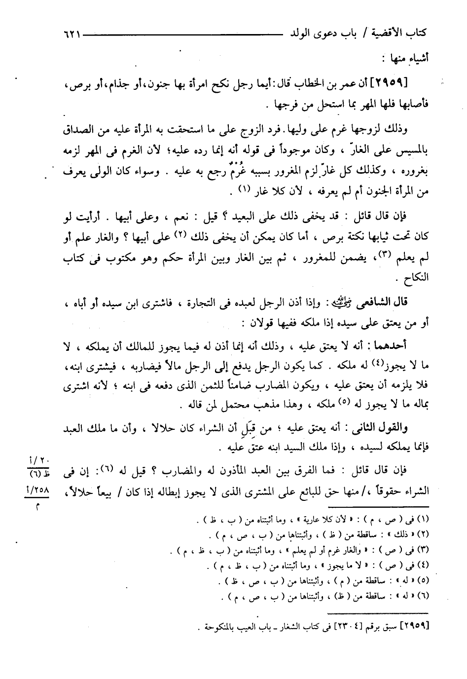 أَشْيَاءَ مِنْهَا أَنَّ عُمَرَ بْنَ الْخَطَّابِ رضي الله تعالى عنه قَالَ أَيُّمَا رَجُلٍ نَكَحَ امْرَأَةً بِهَا جُنُونٌ أَوْ جُذَامٌ أَوْ بَرَصٌ فَأَصَابَهَا فَلَهَا الْمَهْرُ بِمَا اسْتَحَلَّ مِنْ فَرْجِهَا , وَذَلِكَ لِزَوْجِهَا غُرْمٌ عَلَى وَلِيِّهَا فَرَدَّ الزَّوْجَ عَلَى مَا اسْتَحَقَّتْ بِهِ الْمَرْأَةُ عَلَيْهِ مِنْ الصَّدَاقِ بِالْمَسِيسِ عَلَى الْغَارِّ , وَكَانَ مَوْجُودًا فِي قَوْلِهِ إنَّهُ إنَّمَا رَدَّهُ عَلَيْهِ لِأَنَّ الْغُرْمَ فِي الْمَهْرِ لَزِمَهُ بِغُرُورِهِ , وَكَذَلِكَ كُلُّ غَارٍّ لَزِمَ الْمَغْرُورَ بِسَبَبِهِ غُرْمٌ رَجَعَ بِهِ عَلَيْهِ , وَسَوَاءٌ كَانَ الْوَلِيُّ يَعْرِفُ مِنْ الْمَرْأَةِ الْجُنُونَ أَمْ لَمْ يَعْرِفْهُ لِأَنَّ كُلًّا غَارٌّ . فَإِنْ قَالَ قَائِلٌ : قَدْ يَخْفَى ذَلِكَ عَلَى الْعَبْدِ ؟ قِيلَ نَعَمْ , وَعَلَى أَبِيهَا أَرَأَيْت لَوْ كَانَ تَحْتَ ثِيَابِهَا نُكْتَةُ بَرَصٍ أَمَا كَانَ يُمْكِنُ أَنْ يَخْفَى ذَلِكَ عَلَى أَبِيهَا , وَالْغَارُّ عَلِمَ أَوْ لَمْ يَعْلَمْ يَضْمَنْ لِلْمَغْرُورِ ثُمَّ بَيْنَ الْغَارِّ وَبَيْنَ الْمَرْأَةِ حُكْمٌ , وَهُوَ مَكْتُوبٌ فِي كِتَابِ النِّكَاحِ