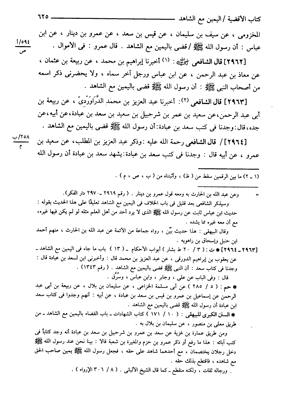 قَالَ الشَّافِعِيُّ : رحمه الله تعالى : أَخْبَرَنَا عَبْدُ الْعَزِيزِ بْنُ مُحَمَّدٍ الدَّرَاوَرْدِيُّ عَنْ رَبِيعَةَ بْنِ أَبِي عَبْدِ الرَّحْمَنِ عَنْ سَعِيدِ بْنِ عَمْرِو بْنِ شُرَحْبِيلَ بْنِ سَعِيدِ بْنِ سَعْدِ بْنِ عُبَادَةَ عَنْ أَبِيهِ عَنْ جَدِّهِ قَالَ وَجَدْنَا فِي كُتُبِ سَعْدِ بْنِ عُبَادَةَ : ? أَنَّ رَسُولَ اللَّهِ - صلى الله عليه وسلم - قَضَى بِالْيَمِينِ مَعَ الشَّاهِدِ ?