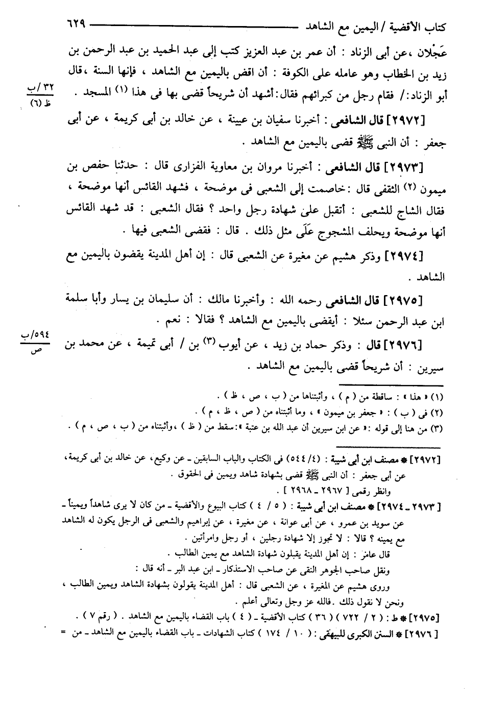 قَالَ الشَّافِعِيُّ : رحمه الله تعالى : أَخْبَرَنَا مَرْوَانُ بْنُ مُعَاوِيَةَ الْفَزَارِيّ قَالَ حَدَّثَنَا جَعْفَرُ بْنُ مَيْمُونٍ الثَّقَفِيُّ قَالَ خَاصَمْت إلَى الشَّعْبِيِّ فِي مُوضِحَةٍ فَشَهِدَ الْقَائِسُ أَنَّهَا مُوضِحَةٌ فَقَالَ الشَّاجُّ لِلشَّعْبِيِّ أَتَقْبَلُ عَلَيَّ شَهَادَةَ رَجُلٍ وَاحِدٍ ؟ فَقَالَ الشَّعْبِيُّ قَدْ شَهِدَ الْقَائِسُ أَنَّهَا مُوضِحَةٌ , وَيَحْلِفُ الْمَشْجُوجُ عَلَى مِثْلِ ذَلِكَ قَالَ فَقَضَى الشَّعْبِيُّ فِيهَا , وَذَكَرَ هُشَيْمٌ عَنْ مُغِيرَةَ عَنْ الشَّعْبِيِّ قَالَ إنَّ أَهْلَ الْمَدِينَةِ يَقْضُونَ بِالْيَمِينِ مَعَ الشَّاهِدِ .