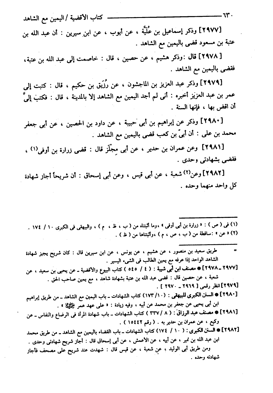 وَذَكَرَ إسْمَاعِيلُ ابْنُ عُلَيَّةَ عَنْ أَيُّوبَ عَنْ ابْنِ سِيرِينَ أَنَّ عَبْدَ اللَّهِ بْنَ عُتْبَةَ بْنِ مَسْعُودٍ قَضَى بِالْيَمِينِ مَعَ الشَّاهِدِ ( قَالَ ) وَذَكَرَ هُشَيْمٌ عَنْ حُصَيْنٍ قَالَ خَاصَمْت إلَى عَبْدِ اللَّهِ بْنِ عُتْبَةَ فَقَضَى بِالْيَمِينِ مَعَ الشَّاهِدِ , وَذَكَرَ عَبْدُ الْعَزِيزِ بْنُ الْمَاجِشُونِ عَنْ زُرَيْقِ بْنِ حَكِيمٍ قَالَ كَتَبْت إلَى عُمَرَ بْنِ عَبْدِ الْعَزِيزِ أُخْبِرُهُ أَنِّي لَمْ أَجِدْ الْيَمِينَ مَعَ الشَّاهِدِ إلَّا بِالْمَدِينَةِ قَالَ فَكَتَبَ إلَيَّ أَنْ اقْضِ بِهَا فَإِنَّهَا السُّنَّةُ , وَذُكِرَ عَنْ إبْرَاهِيمَ بْنِ أَبِي حَبِيبَةَ عَنْ دَاوُد بْنِ الْحُصَيْنِ عَنْ أَبِي جَعْفَرٍ مُحَمَّدِ بْنِ عَلِيٍّ أَنَّ أُبَيَّ بْنَ كَعْبٍ قَضَى بِالْيَمِينِ مَعَ الشَّاهِدِ . وَعَنْ عِمْرَانَ بْنِ حُدَيْرٍ عَنْ أَبِي مِجْلَزٍ قَالَ قَضَى زُرَارَةُ بْنُ أَوْفَى فَقَضَى بِشَهَادَتِي وَحْدِي , وَشُعْبَةَ عَنْ أَبِي قَيْسٍ , وَعَنْ أَبِي إِسْحَاقَ أَنَّ شُرَيْحًا أَجَازَ شَهَادَةَ كُلِّ وَاحِدٍ مِنْهُمَا وَحْدَهُ .@