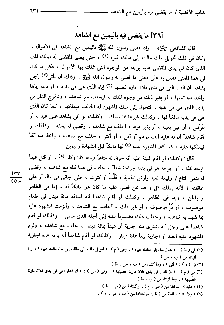 قَالَ الشَّافِعِيُّ : رحمه الله تعالى : وَإِذَا قَضَى رَسُولُ اللَّهِ - صلى الله عليه وسلم - بِالْيَمِينِ مَعَ الشَّاهِدِ فِي الْأَمْوَالِ , وَكَانَ فِي ذَلِكَ تَحْوِيلُ مِلْكِ مَالِكٍ إلَى مَالِكٍ غَيْرِهِ حَتَّى يَصِيرَ الْمَقْضِيُّ لَهُ يَمْلِكُ الْمَالَ الَّذِي كَانَ فِي يَدَيْ الْمَقْضِيِّ عَلَيْهِ بِوَجْهٍ مِنْ الْوُجُوهِ الَّتِي تُمْلَكُ بِهَا الْأَمْوَالُ فَكُلُّ مَا كَانَ فِي هَذَا الْمَعْنَى قُضِيَ بِهِ عَلَى مَعْنَى مَا قَضَى بِهِ رَسُولُ اللَّهِ - صلى الله عليه وسلم - وَذَلِكَ أَنْ يَأْتِيَ رَجُلٌ بِشَاهِدٍ أَنَّ الدَّارَ الَّتِي فِي يَدَيْ فُلاَنٍ دَارُهُ غَصَبَهَا إيَّاهُ الَّذِي هِيَ فِي يَدَيْهِ أَوْ بَاعَهُ إيَّاهَا , وَأَخَذَ مِنْهُ ثَمَنَهَا أَوْ بِغَيْرِ ذَلِكَ مِنْ وُجُوهِ الْمِلْكِ فَيَحْلِفُ مَعَ شَاهِدِهِ , وَتَخْرُجُ الدَّارُ مِنْ يَدَيْ الَّذِي هِيَ فِي يَدَيْهِ فَتَحُولُ إلَى مِلْكِ الْمَشْهُودِ الْحَالِفِ لَهُ فَيَمْلِكُهَا كَمَا كَانَ الَّذِي هِيَ فِي يَدَيْهِ مَالِكًا لَهَا , وَكَذَلِكَ غَيْرُهَا مِمَّا يُمْلَكُ , وَكَذَلِكَ لَوْ أَتَى بِشَاهِدٍ عَلَى عَبْدٍ أَوْ عَرَضٍ أَوْ عَيْنٍ بِعَيْنِهِ أَوْ بِغَيْرِ عَيْنِهِ أُحْلِفَ مَعَ شَاهِدِهِ , وَقُضِيَ لَهُ بِحَقِّهِ , وَكَذَلِكَ لَوْ أَقَامَ شَاهِدًا أَنَّ لَهُ عَلَيْهِ أَلْفَ دِرْهَمٍ أَوْ أَقَلَّ أَوْ أَكْثَرَ حَلَفَ مَعَ شَاهِدِهِ , وَأَخَذَ مِنْهُ أَلْفًا فَيَمْلِكُهَا عَلَيْهِ كَمَا كَانَ الْمَشْهُودُ عَلَيْهِ لَهَا مَالِكًا قَبْلَ الشَّهَادَةِ وَالْيَمِينِ