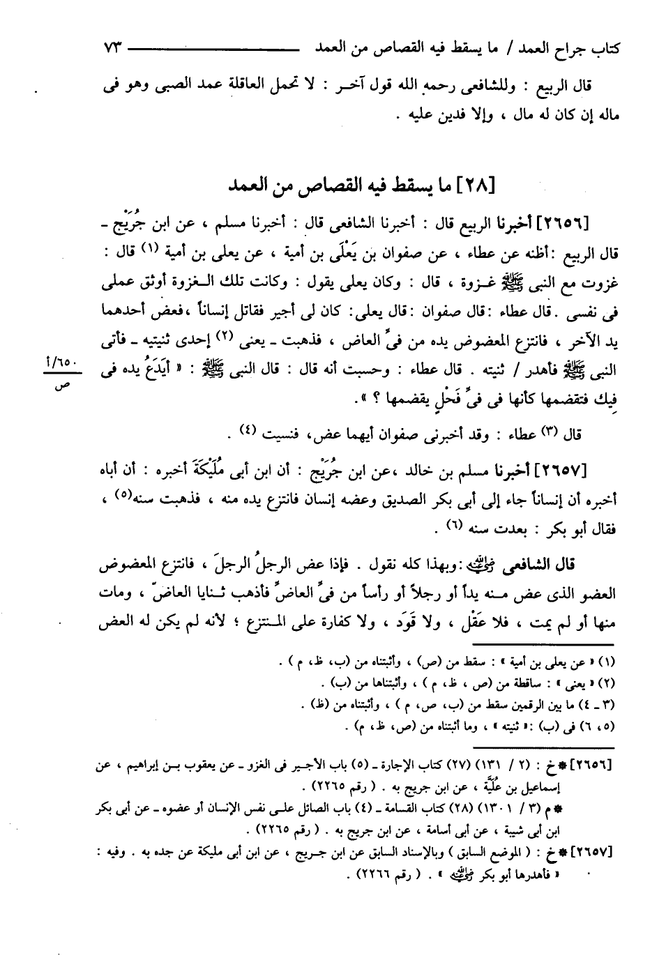 مَا يَسْقُطُ فِيهِ الْقِصَاصُ مِنْ الْعَمْدِ أَخْبَرَنَا الرَّبِيعُ قَالَ أَخْبَرَنَا الشَّافِعِيُّ قَالَ أَخْبَرَنَا مُسْلِمٌ عَنْ ابْنِ جُرَيْجٍ " قَالَ الرَّبِيعُ " أَظُنُّهُ عَنْ عَطَاءٍ عَنْ صَفْوَانَ بْنِ يَعْلَى بْنِ أُمَيَّةَ عَنْ يَعْلَى بْنِ أُمَيَّةَ قَالَ غَزَوْت مَعَ النَّبِيِّ - صلى الله عليه وسلم - غَزْوَةً قَالَ وَكَانَ يَعْلَى يَقُولُ وَكَانَتْ تِلْكَ الْغَزْوَةُ أَوْثَقَ عَمَلٍ فِي نَفْسِي قَالَ عَطَاءٌ قَالَ صَفْوَانُ : ? قَالَ يَعْلَى كَانَ لِي أَجِيرٌ فَقَاتَلَ إنْسَانًا فَعَضَّ أَحَدُهُمَا يَدَ الْآخَرِ فَانْتَزَعَ الْمَعْضُوضُ يَدَهُ مِنْ فِي الْعَاضِّ فَذَهَبَتْ يَعْنِي إحْدَى ثَنِيَّتَيْهِ فَأَتَى النَّبِيَّ - صلى الله عليه وسلم - فَأَهْدَرَ ثَنِيَّتَهُ ? قَالَ عَطَاءٌ وَحَسِبْت أَنَّهُ قَالَ : قَالَ النَّبِيُّ - صلى الله عليه وسلم - : ? أَيَدَعُ يَدَهُ فِي فِيكَ فَتَقْضِمُهَا كَأَنَّهَا فِي فِي فَحْلٍ يَقْضِمُهَا ؟ ? أَخْبَرَنَا مُسْلِمُ بْنُ خَالِدٍ عَنْ ابْنِ جُرَيْجٍ أَنَّ ابْنَ أَبِي مُلَيْكَةَ أَخْبَرَهُ أَنَّ أَبَاهُ أَخْبَرَهُ أَنَّ إنْسَانًا جَاءَ إلَى أَبِي بَكْرٍ الصِّدِّيقِ وَعَضَّهُ إنْسَانٌ فَانْتَزَعَ يَدَهُ مِنْهُ فَذَهَبَتْ ثَنِيَّتُهُ فَقَالَ أَبُو بَكْرٍ بَعُدَتْ ثَنِيَّتُهُ
