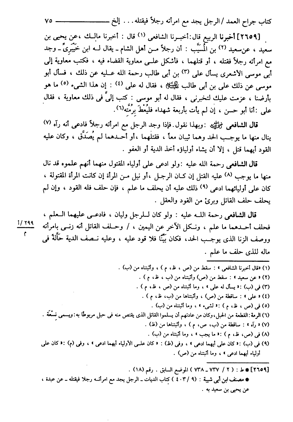 أَخْبَرَنَا الرَّبِيعُ قَالَ أَخْبَرَنَا الشَّافِعِيُّ قَالَ أَخْبَرَنَا مَالِكٌ عَنْ يَحْيَى بْنِ سَعِيدٍ عَنْ سَعِيدِ بْنِ الْمُسَيِّبِ أَنَّ رَجُلاً مِنْ أَهْلِ الشَّامِ يُقَالُ لَهُ ابْنُ خَيْبَرِيٍّ وَجَدَ مَعَ امْرَأَتِهِ رَجُلاً فَقَتَلَهُ , أَوْ قَتَلَهُمَا فَأَشْكَلَ عَلَى مُعَاوِيَةَ الْقَضَاءُ فِيهِ فَكَتَبَ مُعَاوِيَةُ إلَى أَبِي مُوسَى الْأَشْعَرِيِّ يَسْأَلُ لَهُ عَلِيَّ بْنَ أَبِي طَالِبٍ عَنْ ذَلِكَ فَسَأَلَ أَبُو مُوسَى عَنْ ذَلِكَ عَلِيَّ بْنَ أَبِي طَالِبٍ كَرَّمَ اللَّهُ وَجْهَهُ فَقَالَ لَهُ عَلِيٌّ إنَّ هَذَا الشَّيْءَ مَا هُوَ بِأَرْضِنَا عَزَمْت عَلَيْك لَتُخْبِرَنِّي فَقَالَ لَهُ أَبُو مُوسَى : كَتَبَ إلَيَّ فِي ذَلِكَ مُعَاوِيَةُ فَقَالَ عَلِيٌّ أَنَا أَبُو حَسَنٍ إنْ لَمْ يَأْتِ بِأَرْبَعَةِ شُهَدَاءَ فَلْيُعْطَ بِرُمَّتِهِ .