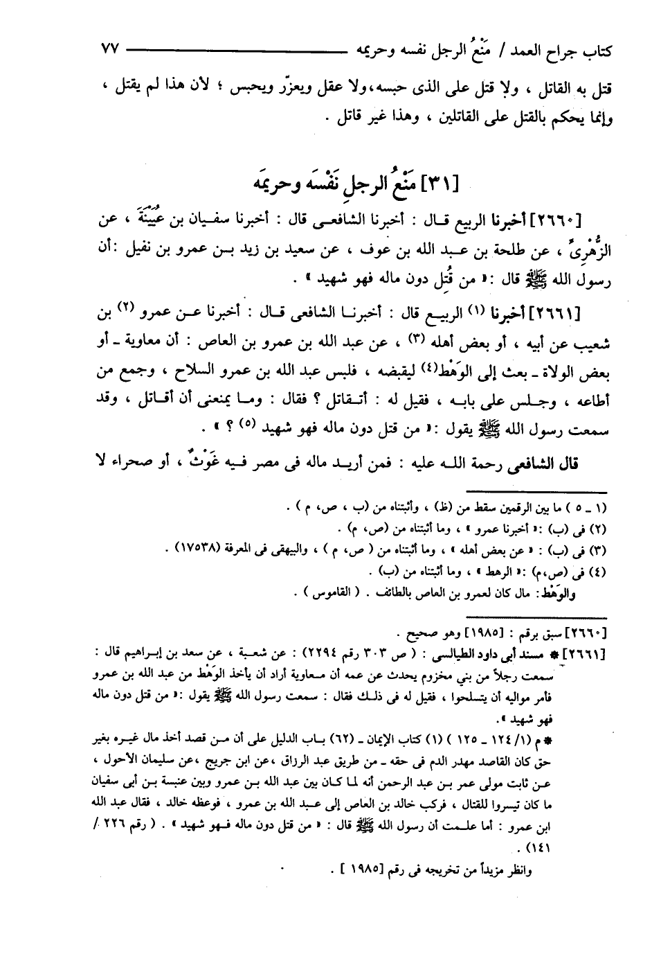 مَنْعُ الرَّجُلِ نَفْسَهُ وَحَرِيمَهُ أَخْبَرَنَا الرَّبِيعُ قَالَ أَخْبَرَنَا الشَّافِعِيُّ قَالَ أَخْبَرَنَا سُفْيَانُ بْنُ عُيَيْنَةَ عَنْ الزُّهْرِيِّ عَنْ طَلْحَةَ بْنِ عَبْدِ اللَّهِ بْنِ عَوْفٍ عَنْ سَعِيدِ بْنِ زَيْدِ بْنِ عَمْرِو بْنِ نُفَيْلٍ أَنَّ رَسُولَ اللَّهِ - صلى الله عليه وسلم - قَالَ : ? مَنْ قُتِلَ دُونَ مَالِهِ فَهُوَ شَهِيدٌ ? أَخْبَرَنَا الرَّبِيعُ قَالَ أَخْبَرَنَا الشَّافِعِيُّ قَالَ أَخْبَرَنَا عَمْرُو بْنُ شُعَيْبٍ عَنْ أَبِيهِ عَنْ بَعْضِ أَهْلِهِ عَنْ عَبْدِ اللَّهِ بْنِ عَمْرِو بْنِ الْعَاصِ أَنَّ مُعَاوِيَةَ أَوْ بَعْضَ الْوُلاَةِ بَعَثَ إلَى الْوَهْطِ لِيَقْبِضَهُ فَلَبِسَ عَبْدُ اللَّهِ بْنُ عَمْرٍو السِّلاَحَ وَجَمَعَ مَنْ أَطَاعَهُ وَجَلَسَ عَلَى بَابِهِ فَقِيلَ لَهُ : أَتُقَاتِلُ ؟ فَقَالَ وَمَا يَمْنَعُنِي أَنْ أُقَاتِلَ وَقَدْ سَمِعْت رَسُولَ اللَّهِ - صلى الله عليه وسلم - يَقُولُ : ? مَنْ قُتِلَ دُونَ مَالِهِ فَهُوَ شَهِيدٌ ؟ ?