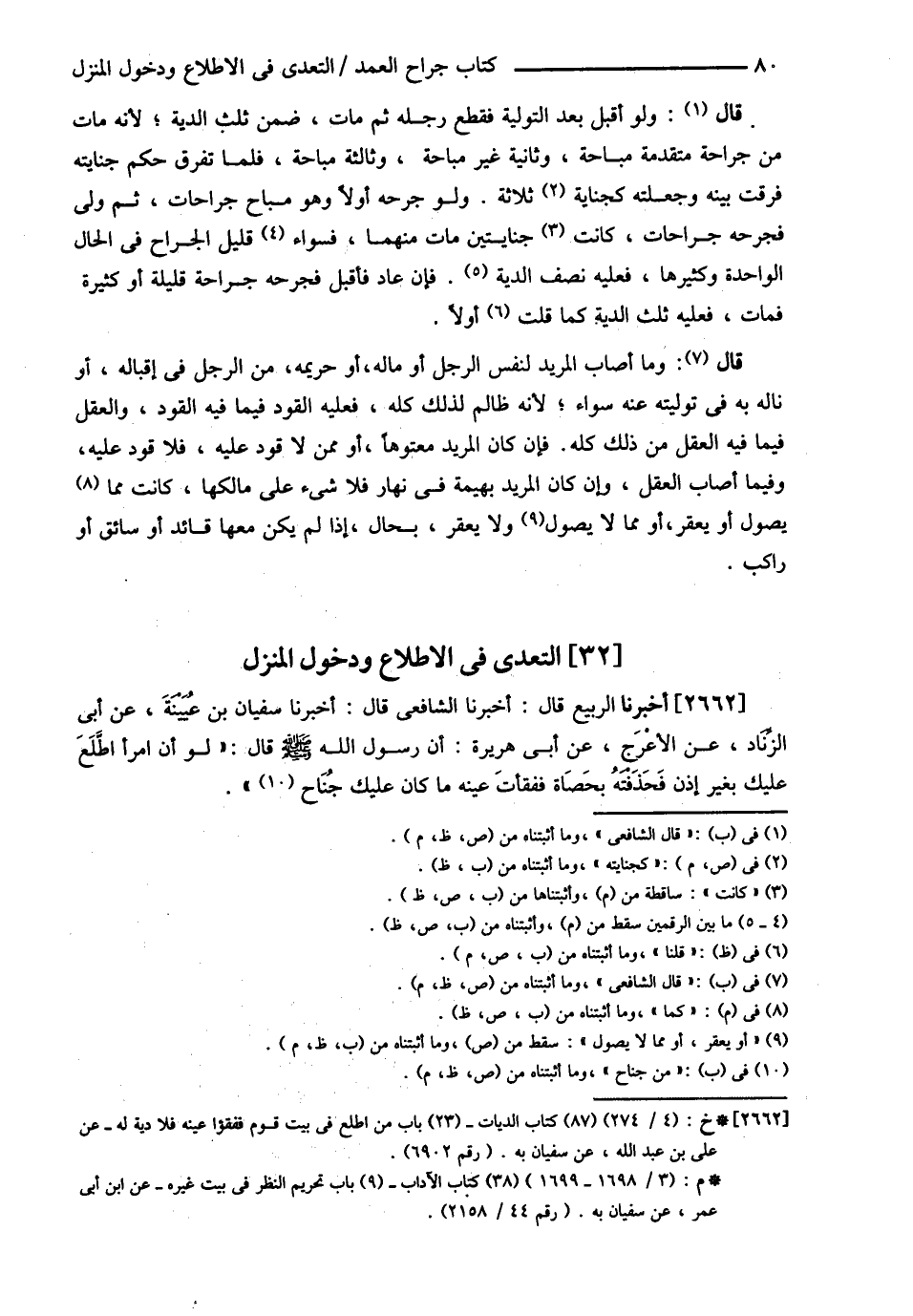 ... التَّعَدِّي فِي الِاطِّلاَع وَدُخُولِ الْمَنْزِلِ أَخْبَرَنَا الرَّبِيعُ قَالَ أَخْبَرَنَا الشَّافِعِيُّ قَالَ أَخْبَرَنَا سُفْيَانُ بْنُ عُيَيْنَةَ عَنْ أَبِي الزِّنَادِ عَنْ الْأَعْرَجِ عَنْ أَبِي هُرَيْرَةَ أَنَّ رَسُولَ اللَّهِ - صلى الله عليه وسلم - قَالَ : ? لَوْ أَنَّ امْرَأً اطَّلَعَ عَلَيْكَ بِغَيْرِ إذْنٍ فَخَذَفْتَهُ بِحَصَاةٍ فَفَقَأَتْ عَيْنَهُ مَا كَانَ عَلَيْكَ جُنَاحٍ ?@