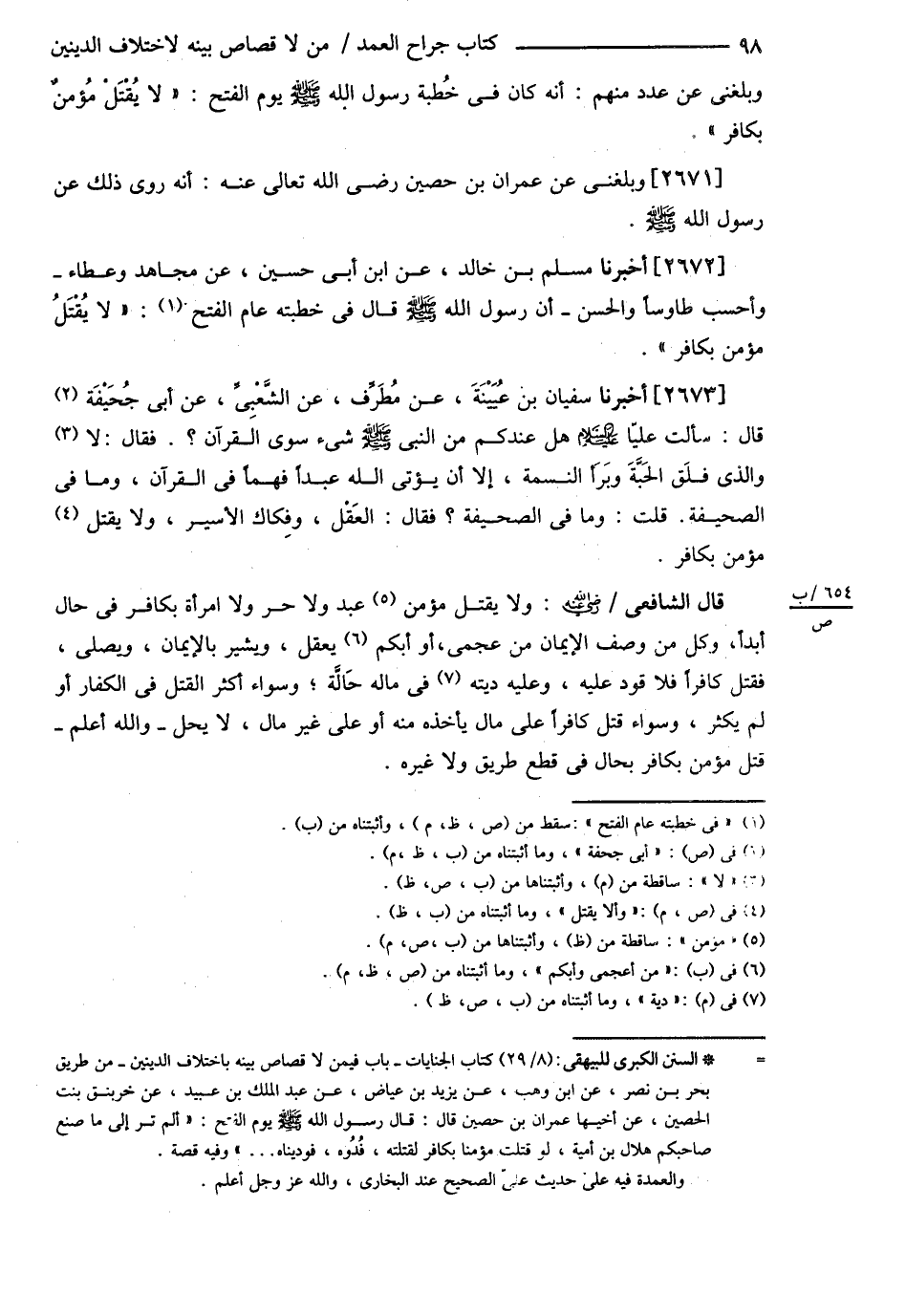 وَبَلَغَنِي عَنْ عَدَدٍ مِنْهُمْ أَنَّهُ كَانَ فِي خُطْبَةِ رَسُولِ اللَّهِ - صلى الله عليه وسلم - يَوْمَ الْفَتْحِ : ? لاَ يُقْتَلُ مُؤْمِنٌ بِكَافِرٍ ? وَبَلَغَنِي عَنْ عِمْرَانَ بْنِ حُصَيْنٍ رضي الله تعالى عنه أَنَّهُ رَوَى ذَلِكَ عَنْ رَسُولِ اللَّهِ - صلى الله عليه وسلم - أَخْبَرَنَا مُسْلِمُ بْنُ خَالِدٍ عَنْ ابْنِ أَبِي حُسَيْنٍ عَنْ مُجَاهِدٍ وَعَطَاءٍ وَأَحْسِبُ طَاوُسًا وَالْحَسَنَ أَنَّ رَسُولَ اللَّهِ - صلى الله عليه وسلم - قَالَ فِي خُطْبَتِهِ عَامَ الْفَتْحِ : ? لاَ يُقْتَلُ مُؤْمِنٌ بِكَافِرٍ ? أَخْبَرَنَا سُفْيَانُ بْنُ عُيَيْنَةَ عَنْ مُطَرِّفٍ عَنْ الشَّعْبِيِّ عَنْ أَبِي جُحَيْفَةَ قَالَ سَأَلْت عَلِيًّا رضي الله عنه هَلْ عِنْدَكُمْ مِنْ النَّبِيِّ - صلى الله عليه وسلم - شَيْءٌ سِوَى الْقُرْآنِ ؟ فَقَالَ لاَ وَاَلَّذِي فَلَقَ الْحَبَّةَ وَبَرَأَ النَّسَمَةَ , إلَّا أَنْ يُؤْتِيَ اللَّهُ عَبْدًا فَهْمًا فِي الْقُرْآنِ وَمَا فِي الصَّحِيفَةِ قُلْت وَمَا فِي الصَّحِيفَةِ ؟ فَقَالَ : ? الْعَقْلُ وَفِكَاكُ الْأَسِيرِ وَلاَ يُقْتَلُ مُؤْمِنٌ بِكَافِرٍ ? .