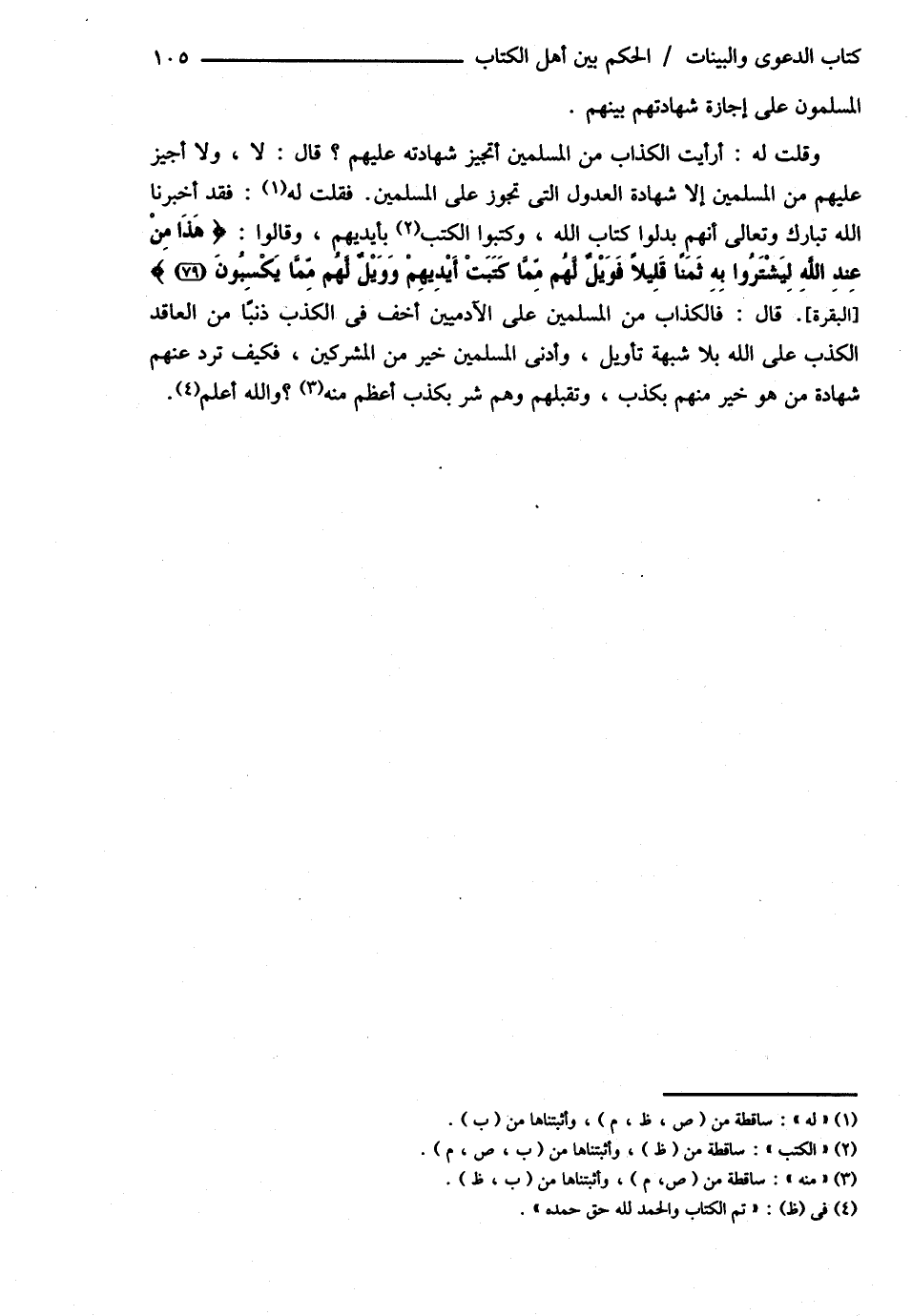 الْمُسْلِمُونَ عَلَى إجَازَةِ شَهَادَتِهِمْ بَيْنَهُمْ وَقُلْت لَهُ أَرَأَيْت الْكَذَّابَ مِنْ الْمُسْلِمِينَ أَتُجِيزُ شَهَادَتَهُ عَلَيْهِمْ؟ قَالَ لاَ وَلاَ أُجِيزُ عَلَيْهِمْ مِنْ الْمُسْلِمِينَ إلَّا شَهَادَةَ الْعُدُولِ الَّتِي تَجُوزُ عَلَى الْمُسْلِمِينَ فَقُلْت لَهُ فَقَدْ أَخْبَرَنَا اللَّهُ تَبَارَكَ وَتَعَالَى أَنَّهُمْ بَدَّلُوا كِتَابَ اللَّهِ وَكَتَبُوا الْكُتُبَ بِأَيْدِيهِمْ وَقَالُوا: ? هَذَا مِنْ عِنْدِ اللَّهِ لِيَشْتَرُوا بِهِ ثَمَنًا قَلِيلاً فَوَيْلٌ لَهُمْ مِمَّا كَتَبَتْ أَيْدِيهمْ وَوَيْلٌ لَهُمْ مِمَّا يَكْسِبُونَ ? قَالَ فَالْكَذَّابُ مِنْ الْمُسْلِمِينَ عَلَى الْآدَمِيِّينَ أَخَفُّ فِي الْكَذِبِ ذَنْبًا مِنْ الْعَاقِدِ الْكَذِبَ عَلَى اللَّهِ بِلاَ شُبْهَةِ تَأْوِيلٍ وَأَدْنَى الْمُسْلِمِينَ خَيْرٌ مِنْ الْمُشْرِكِينَ فَكَيْفَ تَرُدُّ عَنْهُمْ شَهَادَةَ مَنْ هُوَ خَيْرٌ مِنْهُمْ بِكَذِبٍ وَتَقْبَلُهُمْ وَهُمْ شَرٌّ بِكَذِبٍ أَعْظَمَ مِنْهُ؟ وَاَللَّهُ أَعْلَمُ.@