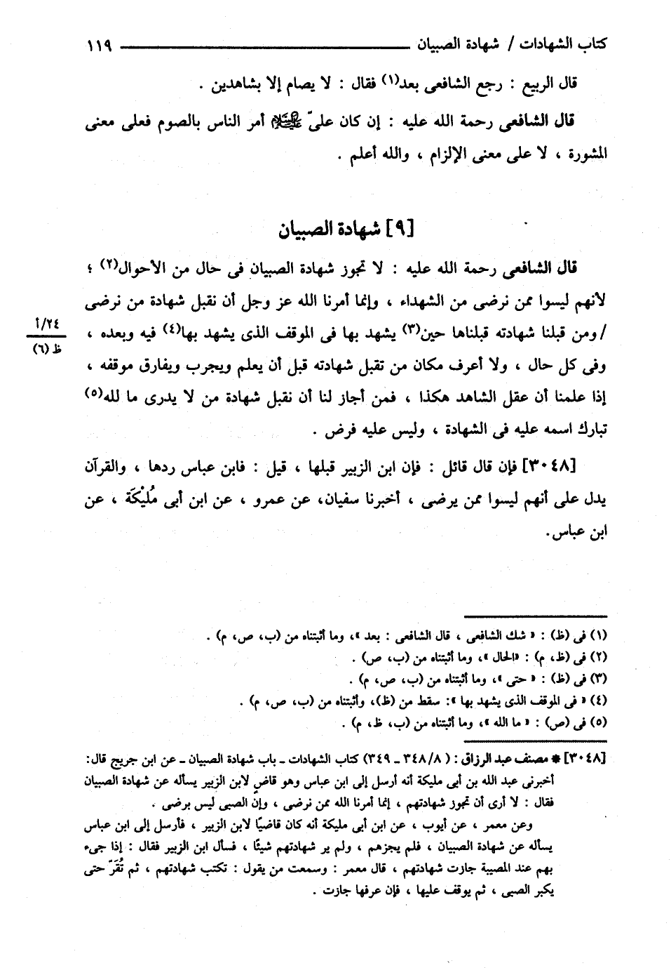 قَالَ الشَّافِعِيُّ : رحمه الله تعالى لاَ تَجُوزُ شَهَادَةُ الصِّبْيَانِ فِي حَالٍ مِنْ الْأَحْوَالِ ; لِأَنَّهُمْ لَيْسُوا مِمَّنْ نَرْضَى مِنْ الشُّهَدَاءِ وَإِنَّمَا أَمَرَنَا اللَّهُ عَزَّ وَجَلَّ أَنْ نَقْبَلَ شَهَادَةَ مَنْ نَرْضَى وَمَنْ قَبِلْنَا شَهَادَتَهُ قَبِلْنَاهَا حِينَ يَشْهَدُ بِهَا فِي الْمَوْقِفِ الَّذِي يَشْهَدُ بِهَا فِيهِ وَبَعْدَهُ وَفِي كُلِّ حَالٍ وَلاَ أَعْرِفُ مَكَانَ مَنْ تُقْبَلُ شَهَادَتُهُ قَبْلَ أَنْ يَعْلَمَ وَيُجَرِّبَ وَيُفَارِقَ مَوْقِفَهُ إذَا عَلِمْنَا أَنَّ عَقْلَ الشَّاهِدِ هَكَذَا , فَمَنْ أَجَازَ لَنَا أَنْ نَقْبَلَ شَهَادَةَ مَنْ لاَ يَدْرِي مَا لِلَّهِ - تَبَارَكَ وَتَعَالَى اسْمُهُ - عَلَيْهِ فِي الشَّهَادَةِ وَلَيْسَ عَلَيْهِ فَرْضٌ : فَإِنْ قَالَ قَائِلٌ فَإِنَّ ابْنَ الزُّبَيْرِ قَبِلَهَا قِيلَ : فَابْنُ عَبَّاسٍ رَدَّهَا , وَالْقُرْآنُ يَدُلُّ عَلَى أَنَّهُمْ لَيْسُوا مِمَّنْ يُرْضَى أَخْبَرَنَا سُفْيَانُ عَنْ عُمَرَ , وَعَنْ ابْنِ أَبِي مُلَيْكَةَ عَنْ ابْنِ عَبَّاسٍ .@