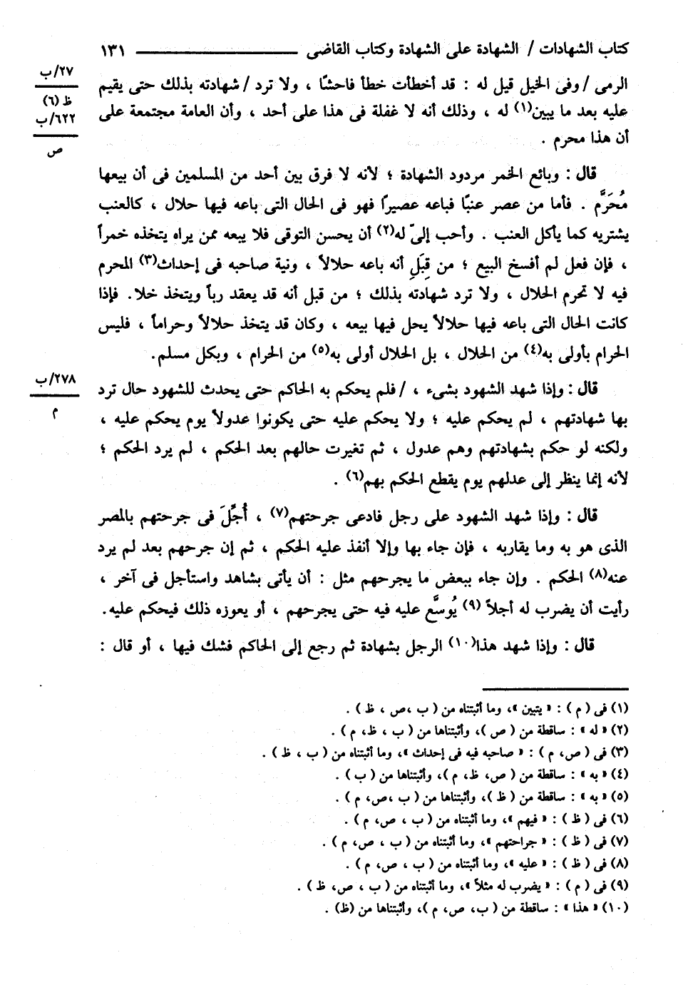 الرَّمْيِ وَفِي الْخَيْلِ قِيلَ لَهُ قَدْ أَخْطَأْت خَطَأً فَاحِشًا وَلاَ تُرَدُّ شَهَادَتُهُ بِذَلِكَ حَتَّى يُقِيمَ عَلَيْهِ بَعْدَمَا يُبَيَّنُ لَهُ , وَذَلِكَ أَنَّهُ لاَ غَفْلَةَ فِي هَذَا عَلَى أَحَدٍ وَأَنَّ الْعَامَّةَ مُجْتَمِعَةٌ عَلَى أَنَّ هَذَا مُحَرَّمٌ قَالَ وَبَائِعُ الْخَمْرِ مَرْدُودُ الشَّهَادَةِ لِأَنَّهُ لاَ فَرْقَ بَيْنَ أَحَدٍ مِنْ الْمُسْلِمِينَ فِي أَنَّ بَيْعَهَا مُحَرَّمٌ , فَأَمَّا مَنْ عَصَرَ عِنَبًا فَبَاعَهُ عَصِيرًا فَهُوَ فِي الْحَالِ الَّتِي بَاعَهُ فِيهَا حَلاَلٌ كَالْعِنَبِ يَشْتَرِيهِ كَمَا يَأْكُلُ الْعِنَبَ وَأَحَبُّ إلَيَّ لَهُ أَنْ يُحْسِنَ التَّوَقِّيَ فَلاَ يَبِيعَهُ مِمَّنْ يَرَاهُ يَتَّخِذُهُ خَمْرًا فَإِنْ فَعَلَ لَمْ أَفْسَخْ الْبَيْعَ مِنْ قِبَلِ أَنَّهُ بَاعَهُ حَلاَلاً وَنِيَّةُ صَاحِبِهِ فِي إحْدَاثِ الْمُحَرَّمِ فِيهِ لاَ تُحَرِّمُ الْحَلاَلَ وَلاَ تُرَدُّ شَهَادَتُهُ بِذَلِكَ مِنْ قِبَلِ أَنَّهُ قَدْ يَعْقِدُ رُبًّا وَيَتَّخِذُ خَلًّا فَإِذَا كَانَتْ الْحَالُ الَّتِي بَاعَهُ فِيهَا حَلاَلاً يَحِلُّ فِيهَا بَيْعُهُ , وَكَانَ قَدْ يُتَّخَذُ حَلاَلاً وَحَرَامًا فَلَيْسَ الْحَرَامُ بِأَوْلَى بِهِ مِنْ الْحَلاَلِ , بَلْ الْحَلاَلُ أَوْلَى بِهِ مِنْ الْحَرَامِ وَبِكُلِّ مُسْلِمٍ ( قَالَ ) : , وَإِذَا شَهِدَ الشُّهُودُ بِشَيْءٍ فَلَمْ يَحْكُمْ بِهِ الْحَاكِمُ حَتَّى يَحْدُثَ لِلشُّهُودِ حَالٌ تُرَدُّ بِهَا شَهَادَتُهُمْ لَمْ يَحْكُمْ عَلَيْهِ , وَلاَ يَحْكُمُ عَلَيْهِ حَتَّى يَكُونُوا عُدُولاً يَوْمَ يَحْكُمُ عَلَيْهِ وَلَكِنَّهُ لَوْ حَكَمَ بِشَهَادَتِهِمْ وَهُمْ عُدُولٌ , ثُمَّ تَغَيَّرَتْ حَالُهُمْ بَعْدَ الْحُكْمِ لَمْ يَرُدَّ الْحُكْمَ ; لِأَنَّهُ إنَّمَا يَنْظُرُ إلَى عَدْلِهِمْ يَوْمَ يَقْطَعُ الْحُكْمَ بِهِمْ