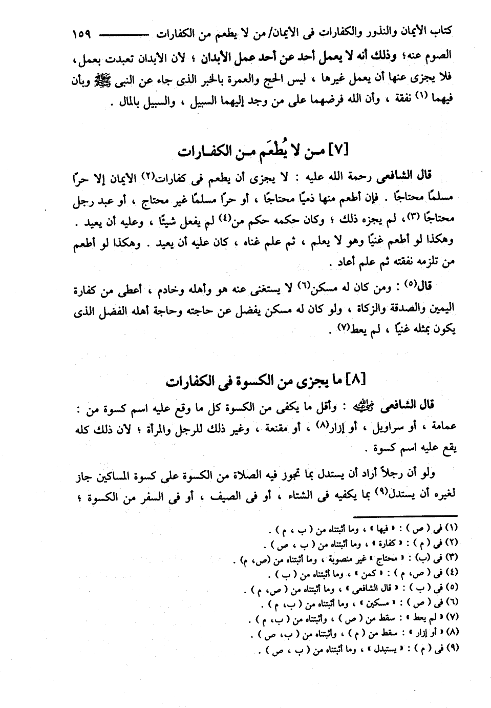 قَالَ الشَّافِعِيُّ : رحمه الله تعالى : لاَ يُجْزِئُ أَنْ يُطْعِمَ فِي كَفَّارَاتِ الْأَيْمَانِ إلَّا حُرًّا مُسْلِمًا مُحْتَاجًا فَإِنْ أَطْعَمَ مِنْهَا ذِمِّيًّا مُحْتَاجًا , أَوْ حُرًّا مُسْلِمًا غَيْرَ مُحْتَاجٍ أَوْ عَبْدَ رَجُلٍ مُحْتَاجٍ لَمْ يَجْزِهِ ذَلِكَ , وَكَانَ حُكْمُهُ حُكْمَ مَنْ لَمْ يَفْعَلْ شَيْئًا وَعَلَيْهِ أَنْ يُعِيدَ وَهَكَذَا لَوْ أَطْعَمَ غَنِيًّا وَهُوَ لاَ يَعْلَمُ , ثُمَّ عَلِمَ غِنَاهُ كَانَ عَلَيْهِ أَنْ يُعِيدَ , وَهَكَذَا لَوْ أَطْعَمَ مَنْ تَلْزَمُهُ نَفَقَتُهُ , ثُمَّ عَلِمَ أَعَادَ