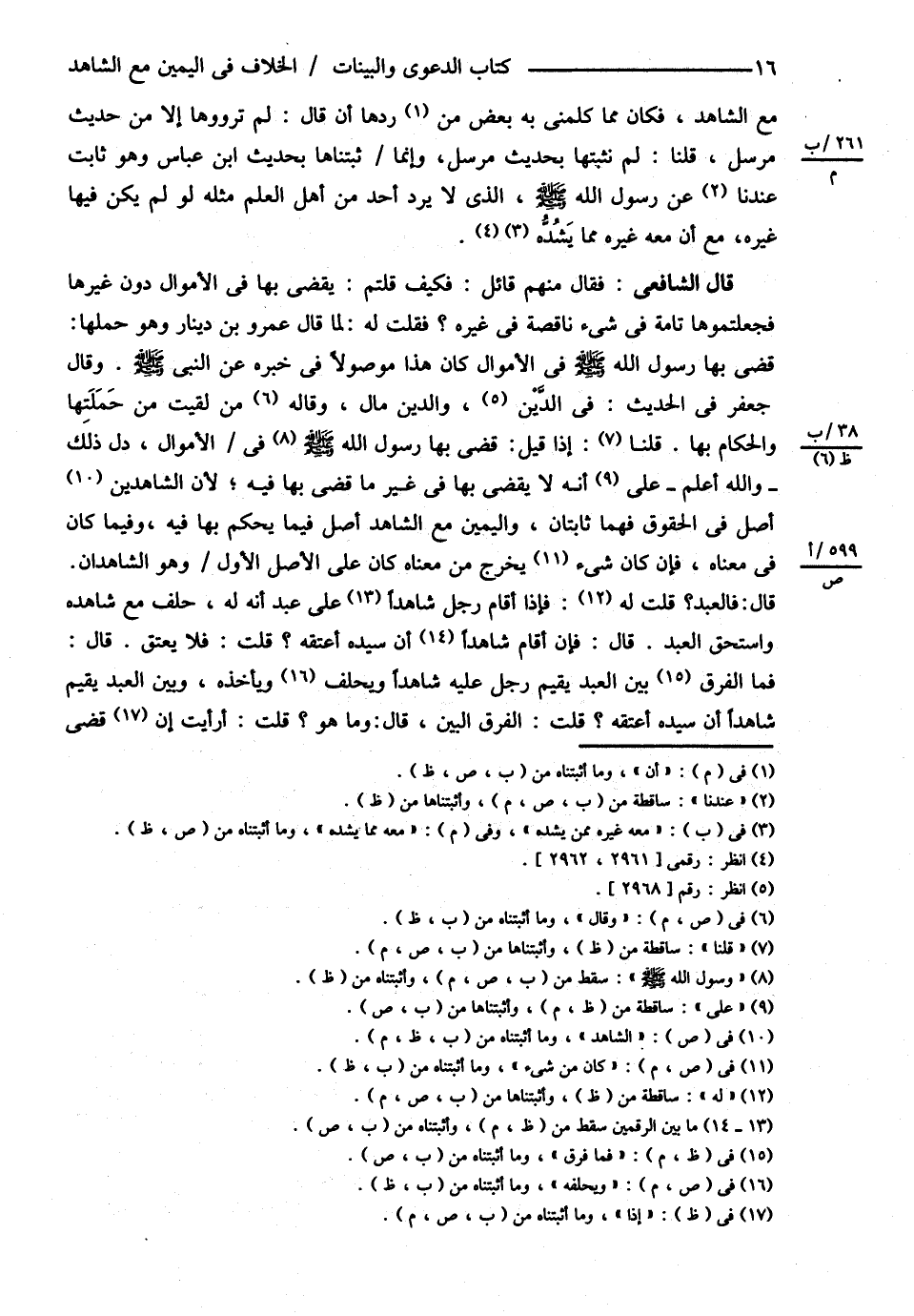 قَالَ الشَّافِعِيُّ : رحمه الله تعالى : فَقَالَ مِنْهُمْ قَائِلٌ فَكَيْفَ قُلْتُمْ يُقْضَى بِهَا فِي الْأَمْوَالِ دُونَ غَيْرِهَا فَجَعَلْتُمُوهَا تَامَّةً فِي شَيْءٍ نَاقِصَةً فِي غَيْرِهِ ؟ فَقُلْت لَهُ لِمَا قَالَ عَمْرُو بْنُ دِينَارٍ وَهُوَ حَمَلَهَا قَضَى بِهَا رَسُولُ اللَّهِ - صلى الله عليه وسلم - فِي الْأَمْوَالِ كَانَ هَذَا مَوْصُولاً فِي خَبَرِهِ عَنْ النَّبِيِّ - صلى الله عليه وسلم - . وَقَالَ جَعْفَرٌ فِي الْحَدِيثِ فِي الدَّيْنِ وَالدَّيْنُ مَالٌ وَقَالَهُ مَنْ لَقِيت مِنْ حَمَلَتِهَا , وَالْحُكَّامِ بِهَا قُلْنَا إذَا قِيلَ : بِهَا فِي الْأَمْوَالِ دَلَّ ذَلِكَ وَاَللَّهُ تَعَالَى أَعْلَمُ عَلَى أَنَّهُ لاَ يُقْضَى بِهَا فِي غَيْرِ مَا قُضِيَ بِهَا فِيهِ ; لِأَنَّ الشَّاهِدَيْنِ أَصْلٌ فِي الْحُقُوقِ فَهُمَا ثَابِتَانِ , وَالْيَمِينُ مَعَ الشَّاهِدِ أَصْلٌ فِيمَا يُحْكَمُ بِهَا فِيهِ وَفِيمَا كَانَ فِي مَعْنَاهُ فَإِنْ كَانَ شَيْءٌ يَخْرُجُ مِنْ مَعْنَاهُ كَانَ عَلَى الْأَصْلِ الْأَوَّلِ وَهُوَ الشَّاهِدَانِ قَالَ فَالْعَبْدُ ؟ قُلْت : لَهُ فَإِذَا أَقَامَ رَجُلٌ شَاهِدًا عَلَى عَبْدٍ أَنَّهُ لَهُ حَلَفَ مَعَ شَاهِدِهِ وَاسْتَحَقَّ الْعَبْدَ , قَالَ فَإِنْ أَقَامَ شَاهِدًا أَنَّ سَيِّدَهُ أَعْتَقَهُ ؟ قُلْت فَلاَ يُعْتَقُ . قَالَ فَمَا الْفَرْقُ بَيْنَ الْعَبْدِ يُقِيمُ رَجُلٌ عَلَيْهِ شَاهِدًا وَيَحْلِفُ وَيَأْخُذُهُ وَبَيْنَ الْعَبْدِ يُقِيمُ شَاهِدًا أَنَّ سَيِّدَهُ أَعْتَقَهُ ؟ قُلْت الْفَرْقُ الْبَيِّنُ , قَالَ وَمَا هُوَ ؟ قُلْت أَرَأَيْت إنْ : ? قَضَى @