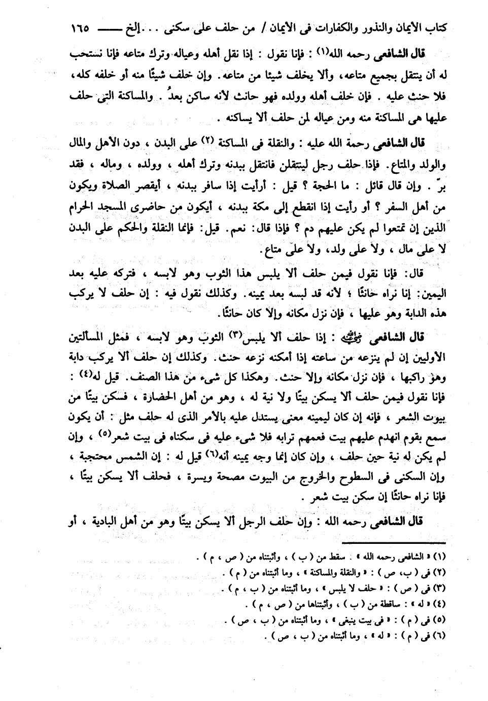 قَالَ الشَّافِعِيُّ : رحمه الله تعالى وَالنُّقْلَةُ , وَالْمُسَاكَنَةُ عَلَى الْبَدَنِ دُونَ الْأَهْلِ , وَالْمَالِ , وَالْوَلَدِ , وَالْمَتَاعِ فَإِذَا حَلَفَ رَجُلٌ لَيَنْتَقِلَنَّ فَانْتَقَلَ بِبَدَنِهِ وَتَرَكَ أَهْلَهُ وَوَلَدَهُ وَمَالَهُ فَقَدْ بَرَّ , وَإِنْ قَالَ قَائِلٌ مَا الْحُجَّةُ ؟ قِيلَ أَرَأَيْت إذَا سَافَرَ بِبَدَنِهِ أَيَقْصُرُ الصَّلاَةَ وَيَكُونُ مِنْ أَهْلِ السَّفَرِ , أَوْ رَأَيْت إذَا انْقَطَعَ إلَى مَكَّةَ بِبَدَنِهِ أَيَكُونُ مِنْ حَاضِرِي الْمَسْجِدِ الْحَرَامِ الَّذِينَ إنْ تَمَتَّعُوا لَمْ يَكُنْ عَلَيْهِمْ دَمٌ ؟ فَإِذَا قَالَ : نَعَمْ قِيلَ فَإِنَّمَا النُّقْلَةُ , وَالْحُكْمُ عَلَى الْبَدَنِ لاَ عَلَى مَالٍ وَلاَ عَلَى وَلَدٍ وَلاَ عَلَى مَتَاعٍ قَالَ : فَإِنَّا نَقُولُ فِيمَنْ حَلَفَ أَنْ لاَ يَلْبَسَ هَذَا الثَّوْبَ وَهُوَ لاَبِسُهُ فَتَرَكَهُ عَلَيْهِ بَعْدَ الْيَمِينِ أَنَّا نَرَاهُ حَانِثًا لِأَنَّهُ قَدْ لَبِسَهُ بَعْدَ يَمِينِهِ , وَكَذَلِكَ نَقُولُ فِيهِ إنْ حَلَفَ لاَ يَرْكَبُ هَذِهِ الدَّابَّةَ وَهُوَ عَلَيْهَا فَإِنْ نَزَلَ مَكَانَهُ وَإِلَّا كَانَ حَانِثًا